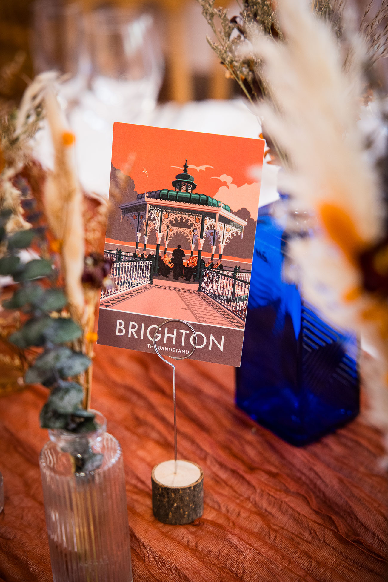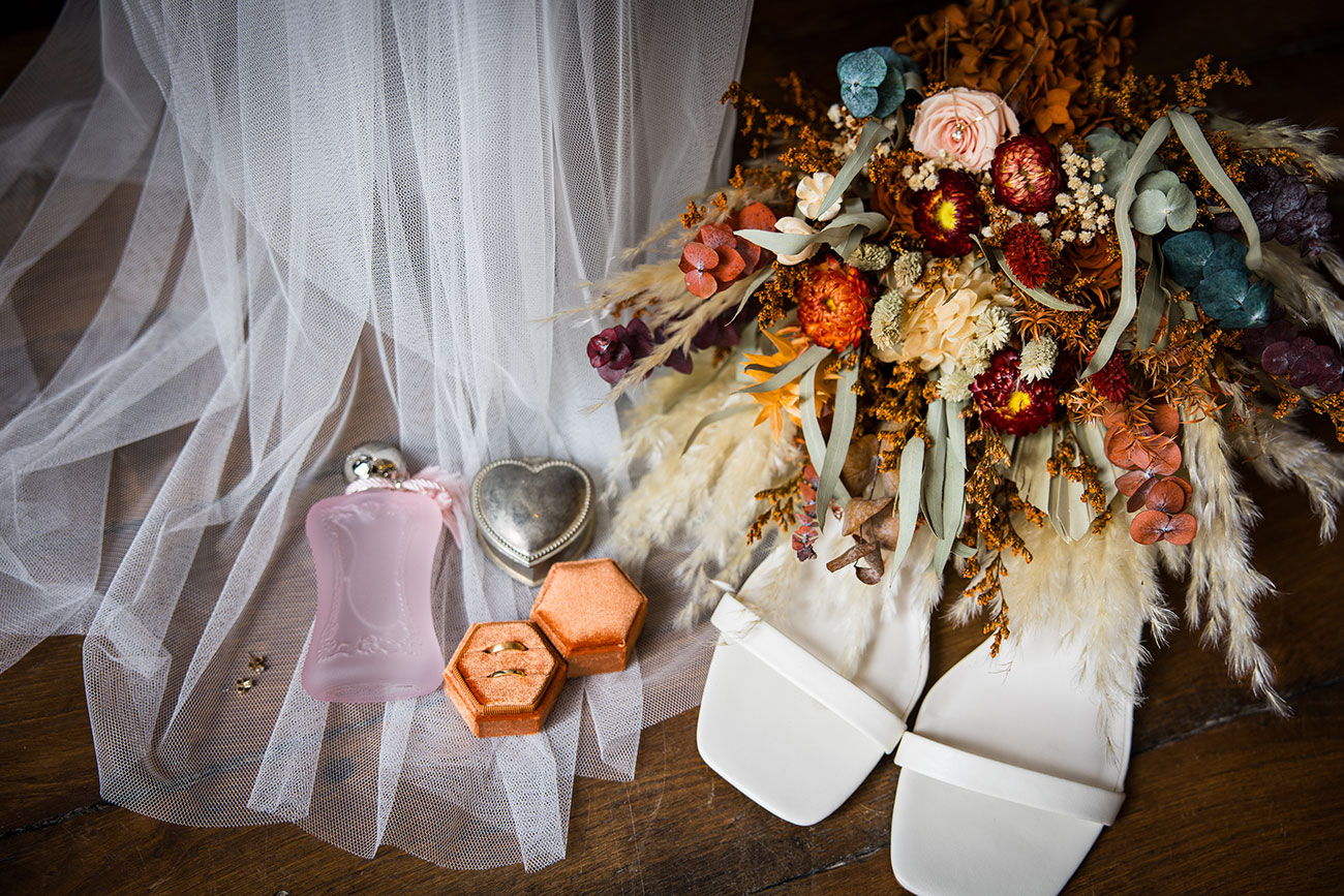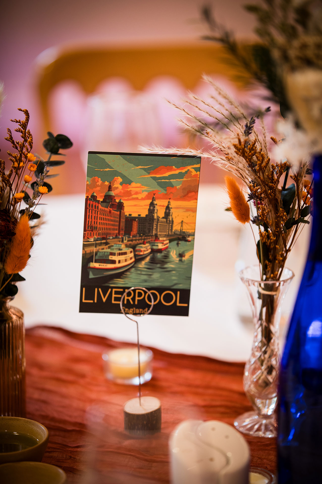 Burnt orange was always destined to lead the colour palette. Paired with deep blue, it created a bold yet romantic aesthetic woven through bridesmaids’ satin dresses, table runners, dried flower bouquets and arrangements spilling from wine bottles and mismatched vases sourced from charity and vintage shops. “Even though it was spring, we went for an autumnal theme with dried flowers,” says Elli.