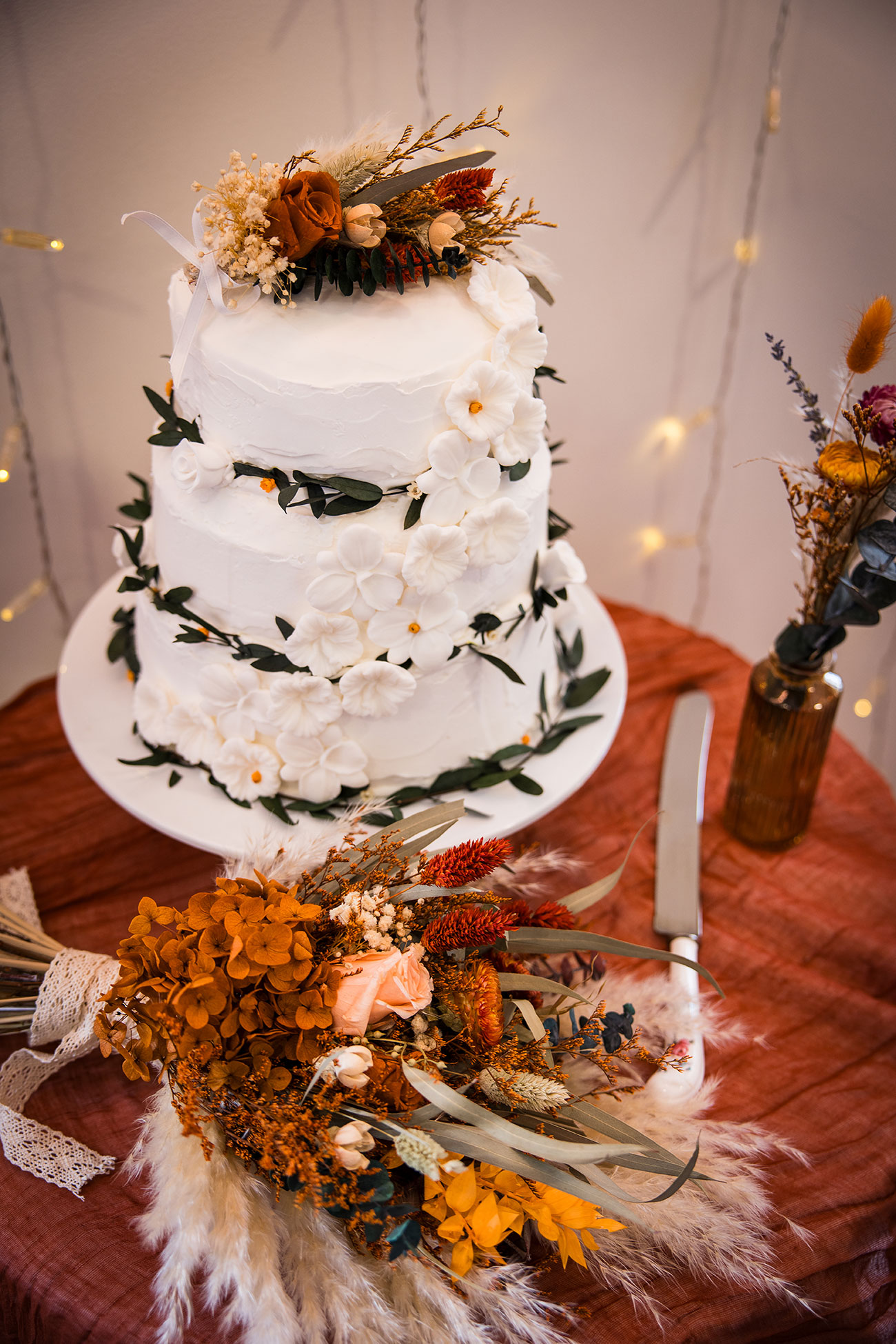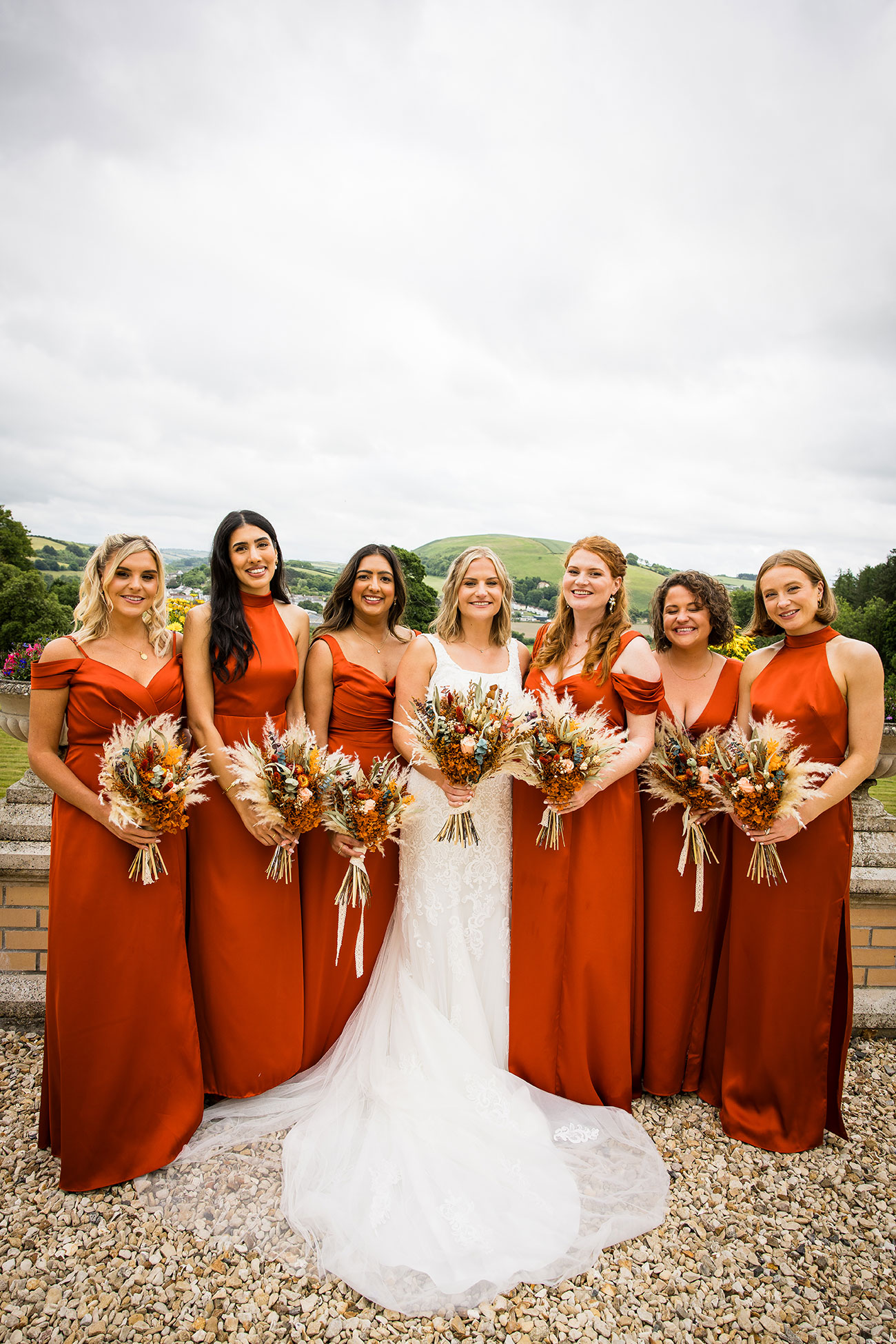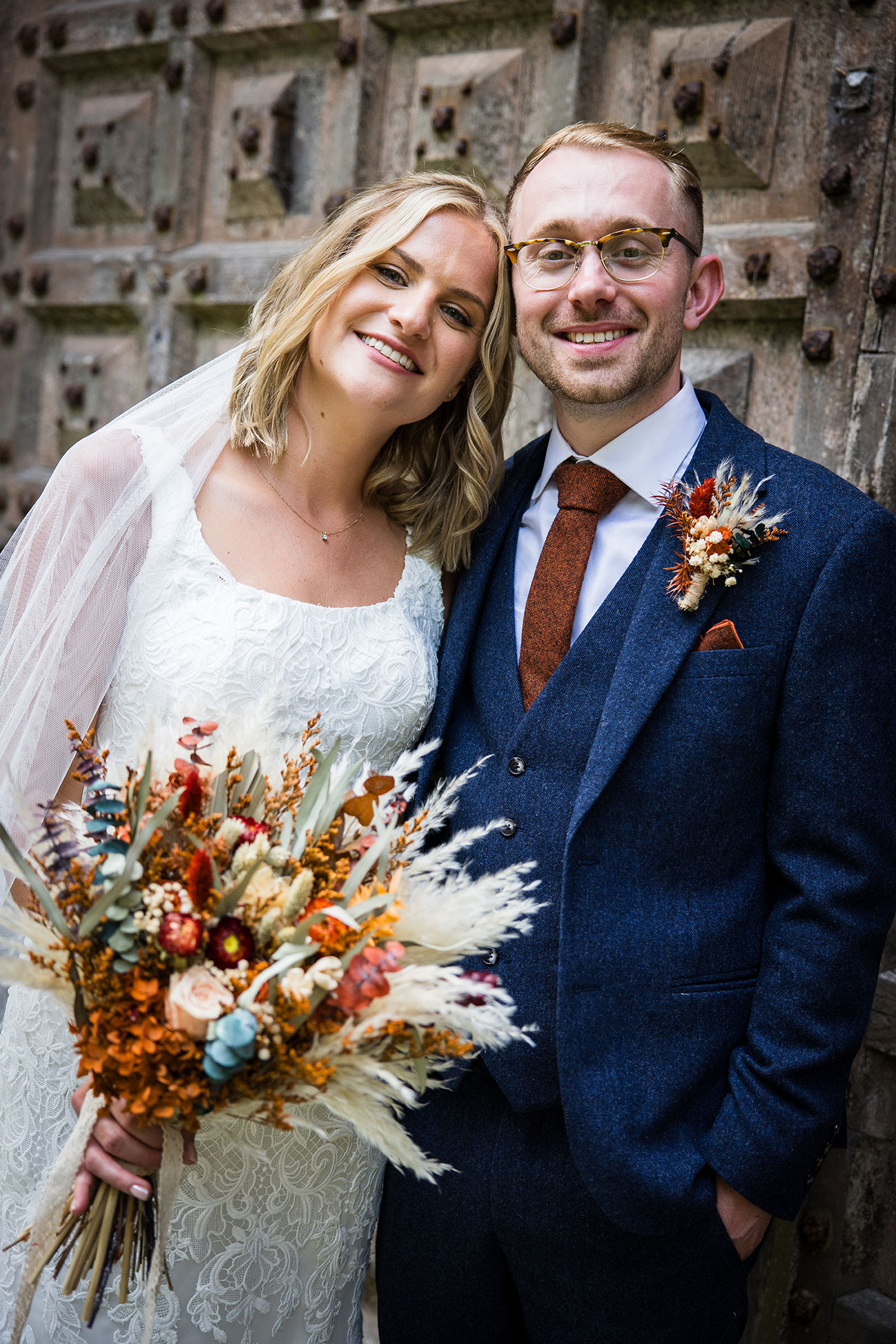 Burnt orange was always destined to lead the colour palette. Paired with deep blue, it created a bold yet romantic aesthetic woven through bridesmaids’ satin dresses, table runners, dried flower bouquets and arrangements spilling from wine bottles and mismatched vases sourced from charity and vintage shops. “Even though it was spring, we went for an autumnal theme with dried flowers,” says Elli.