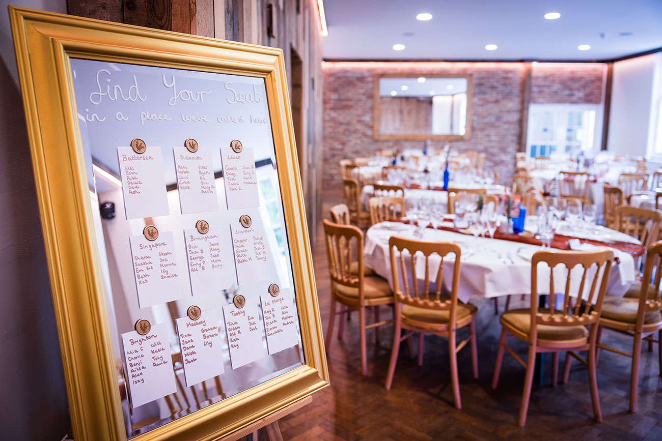 Personal touches ran throughout, with Elli’s mum baking the floral cake and her sister Livvi designing the save-the-dates. “We made our own decorations, including an old mirror I painted gold with wax-sealed name cards for the table plan,” she adds. Postcards were used as table names, each representing “places we’ve called home” with a handwritten story on the back.