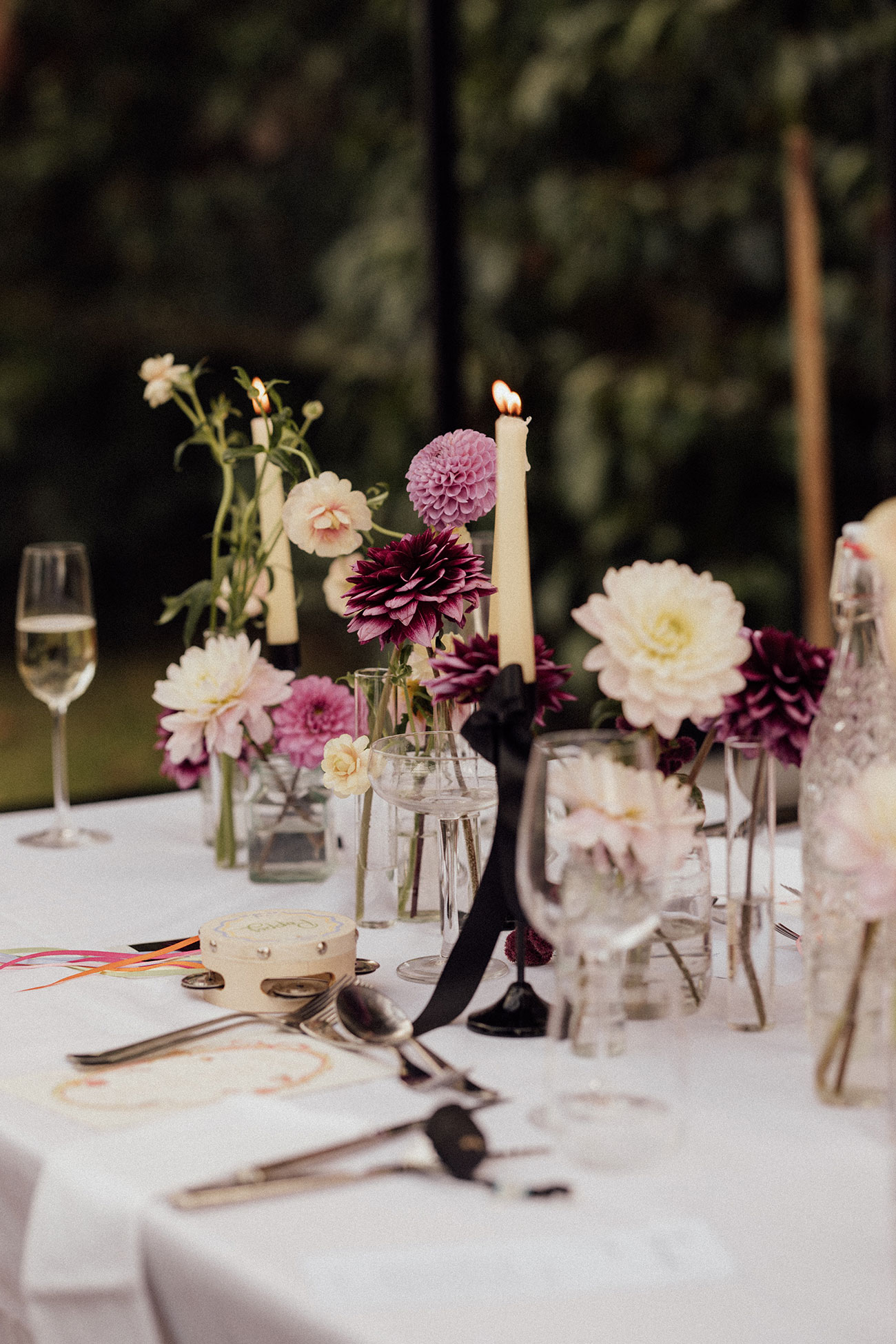 The stationery set the tone from the outset, followed by florals arranged by Tiffanie’s sister. “Having her involved was incredibly special,” says Tiffanie. “She understood my style completely and created fun, vibrant arrangements that added so much character to the day.”