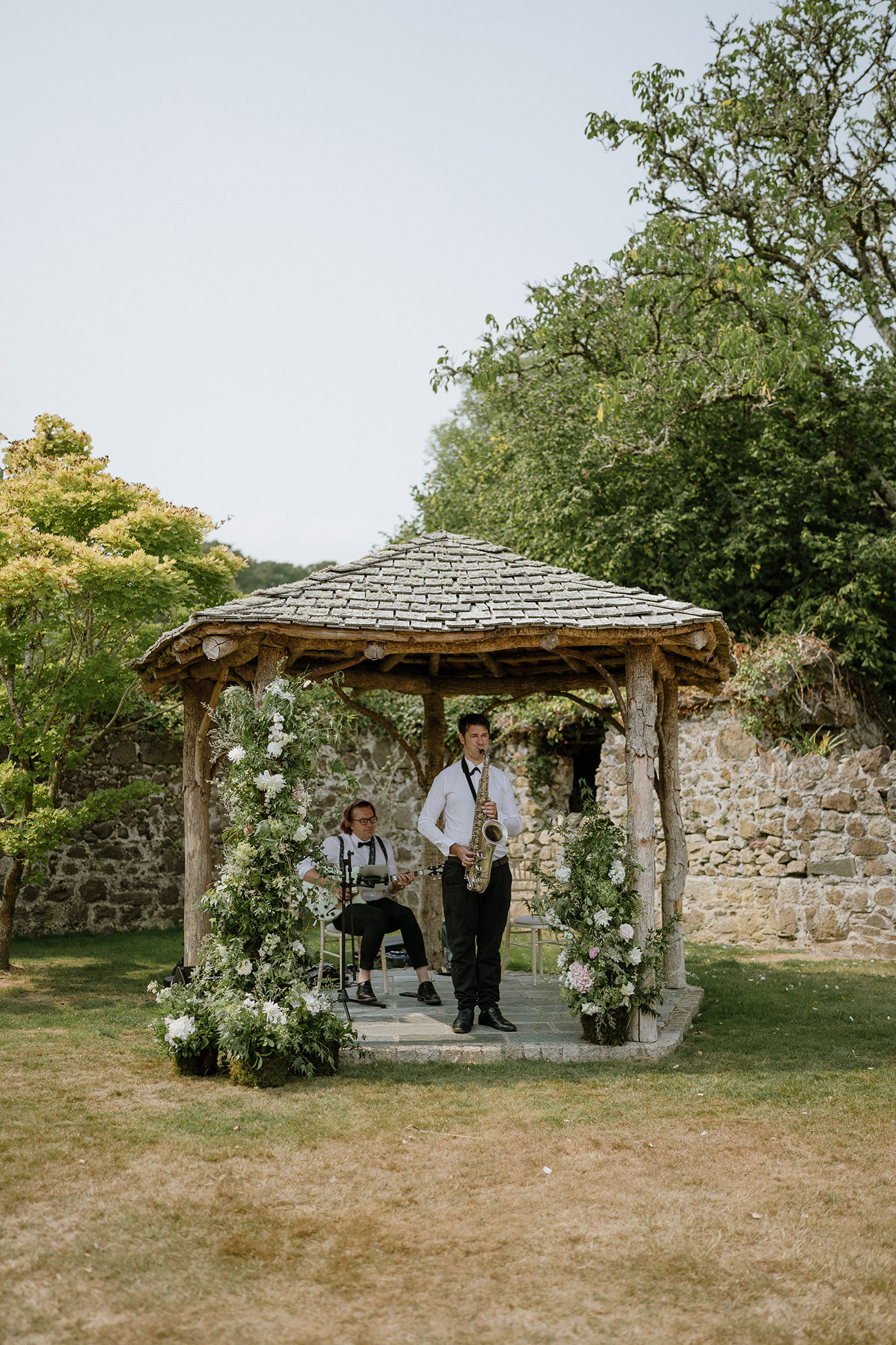 After the vows, guests wandered down the hill to The Great Barn for drinks accompanied by acoustic music, rattan furniture and parasols – the perfect garden party scene. Roaming musicians provided the soundtrack as guests later took their seats in the Barn for speeches and a feast of salmon, beef, cod and a trio of desserts. The Upshots performed acoustic classics between courses, keeping the atmosphere upbeat and joyful.