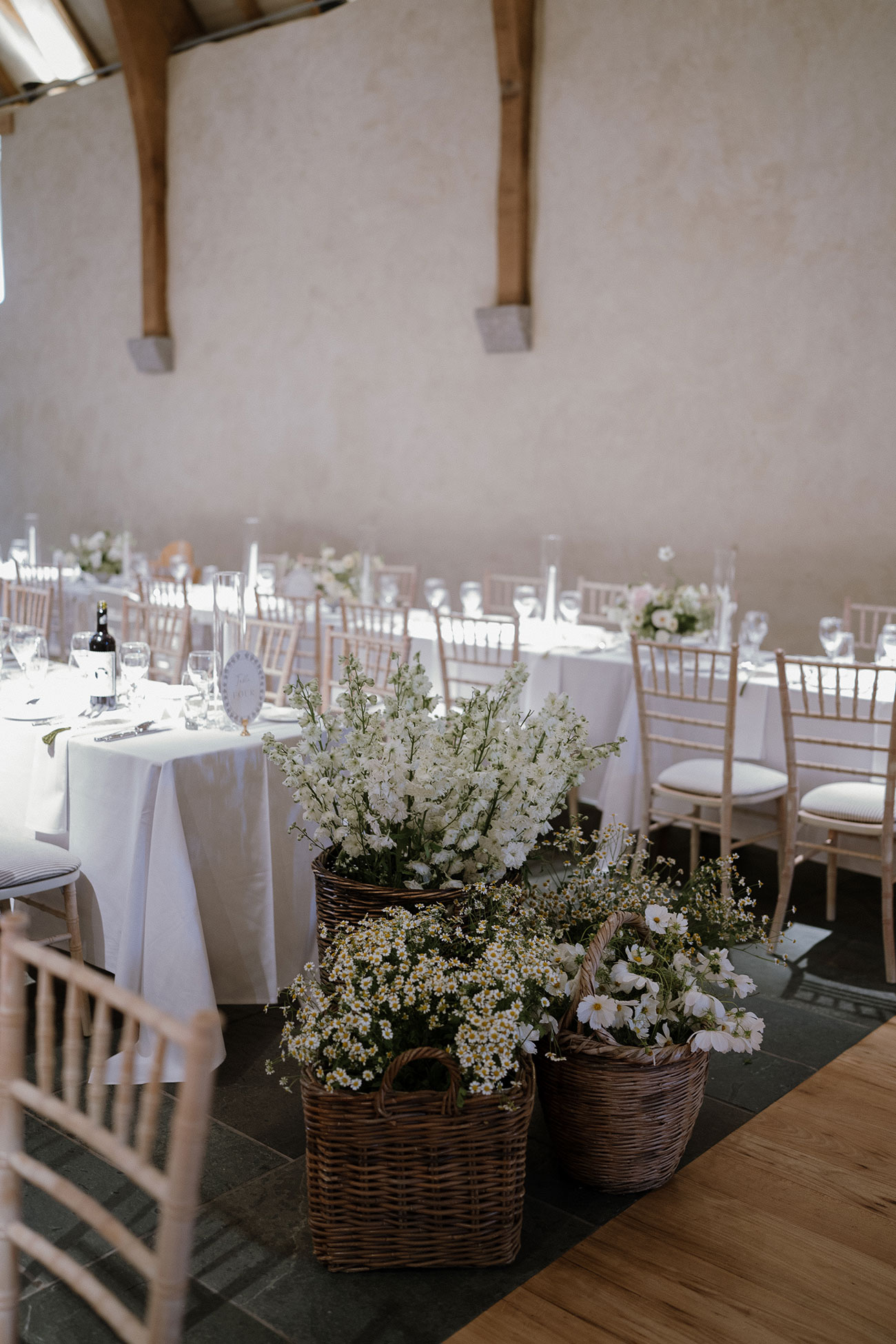 As a stationery designer, Hannah relished creating their paper goods. “I wanted everything to tie back to the invitation to tell the story of the day and capture the beauty of The Great Barn,” she says. Watercolour hydrangeas and cosmos flowed through every detail, from the floral-adorned table plan to the oval menus, signage and venue illustrations. “Looking out from the top table and seeing a sea of florals in baskets, potted hydrangeas and glowing candles was breathtaking!” she says.
