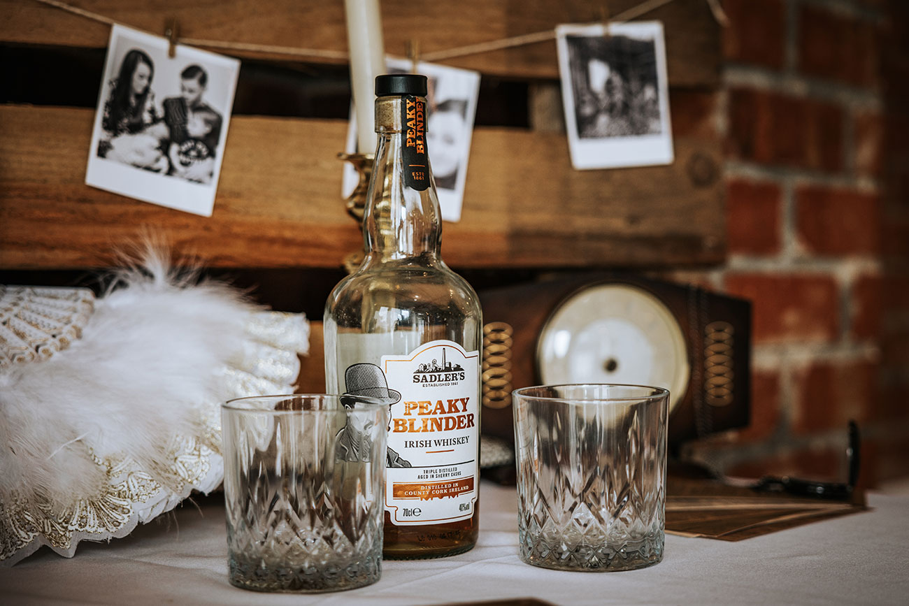 As well as their guests dressing in 1920s’ style, a smattering of décor and props including whiskey barrels, vintage suitcases and vintage candlestick holders enhanced the scene, while the floristry pulled all the details together.