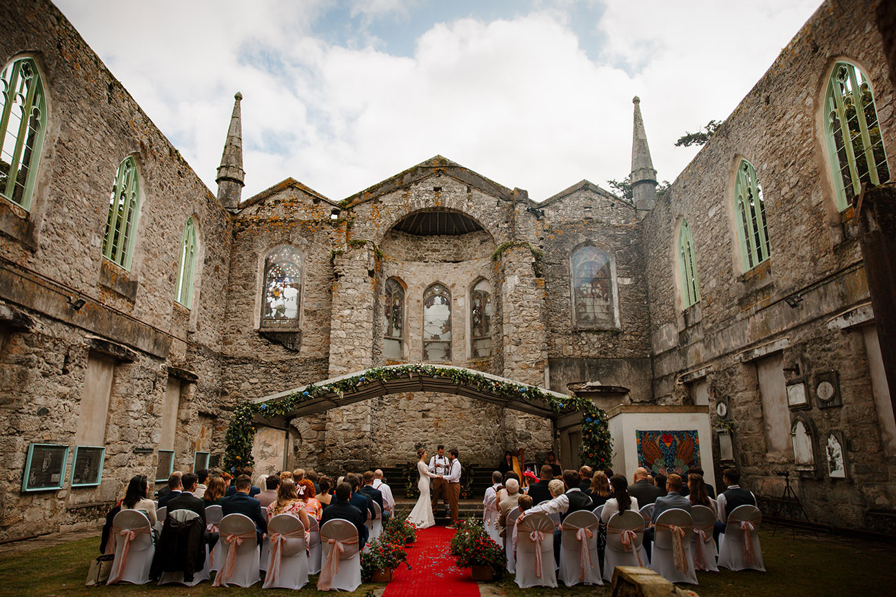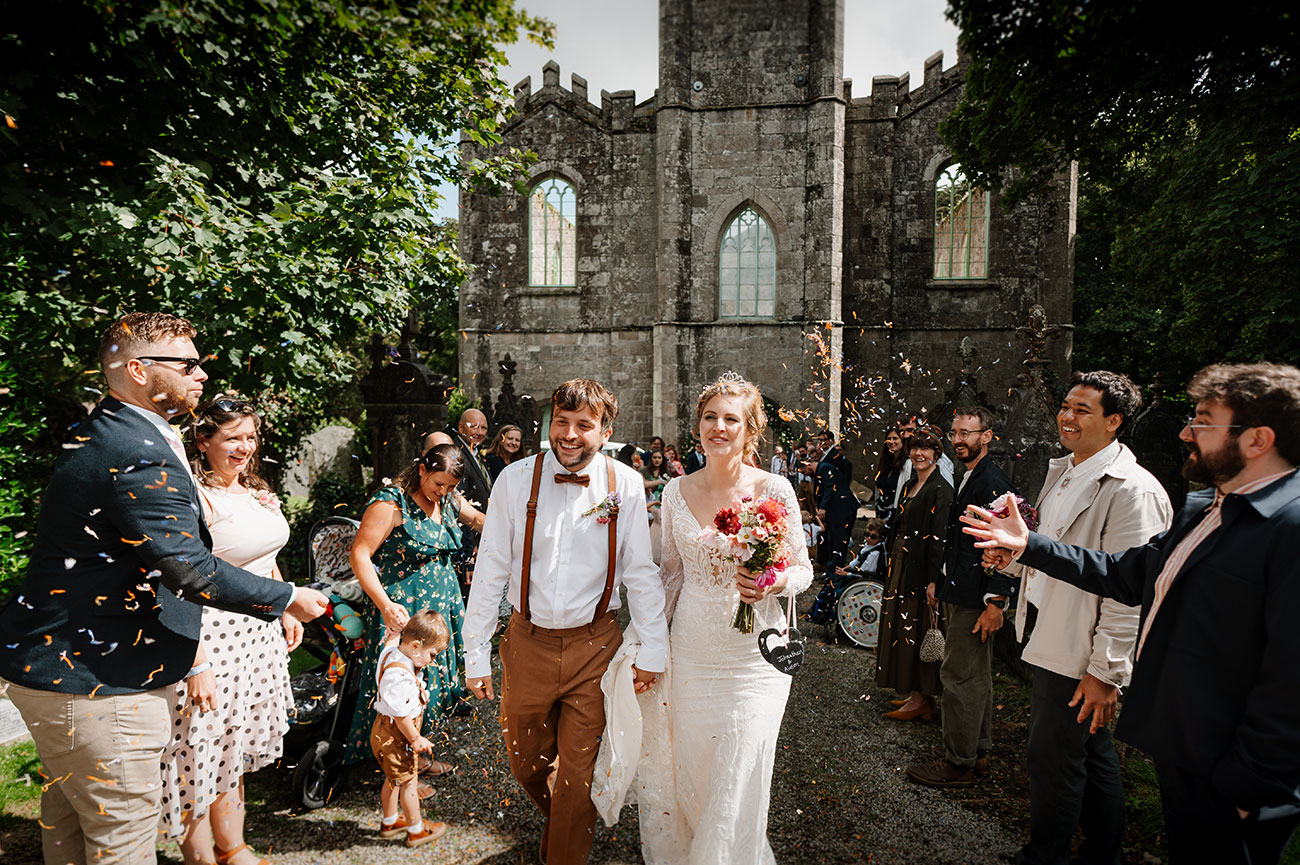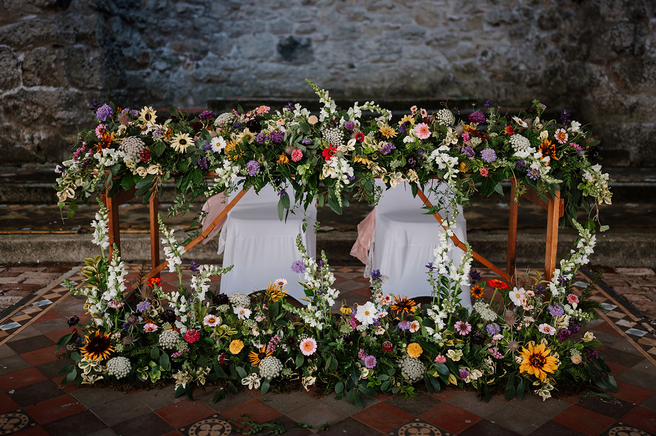 The church was dressed with arrangements of vibrant locally grown flowers, including a striking archway, all arranged by a team of volunteers. “My dad made the framework for the arch, and we now have it in our garden as a lovely memento,” Alison adds. From a rain shower in the middle which saw umbrellas being passed around and the church’s resident doves even making an appearance, it was a ceremony to remember.