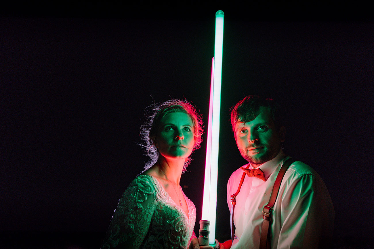As the evening unfolded, the couple cut their cake before their first dance to Coldplay’s Sky Full of Stars performed by Josh Curnow. “When it was completely dark, our photographer Tom stayed to take photos of us with our lightsabers,” reveals Alison. “He was totally on board as we are fans of Star Wars and wanted to have some fun!”