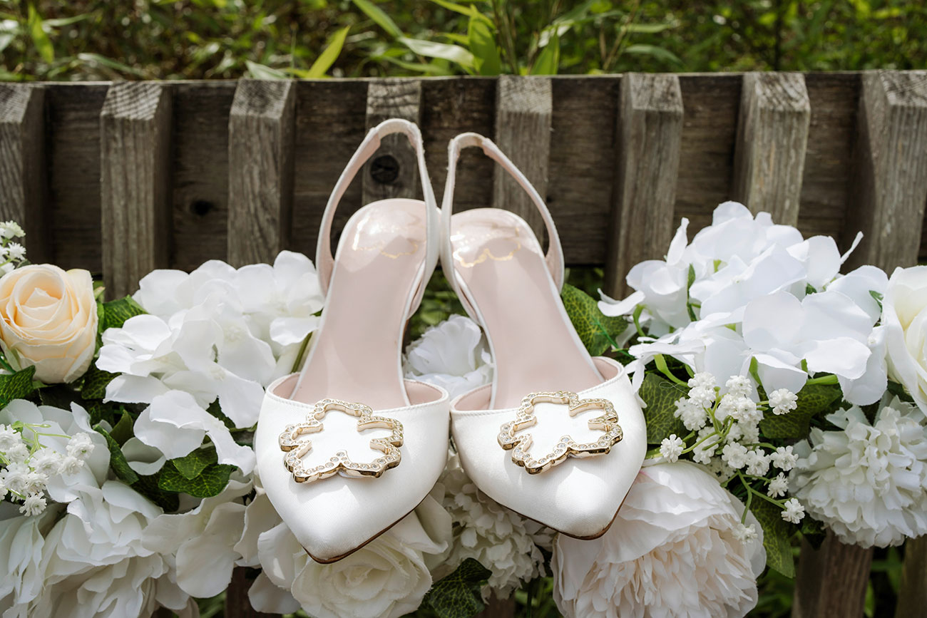 Their aesthetic was classic and timeless, a palette of creams, whites and lush green foliage that blended seamlessly with the surrounding landscape. The day began slowly, with a relaxed morning spent getting ready together and having breakfast, before their wedding coordinator, Nicola, arrived to guide them through the day. “After the flowers, photographer and registrars arrived, Nicola helped me into my dress,” recalls Hannah.