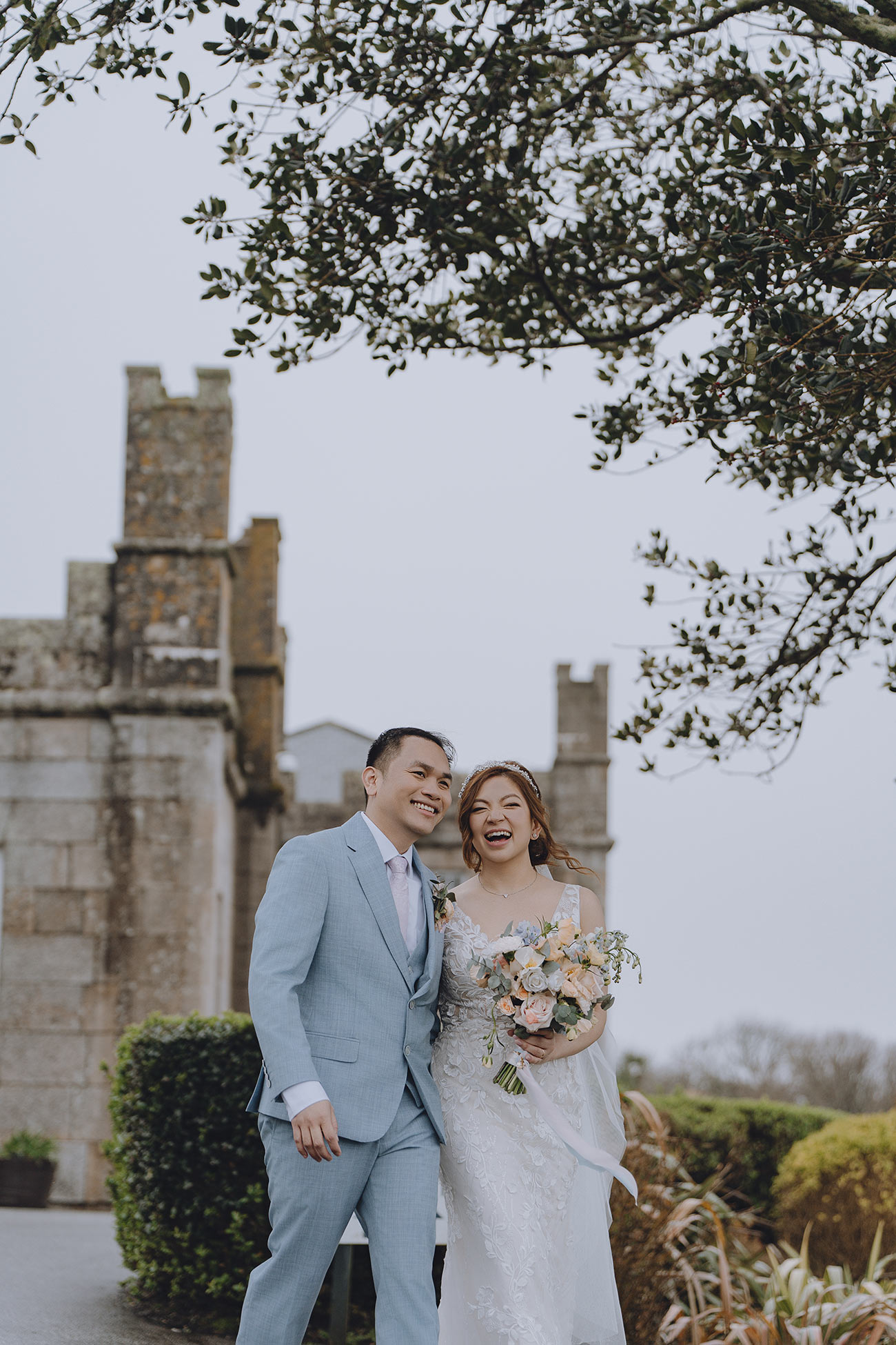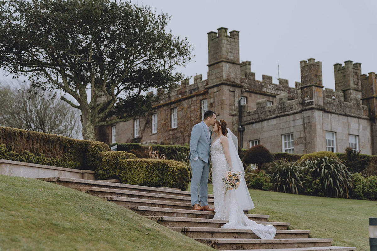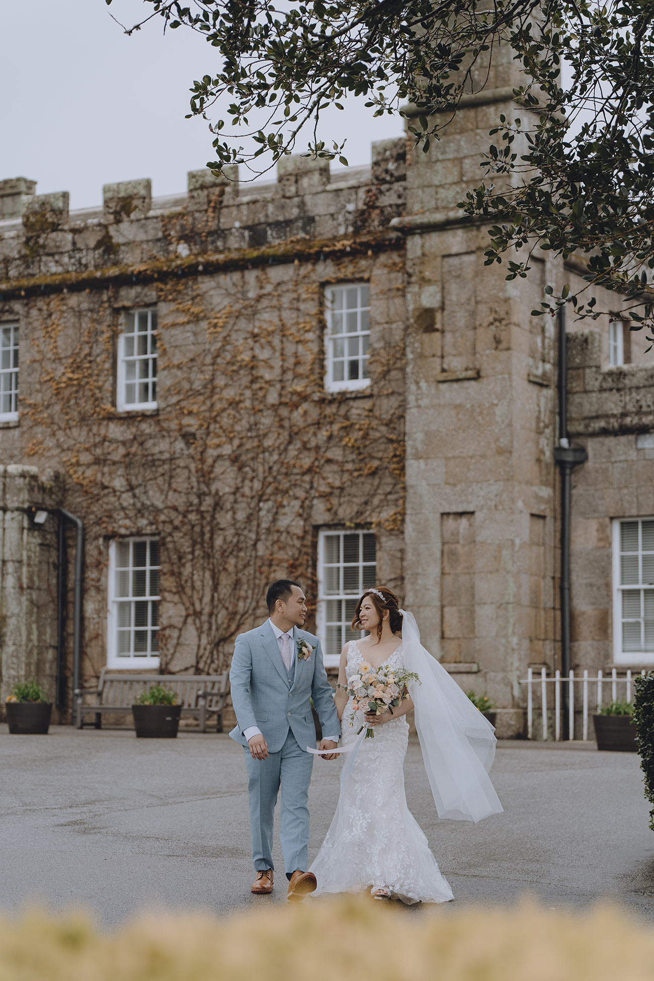 Travelling in red buses to Tregenna Castle, the newlyweds and their friends were greeted with welcome drinks and canapés to the soundtrack of a pianist playing love songs. A buffet of banana blossom, chicken skewers, shrimp skewers, pulled pork, rump steak and sea bass was followed by Moomaid ice cream and heartwarming speeches. “There were no dry eyes,” says Nicca.