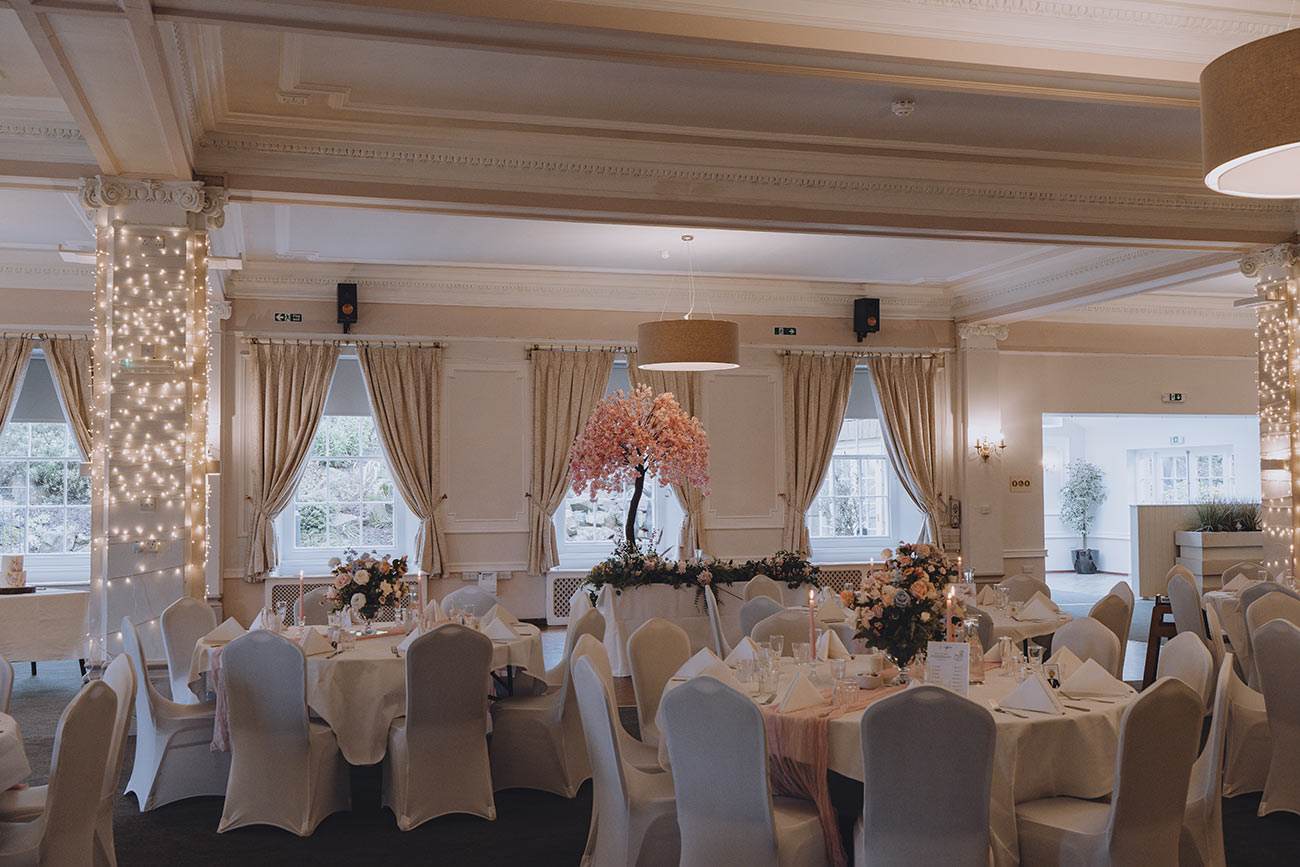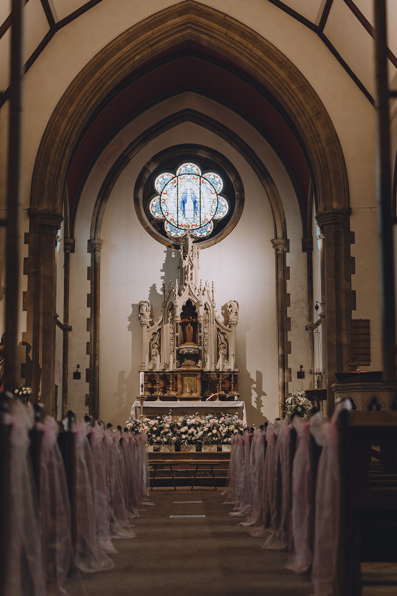 Guests travelled from the USA, Canada and beyond to St Ives for the couple's dreamy spring wedding. Blooms and pew bows in the prettiest pastel shades added elegance to the Sacred Heart and St Ia Catholic Church, while a scattering of flowers, candles and a cherry blossom tree made for a romantic scene at Tregenna Castle Resort.