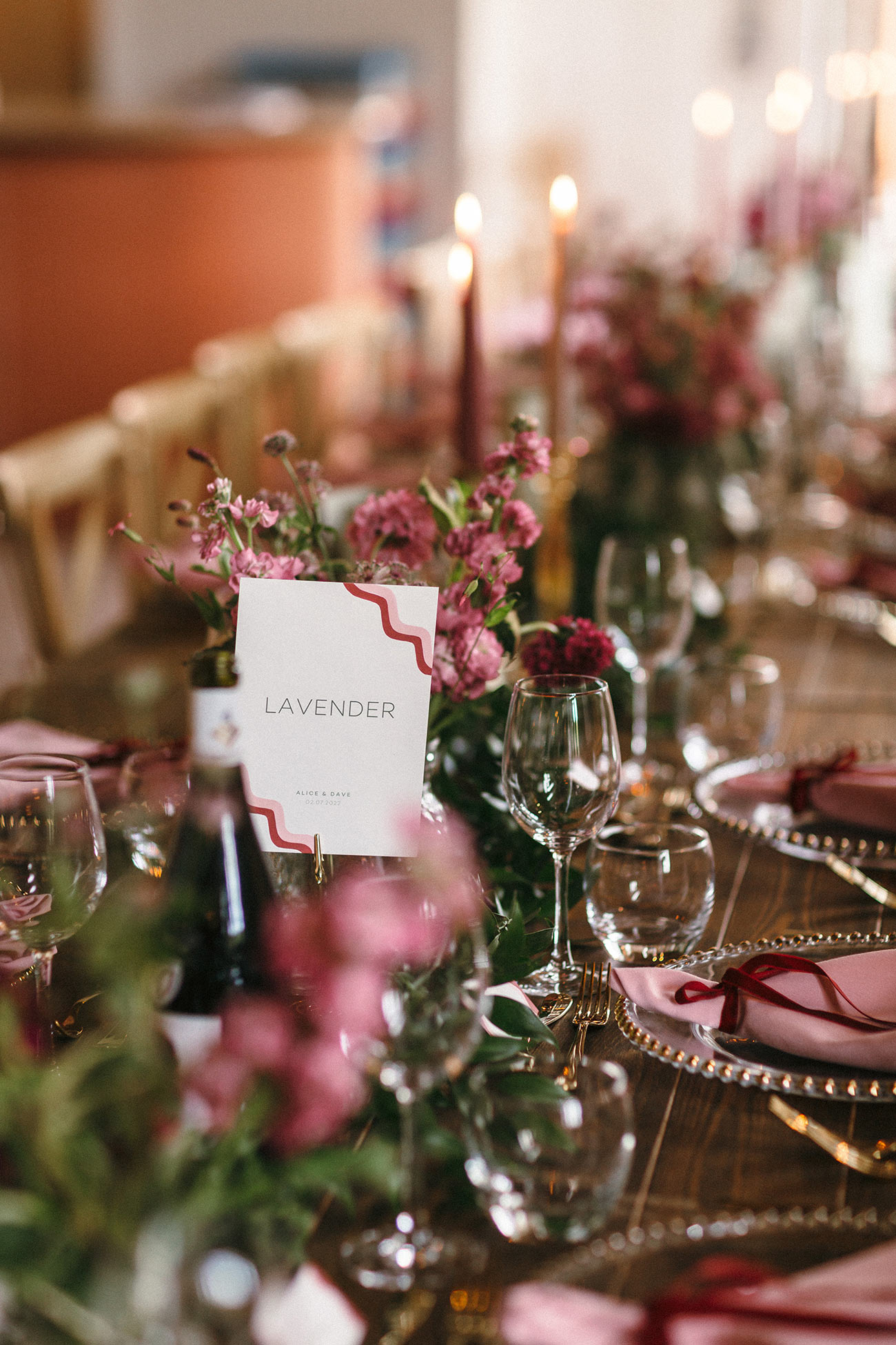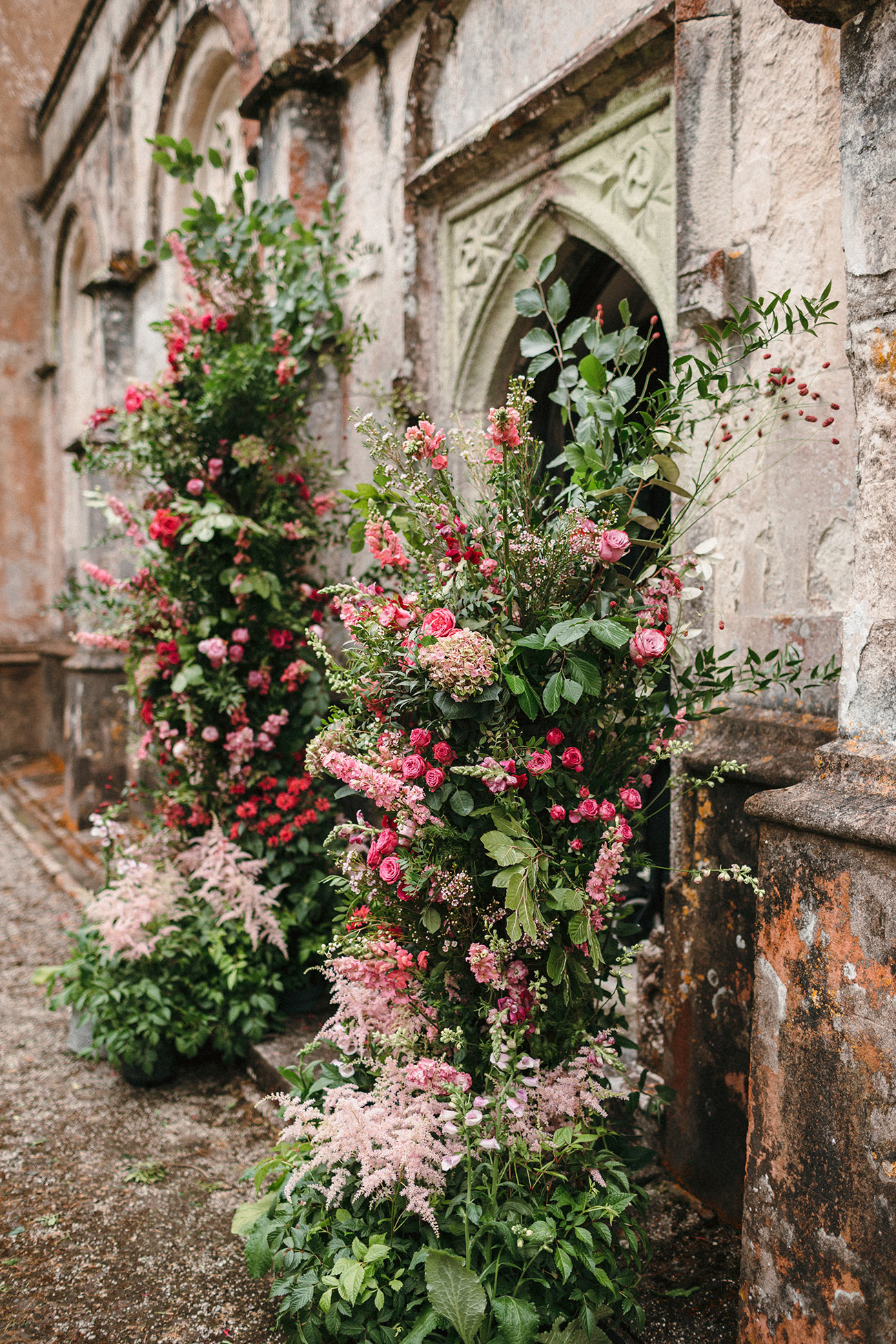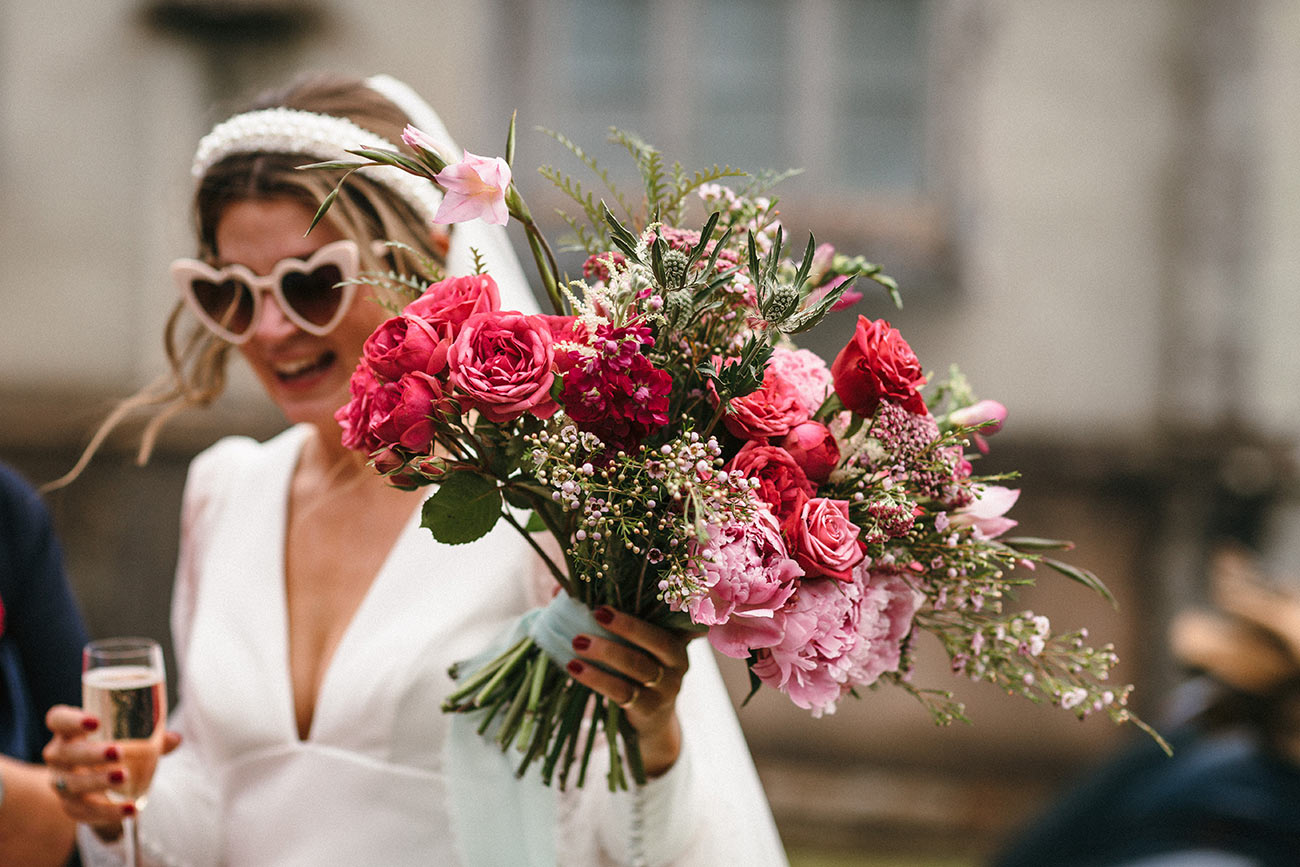 Shades of pinks and burgundy combined to create the couple’s “romantic English garden with a retro twist” celebrations, which included gorgeous floristry in the form of hydrangeas, peonies, roses and an abundance of foliage.