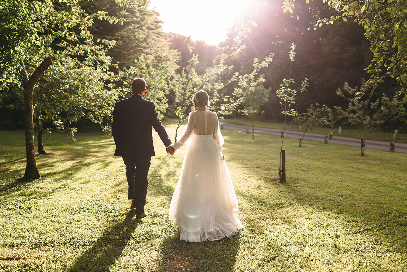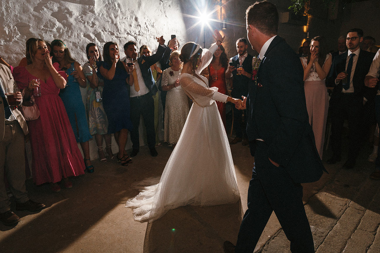 After dinner, guests relocated to the courtyard while the Stable Barn was transformed into the evening reception space, allowing them to appreciate the golden hour in all its glory. “We even got a rainbow!” reminisces Alice. Dancing, pasties and cake ensued – along with Alice’s dress change into a showstopping sequin gown.
