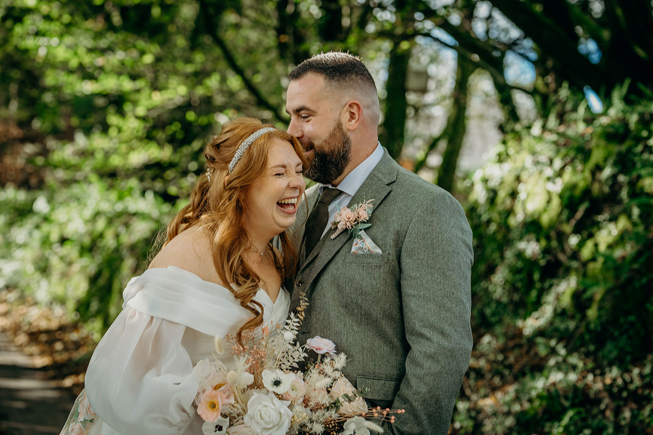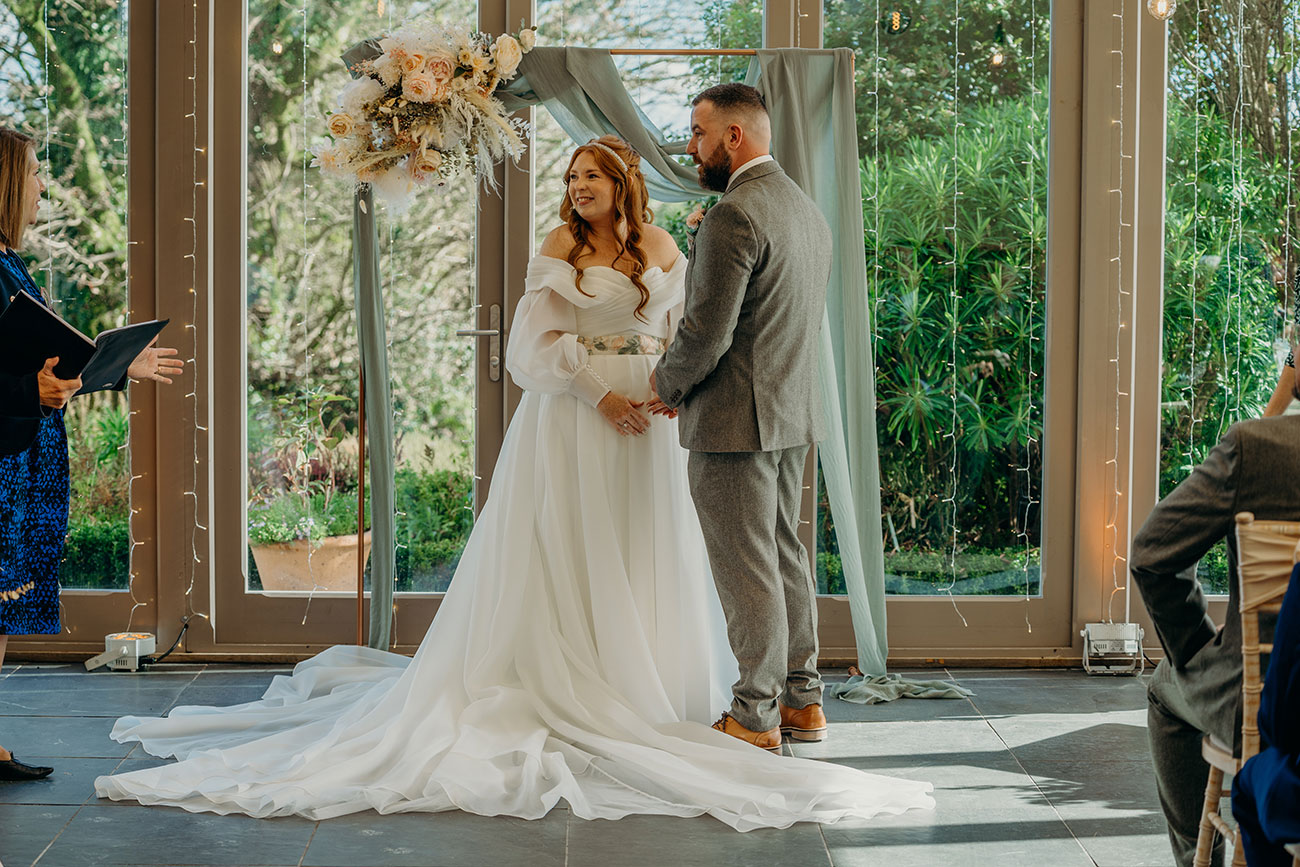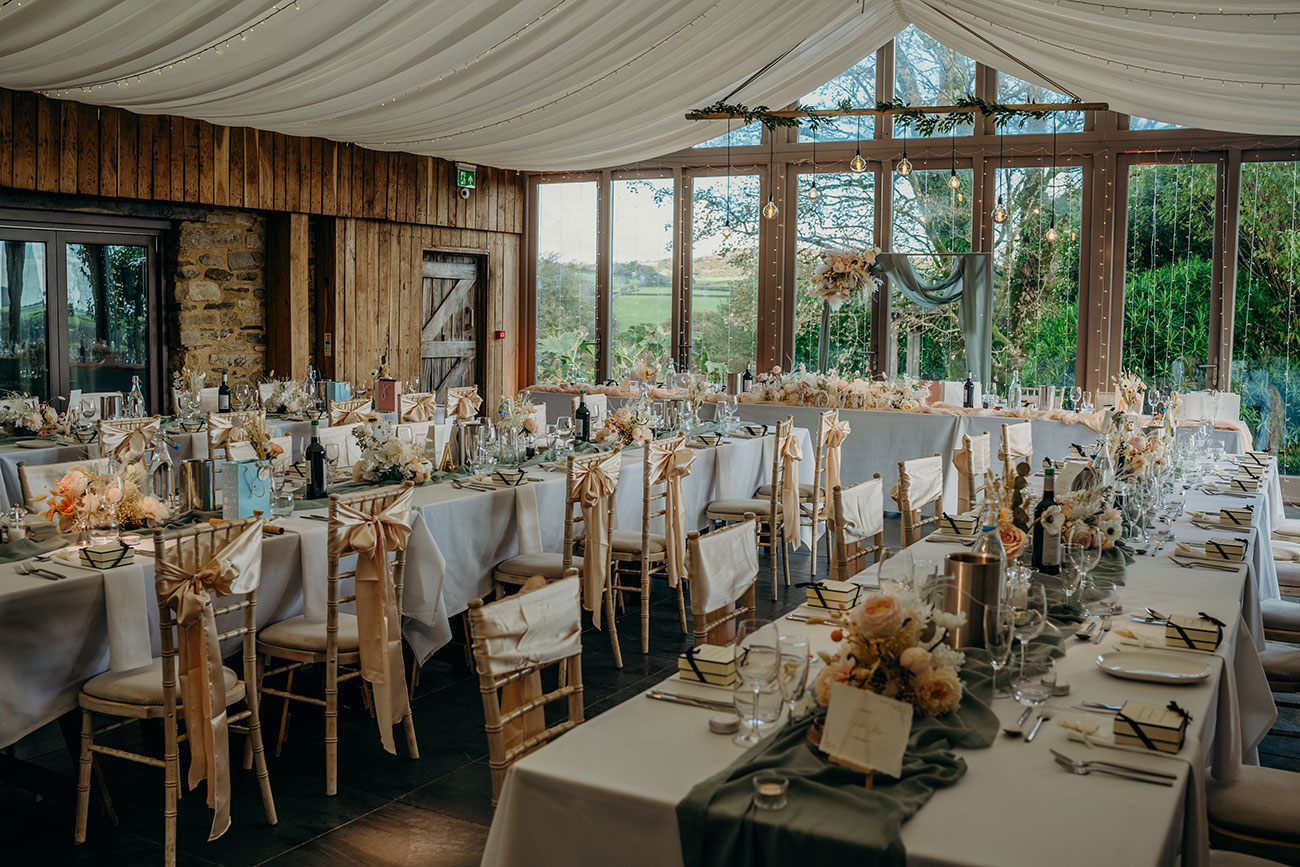 The light and airy Garden Venue, with its floor-to-ceiling windows overlooking the grounds, allowed the couple to enjoy the beauty of the natural surroundings without worrying about the weather as they exchanged vows. “I walked down the aisle to an instrumental version of Wildest Dreams by Duomo,” says Laura. “I had been listening to this song in the months leading up to the big day, picturing our wedding, and it really helped to calm my butterflies. The sun dappled the room and clouds gently rolled across the moors outside; it was very picturesque and the most perfect backdrop.”