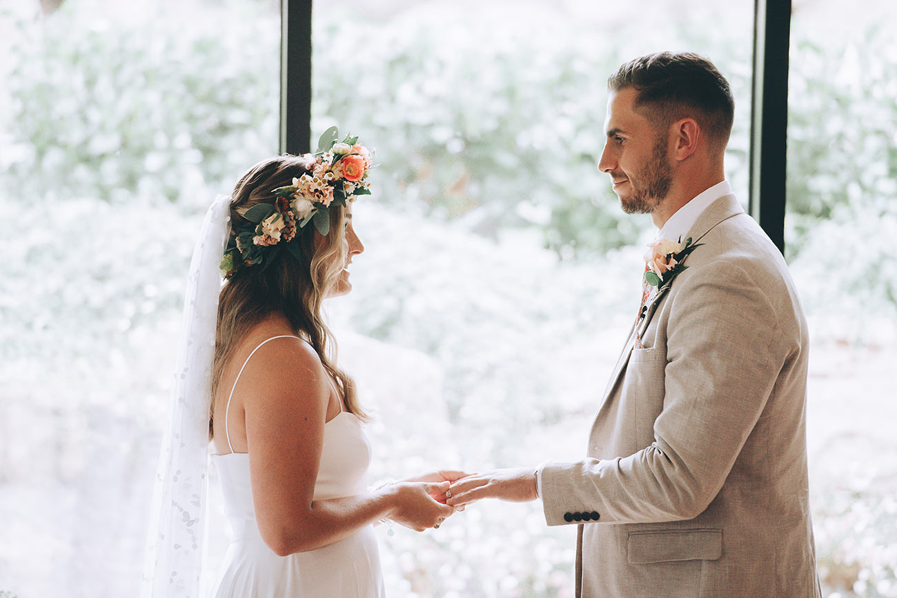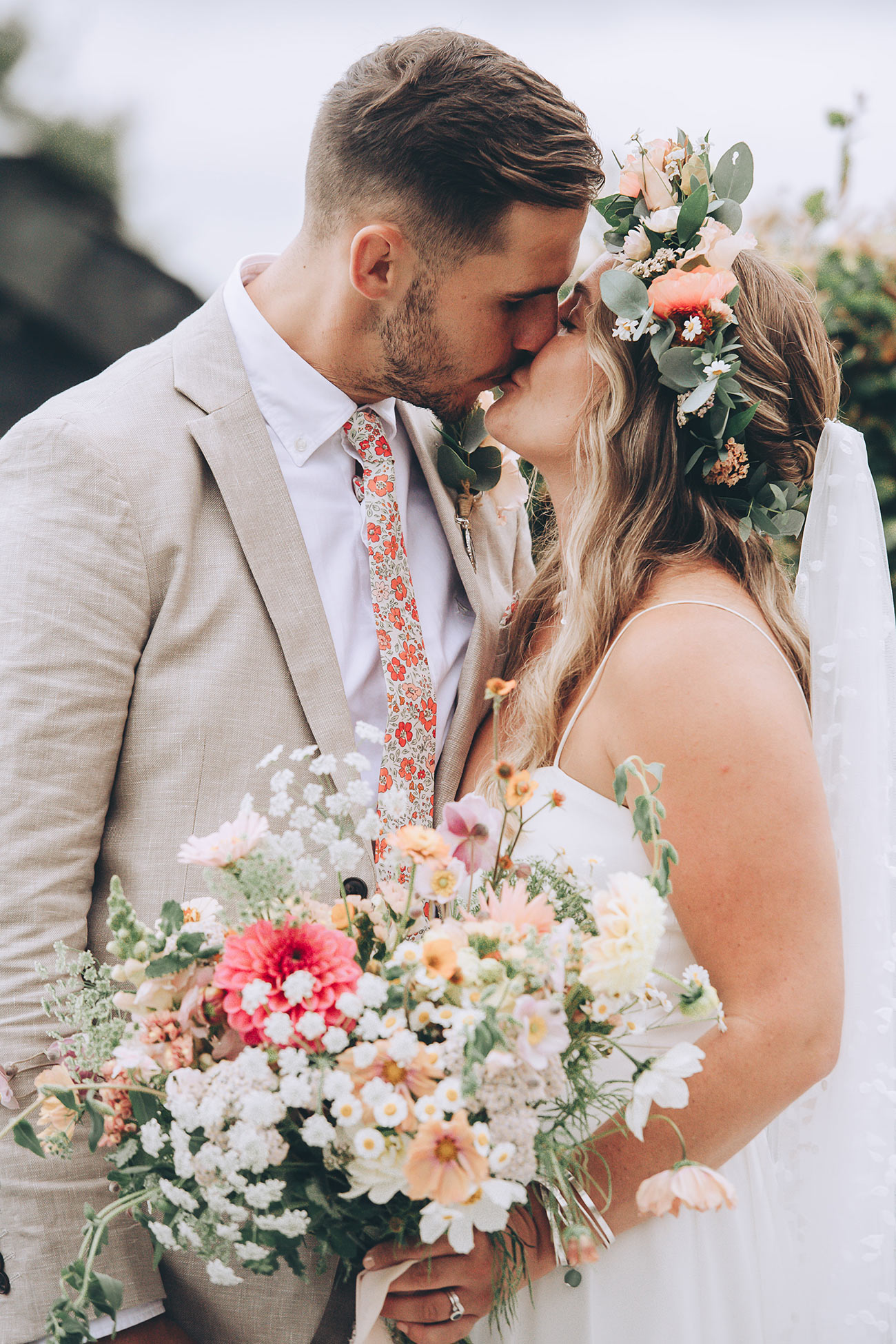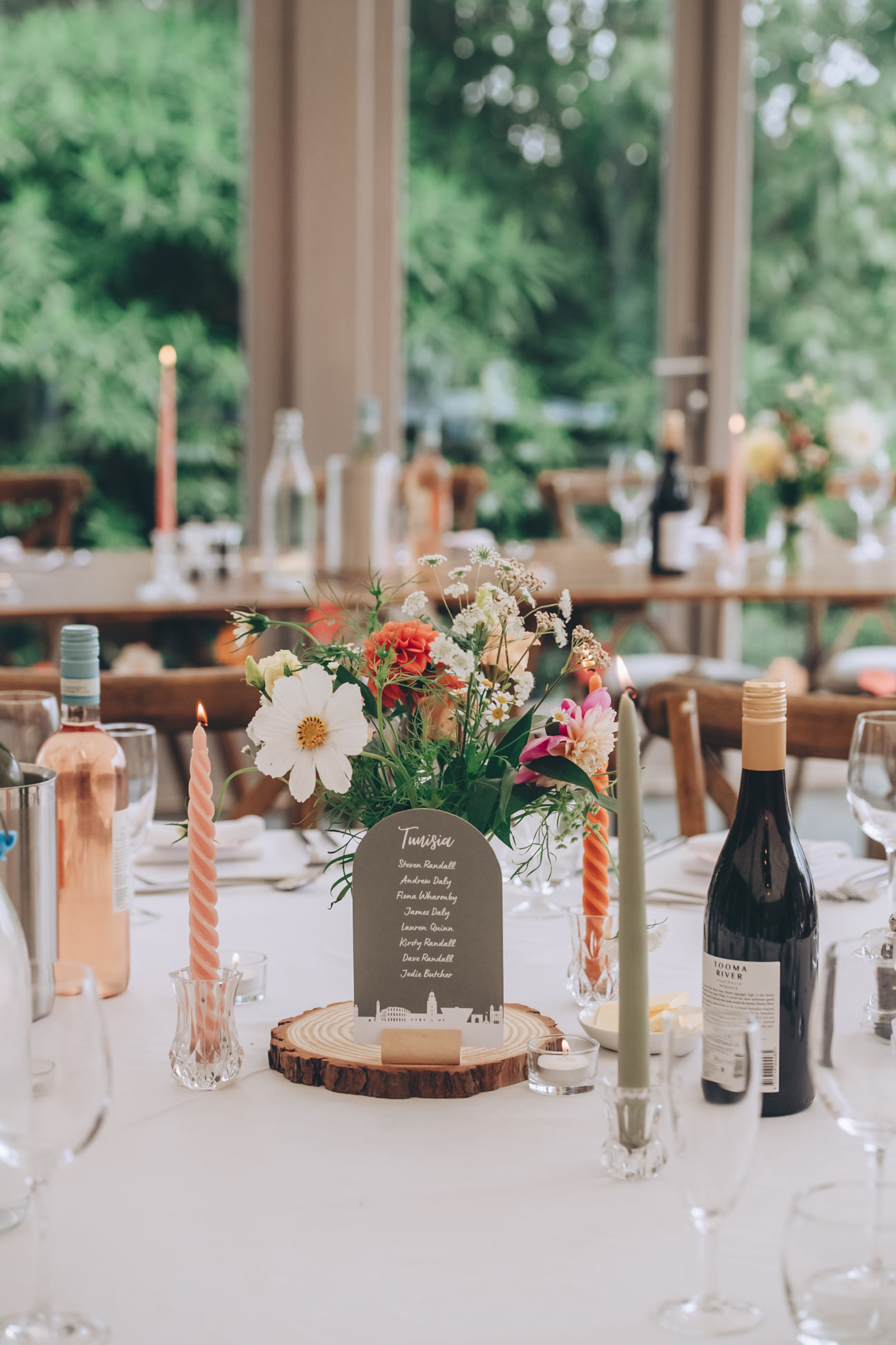 A drizzly morning meant their ceremony was moved indoors to the Mowhay. “The Mowhay was the perfect setting – Intimate and full of warmth, with that stunning window as the backdrop,” says Alice. “We wanted our ceremony to be a true reflection of us – fun, personal and full of meaning.” Alice walked down the aisle with both parents, setting the tone for a non-traditional, heartfelt ceremony. Their celebrant, Mel, wove a beautiful narrative shaped by their travels, and the couple wrote their own vows.