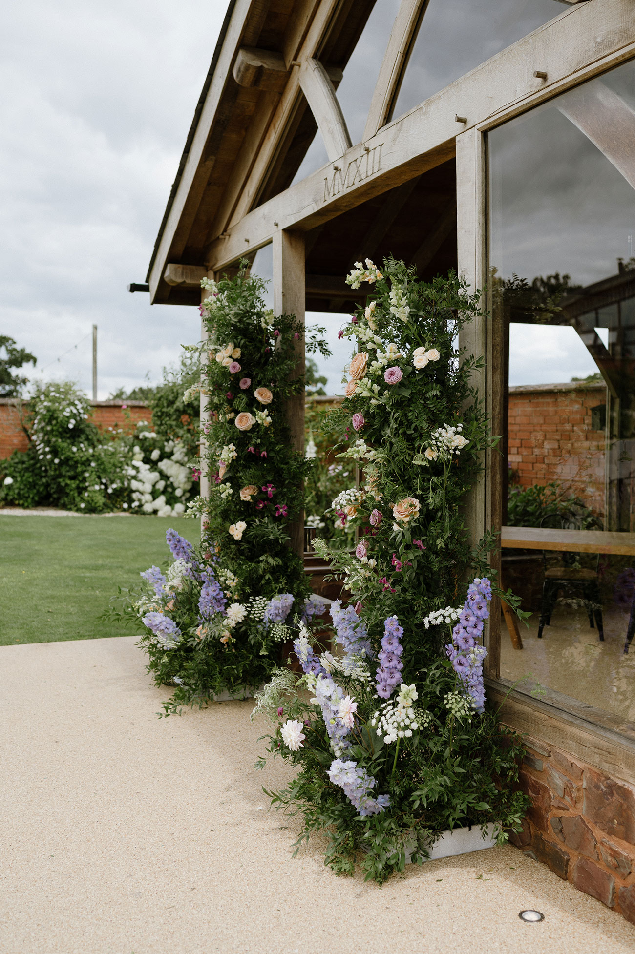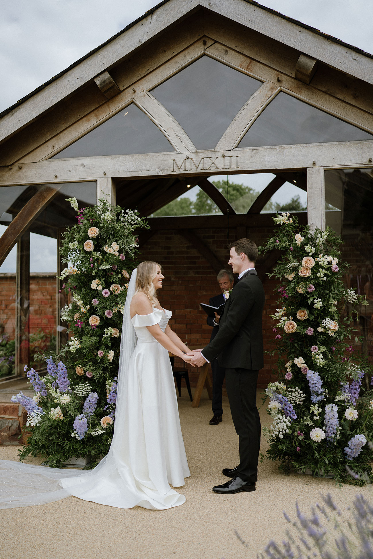 The venue’s natural beauty meant minimal décor was needed. “The walled garden was so stunning with the blooming lavender and rose bushes,” she says. Pops of colour came through the florals, while the rest of the styling was kept simple: bud vases, candles, a hanging oak beam and a pair of flower pillars that created a beautiful ceremony backdrop.