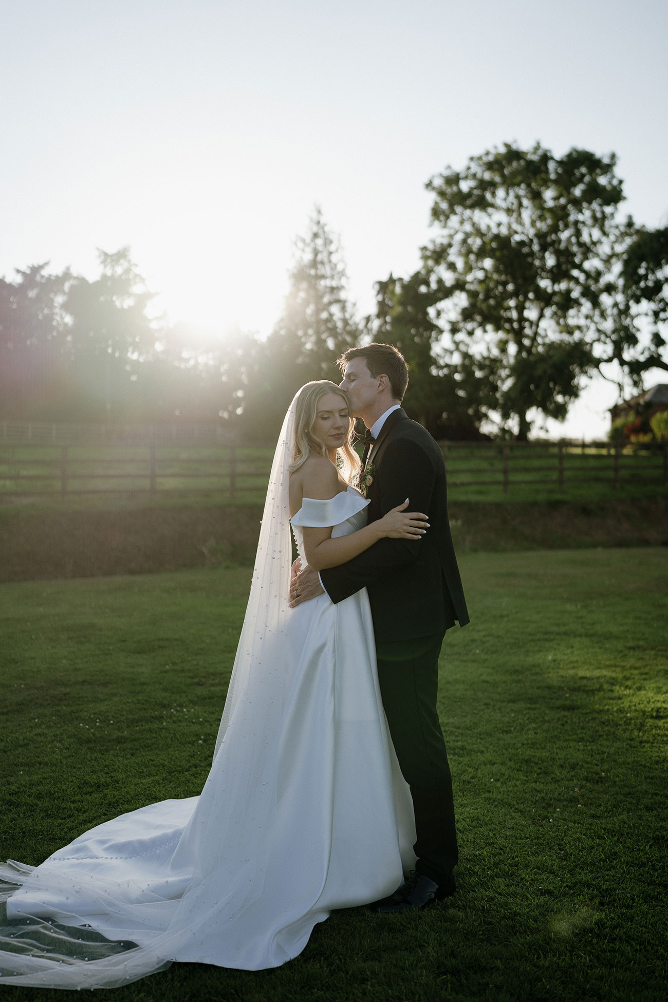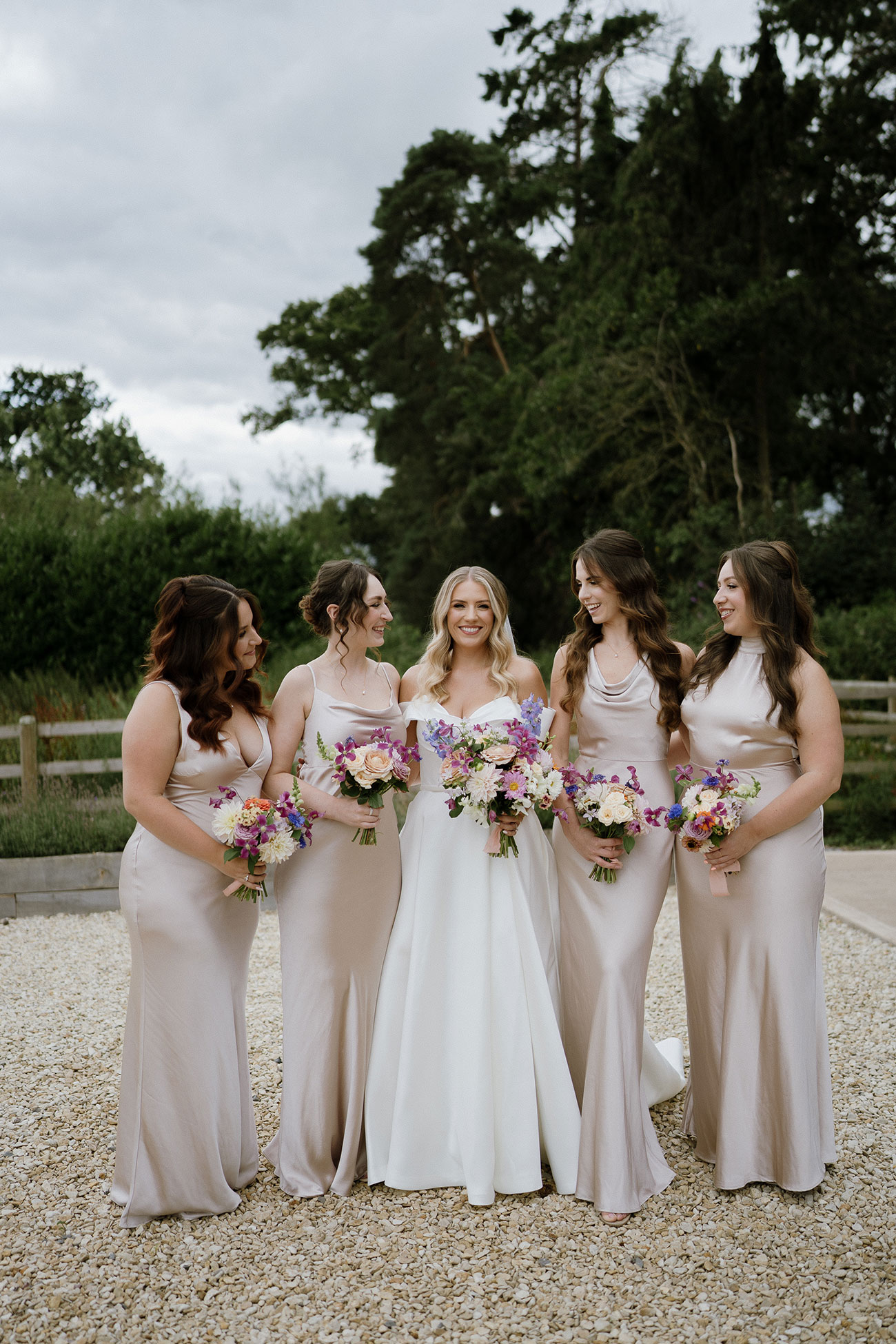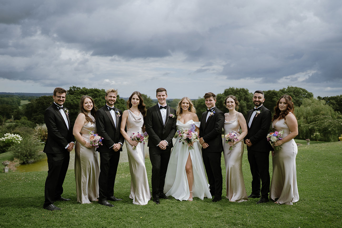 The couple chose a timeless dress code to complement the setting. Lara wore an elegant satin off-the-shoulder gown, while Loic and the groomsmen looked sharp in black tuxedos and the bridesmaids shimmered in satin champagne dresses. A first look gave the couple a quiet moment together before the celebrations began. “It was really lovely to see each other in private all dressed up”, Lara reflects. The ceremony then unfolded in the walled garden beneath summer skies.