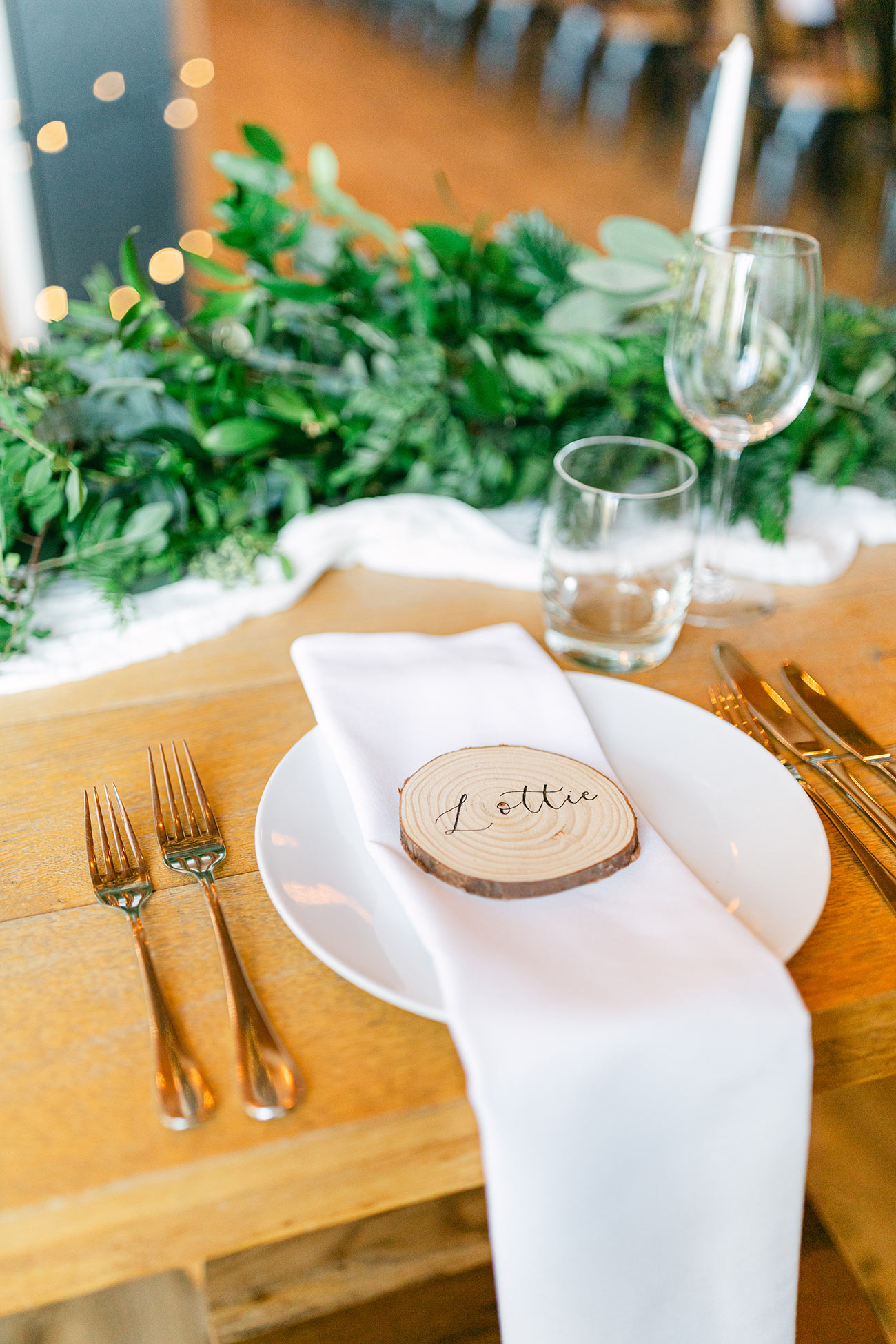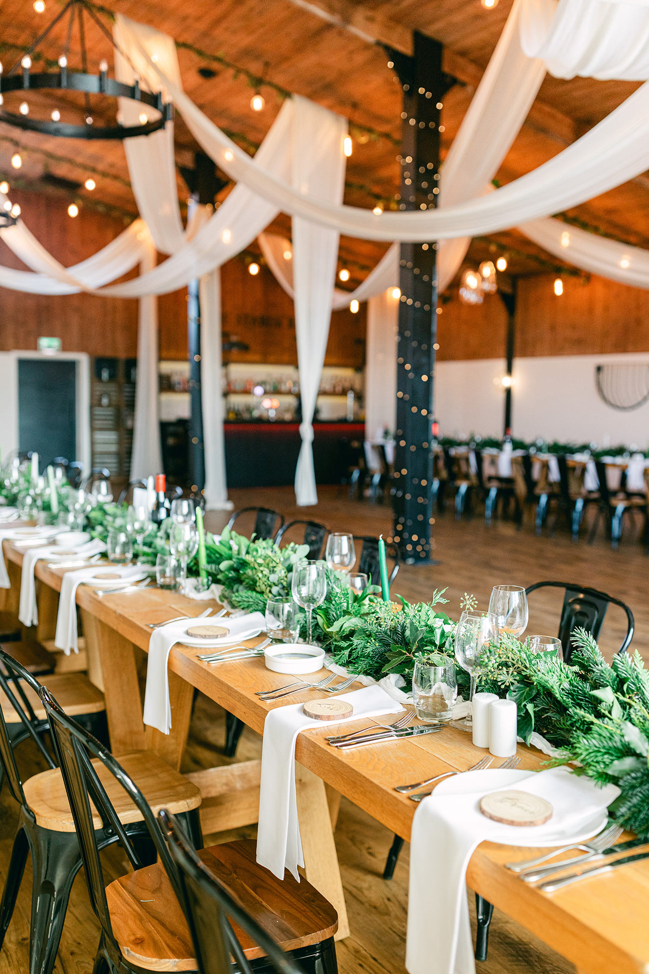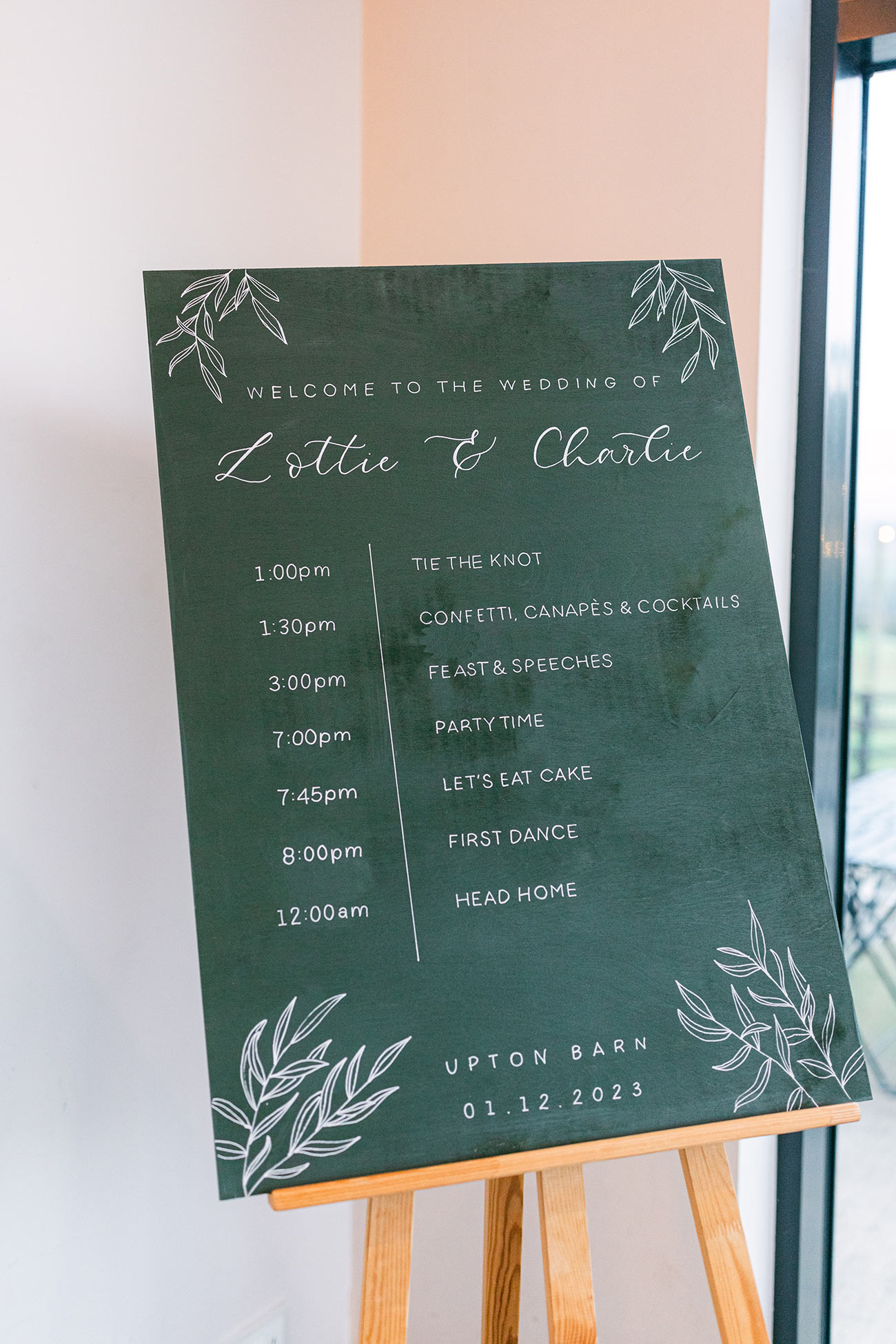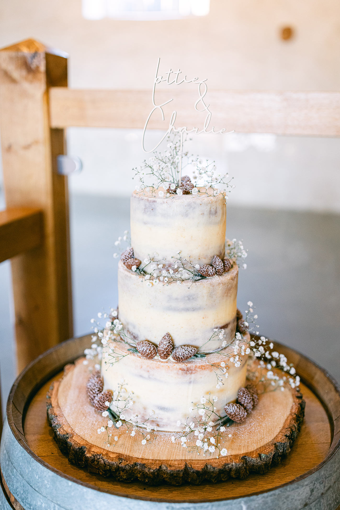 Working in the wedding industry, Lottie knew – even before she met Charlie – that Upton Barn would be her wedding venue. They opted for a theme of “laidback and wintery with lots of green” for their December wedding, partly as a nod to Charlie’s career in forestry. Continuing the theme, the couple had mini wooden tree slices as place names for each guest and their tables, which were lined with candles and scented foliage, were named after trees.