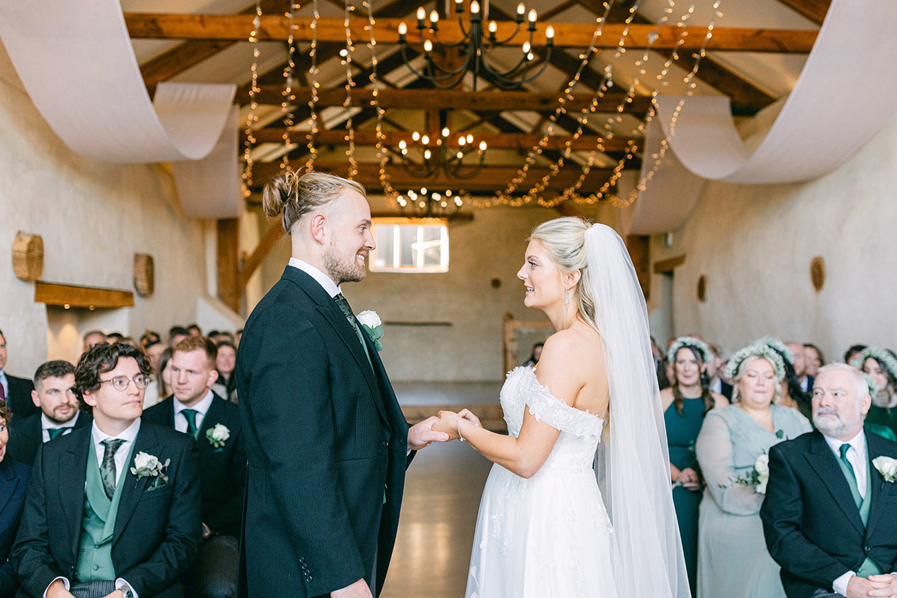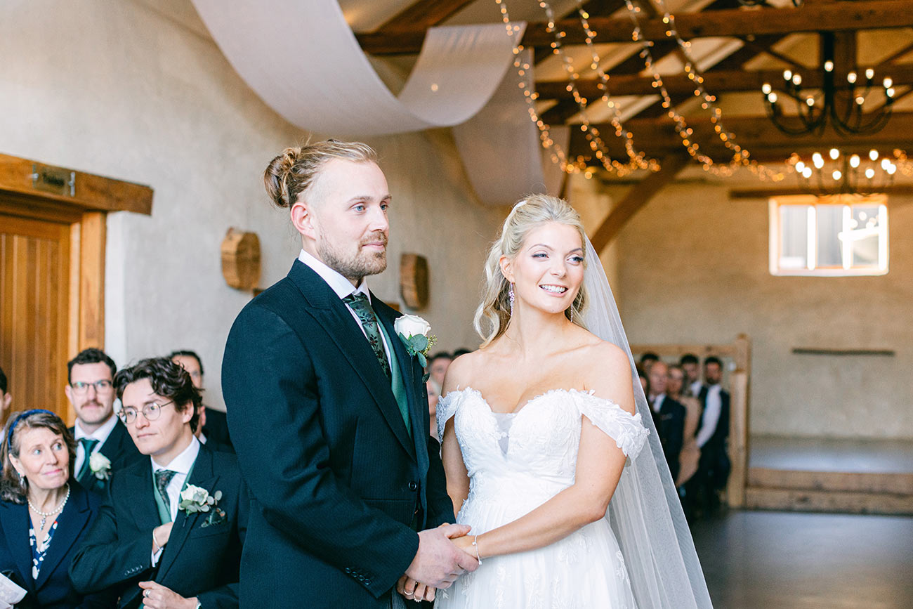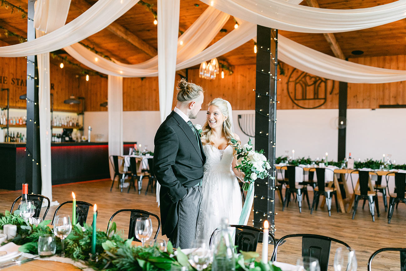 Working in the wedding industry, Lottie knew – even before she met Charlie – that Upton Barn would be her wedding venue. They opted for a theme of “laidback and wintery with lots of green” for their December wedding, partly as a nod to Charlie’s career in forestry. Continuing the theme, the couple had mini wooden tree slices as place names for each guest and their tables, which were lined with candles and scented foliage, were named after trees.