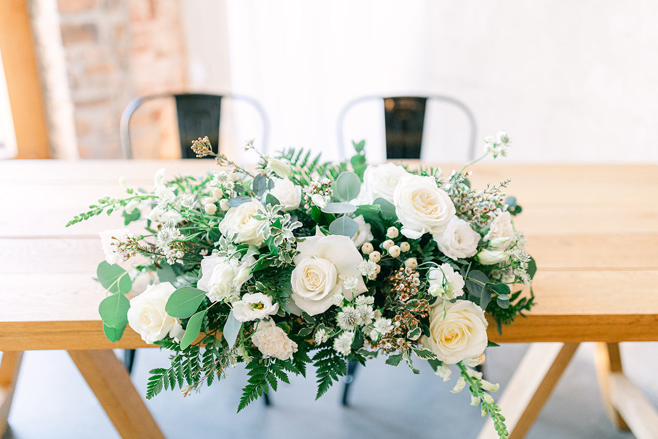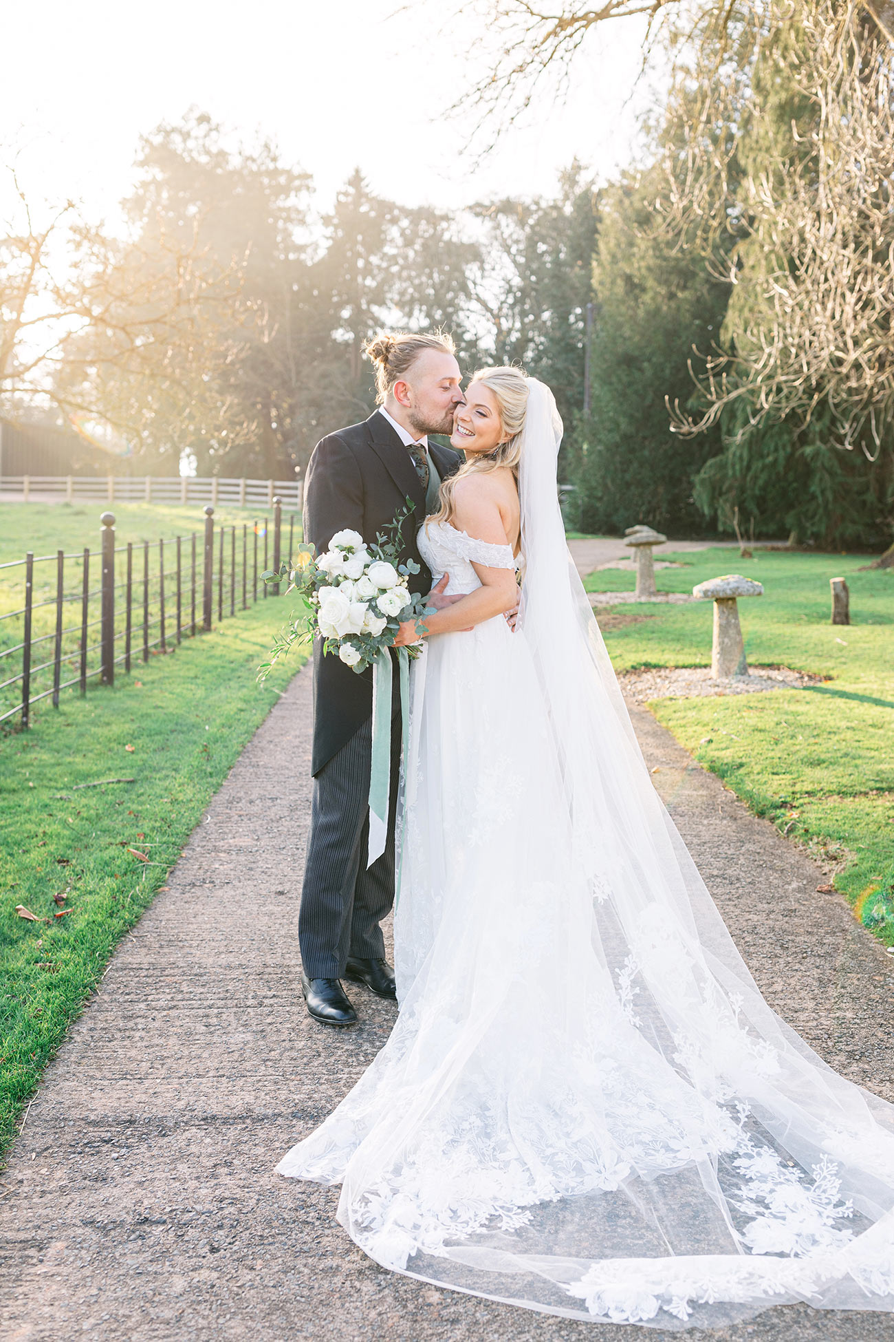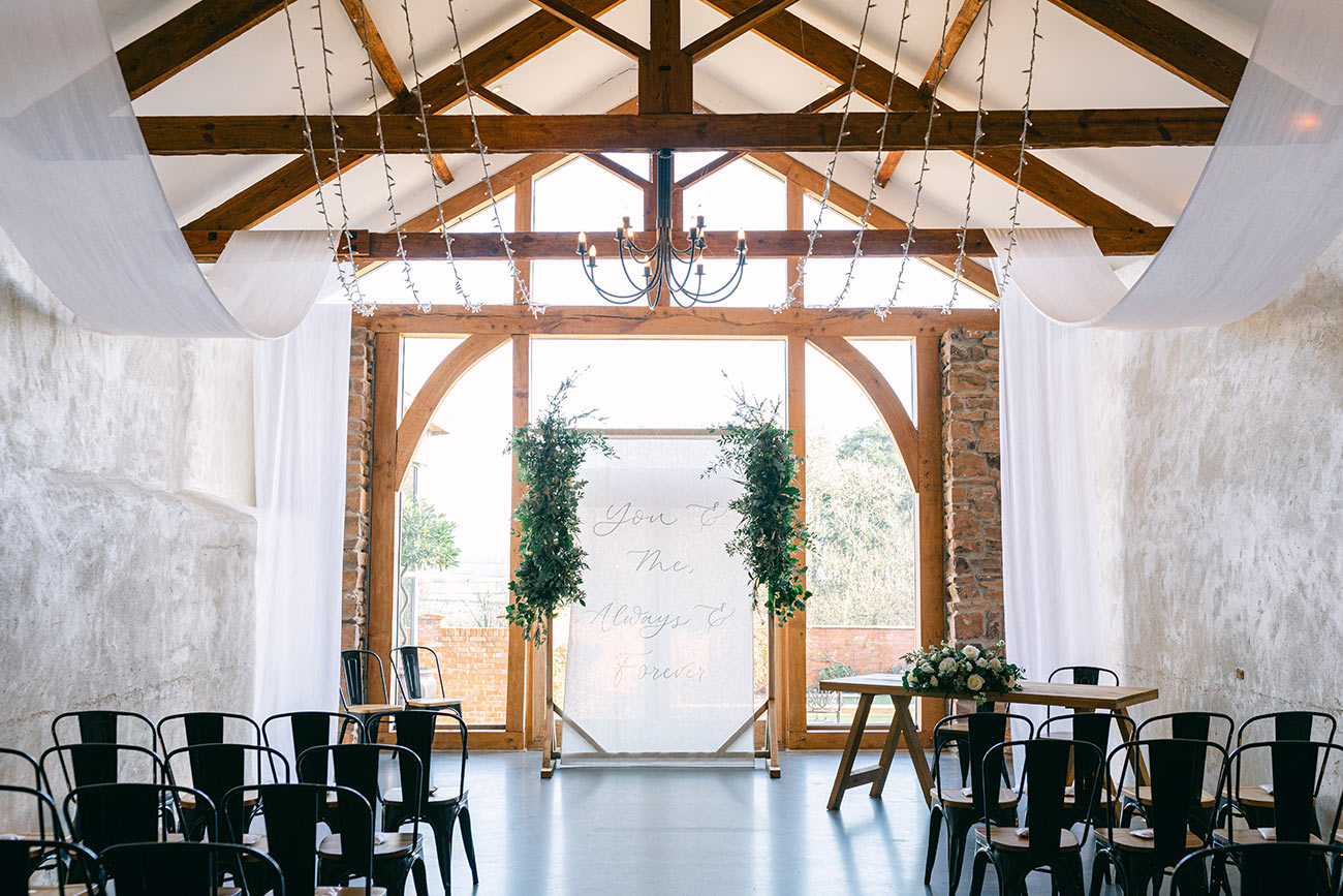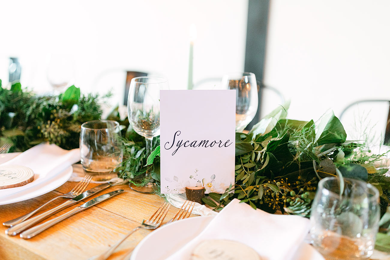 Working in the wedding industry, Lottie knew – even before she met Charlie – that Upton Barn would be her wedding venue. They opted for a theme of “laidback and wintery with lots of green” for their December wedding, partly as a nod to Charlie’s career in forestry. Continuing the theme, the couple had mini wooden tree slices as place names for each guest and their tables, which were lined with candles and scented foliage, were named after trees.