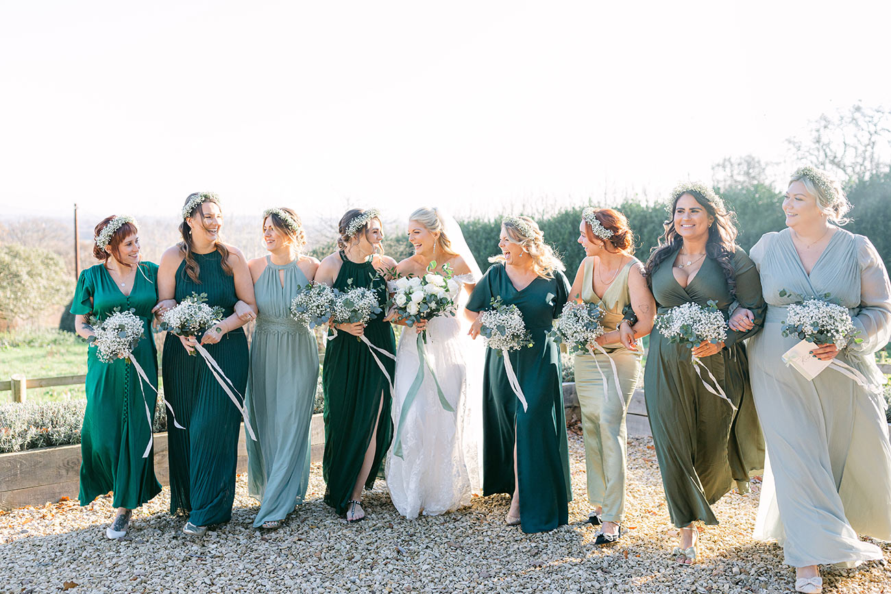 Flanked by her bridesmaids in green dresses and gypsophila flower crowns, Lottie made her entrance to the ceremony in a romantic lace gown, topped with a golden vine hairpiece made by her mum. “We were all nervous and giggling and it was just wonderful,” she reminisces.