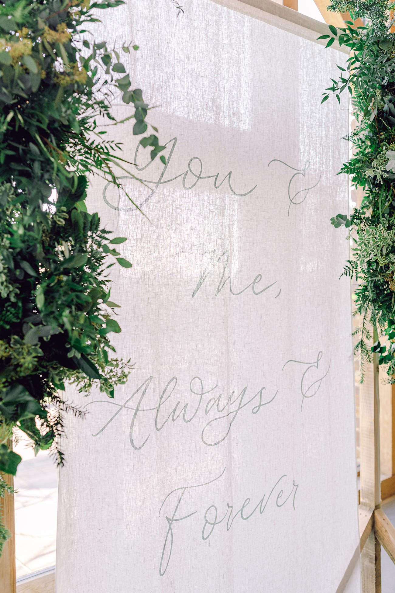 The focal point of the ceremony, a linen banner with ‘You and Me, Always and Forever’ carried the lyrics of their first dance song by The Wannabes. “It’s ‘our song’ – and it starts off wonderfully slow so I knew it was a corker for when it all kicks off and our friends and family could join us on the dance floor,” says Lottie. After the cutting of the cake, the dancing continued long into the evening, punctuated only by a sparkler shot. “I had my heart set on this!” she reflects.