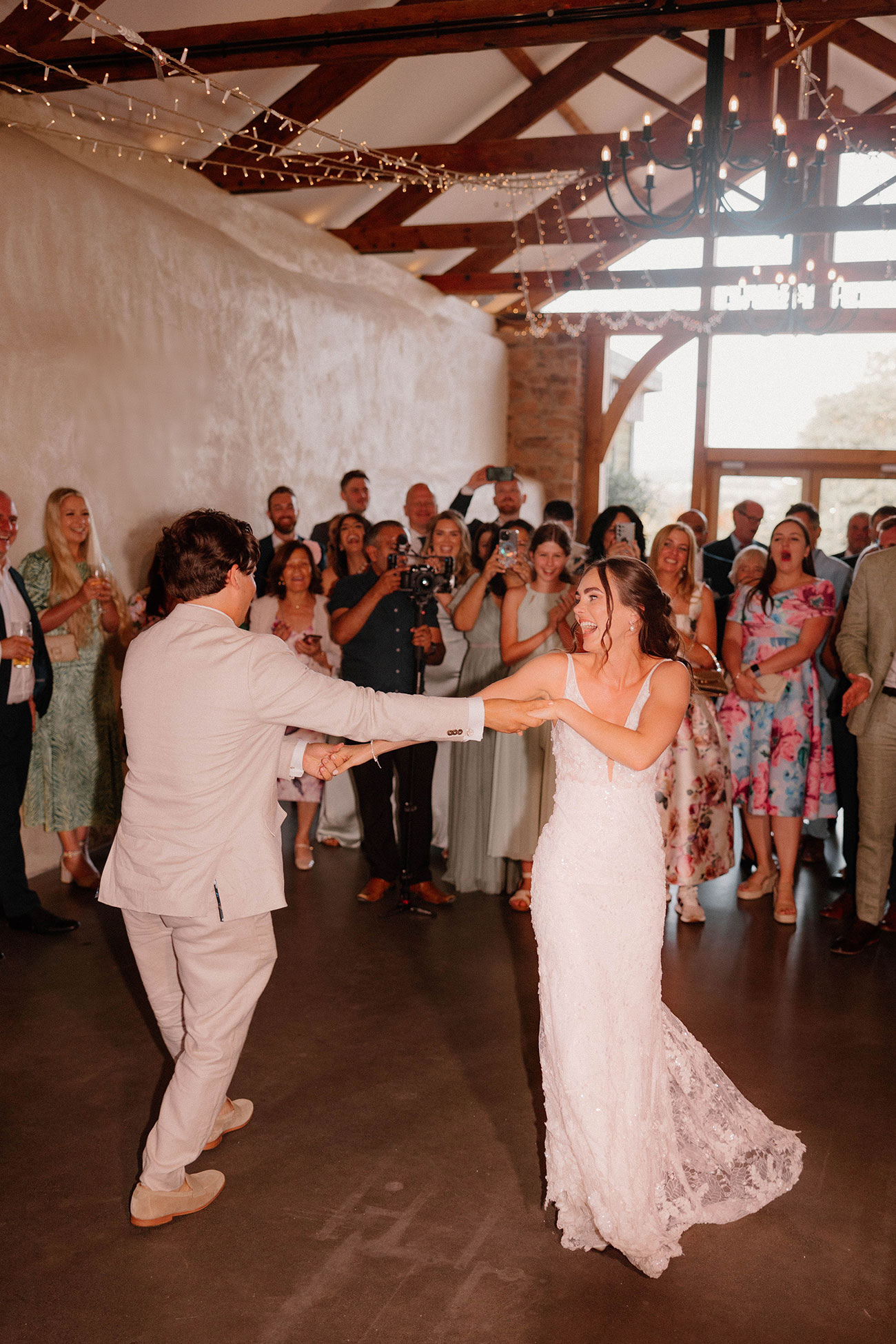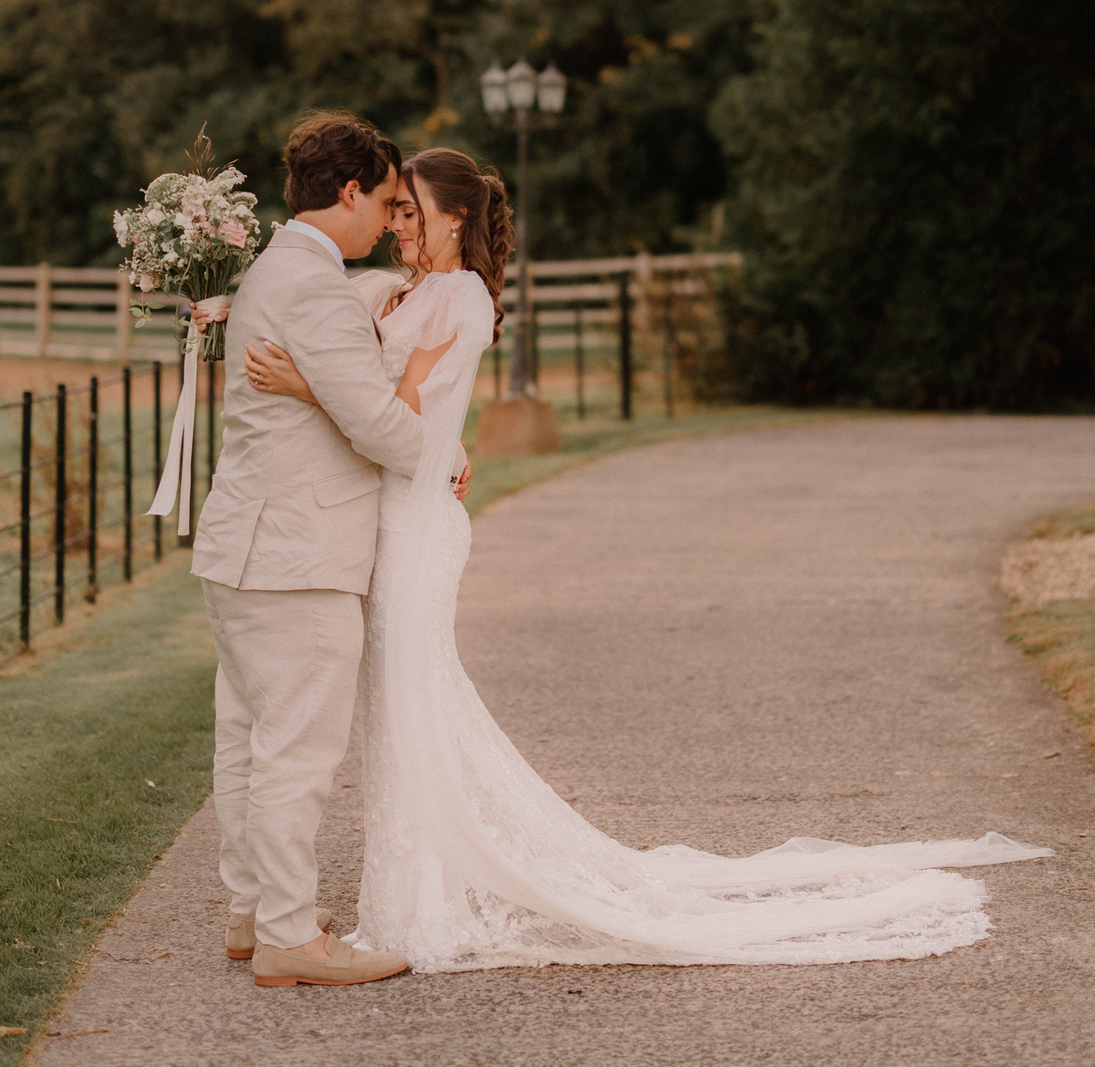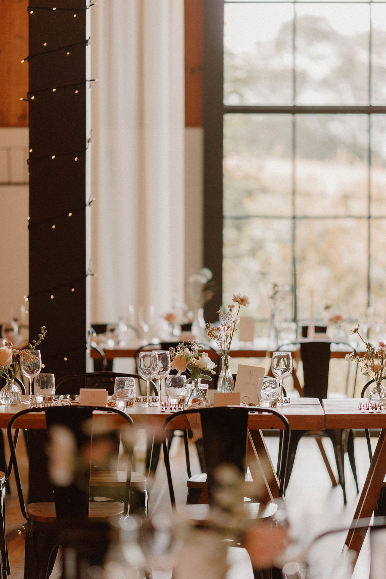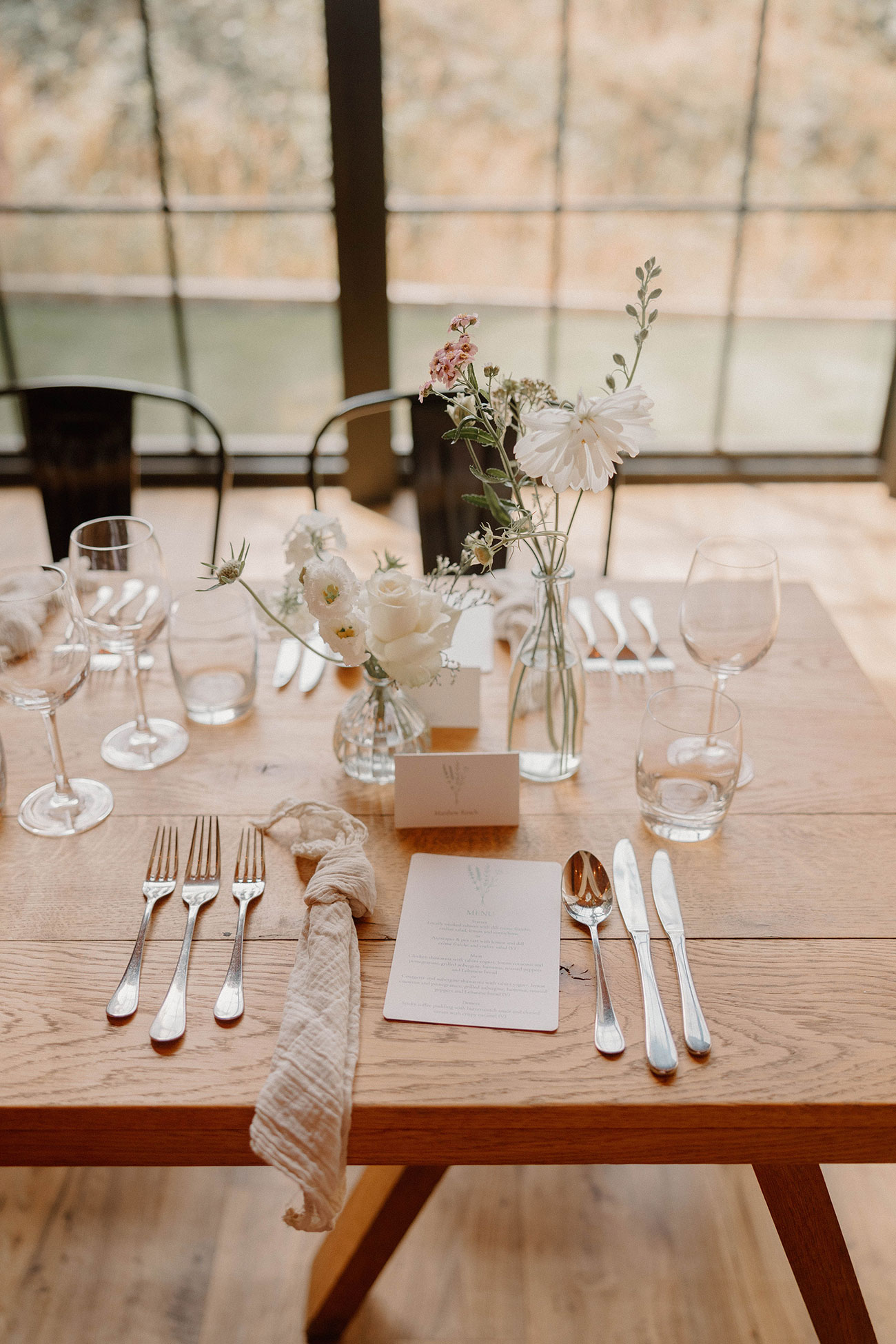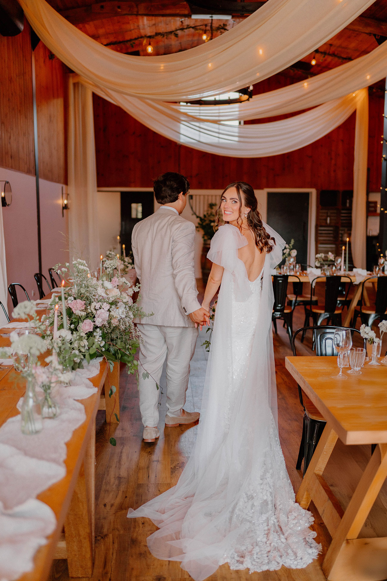 The couple then stole away for a private viewing of the Stable Barn where the reception was to be held. The tables were decorated with clusters of bud vases and candles in soft colours, while drapes suspended from the ceilings added to the natural, dreamy aesthetic. “It looked breathtaking and it was also really lovely to have a bit of time to ourselves!” she says, looking back on one of her favourite moments from the day.
