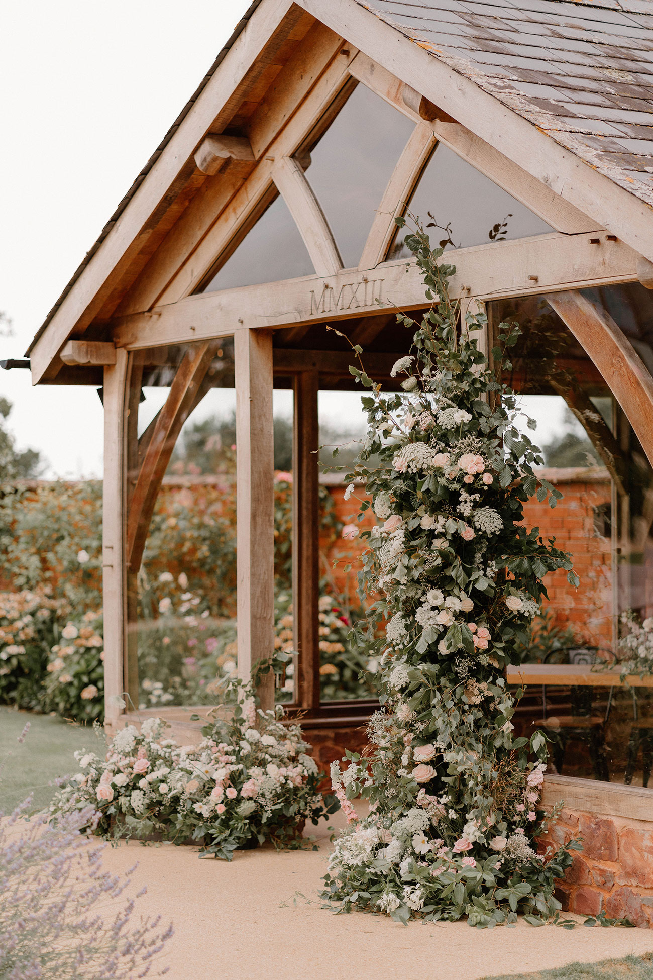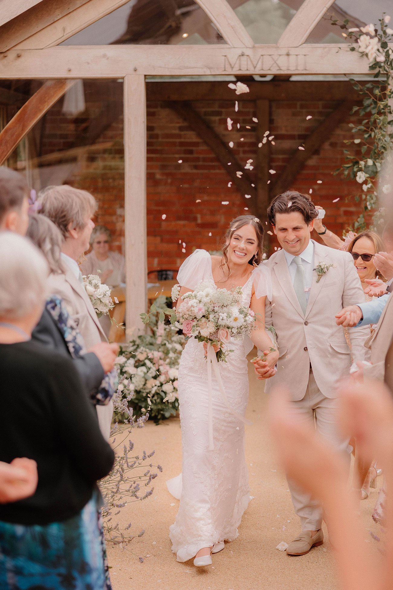The couple exchanged their self-penned vows beneath the oak arbour, which was beautifully decorated with a broken arch of pastel blooms and foliage, with vistas across the Blackdown Hills beyond. “It was really special being able to make our vows in front of our family and friends,” reminisces Anna.