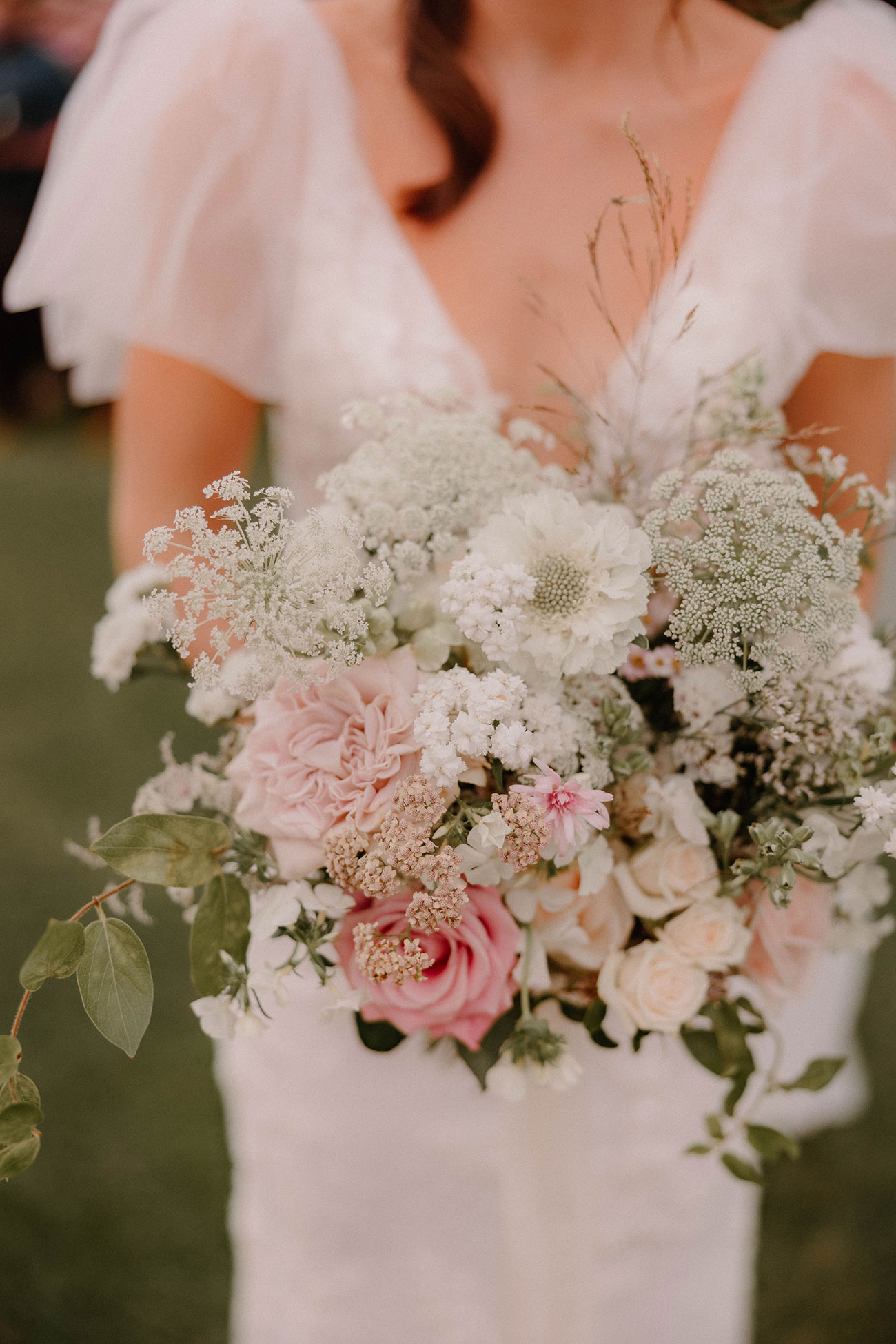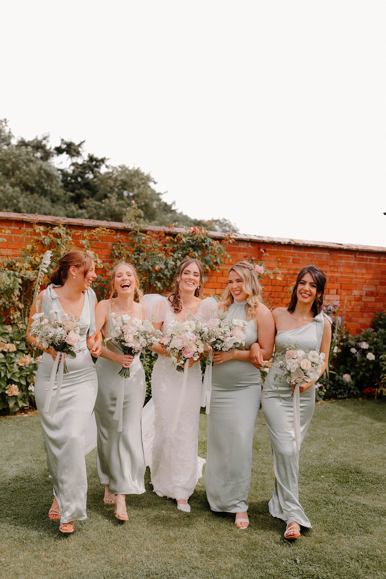 Flanked by bridesmaids in light sage green frocks, she complemented her bridal ensemble with a bouquet of seasonal natural flowers in soft shades of pink, cream and white. “I loved my bouquet so much one of my lovely bridesmaids sent it off to be dried, pressed and framed so I can treasure it forever.”