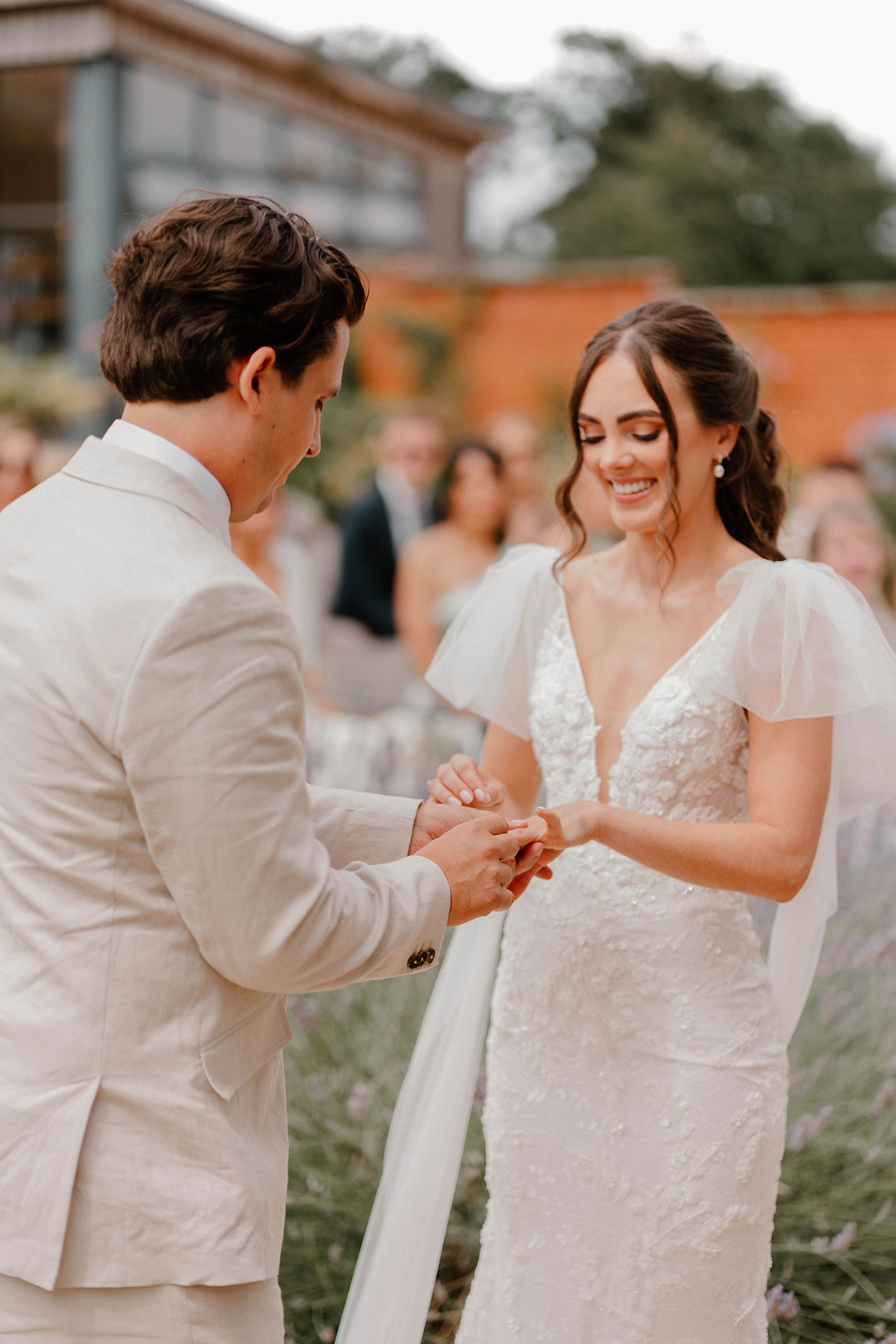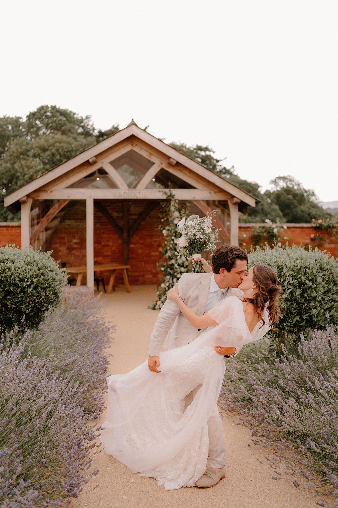 “We had dreamt of a relaxed outdoor, summer garden wedding and the weather was in our favour,” says Anna, looking back on how their wedding day began. An early afternoon ceremony saw Anna gliding down the lavender-lined aisle of the walled garden in a dreamy lace dress by Made With Love with detachable tulle wings – “I thought it was a bit different to having a detachable veil!” she reflects.