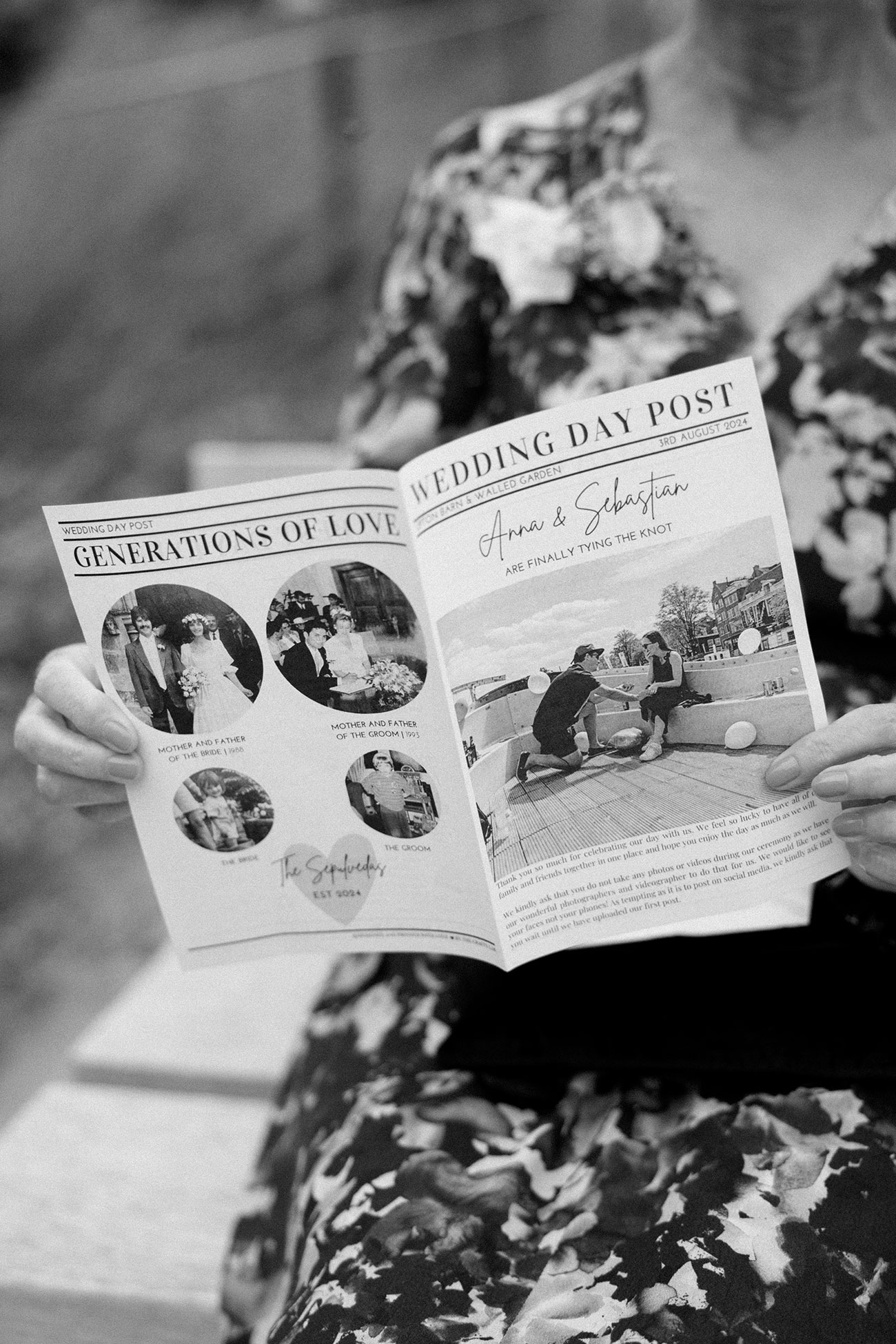 A drinks reception with giant Jenga in the walled garden followed, allowing the newlyweds and their guests to enjoy the picturesque surroundings in the sunshine. “We also had wedding newspapers, which added a personal touch and our guests enjoyed reading them,” says Anna.
