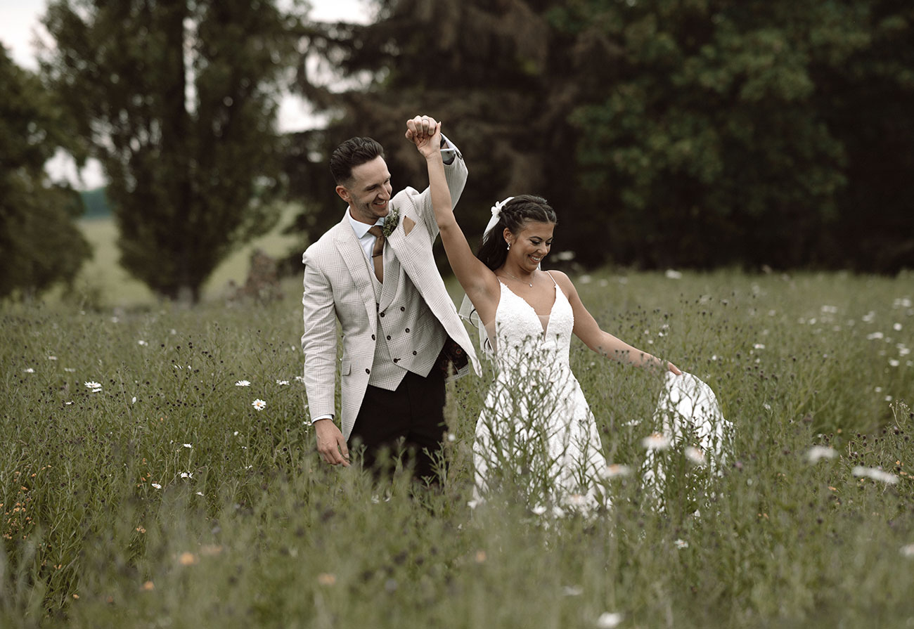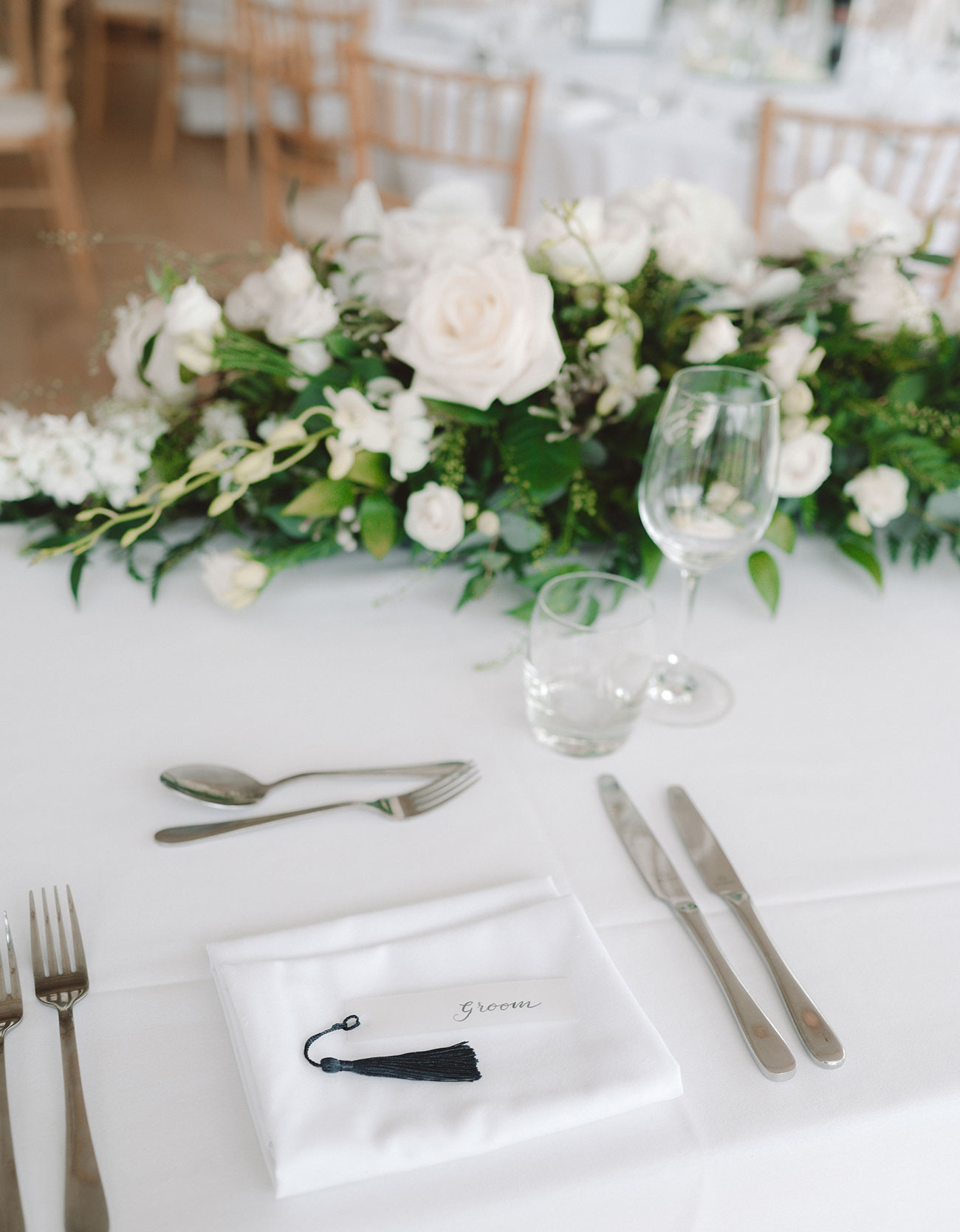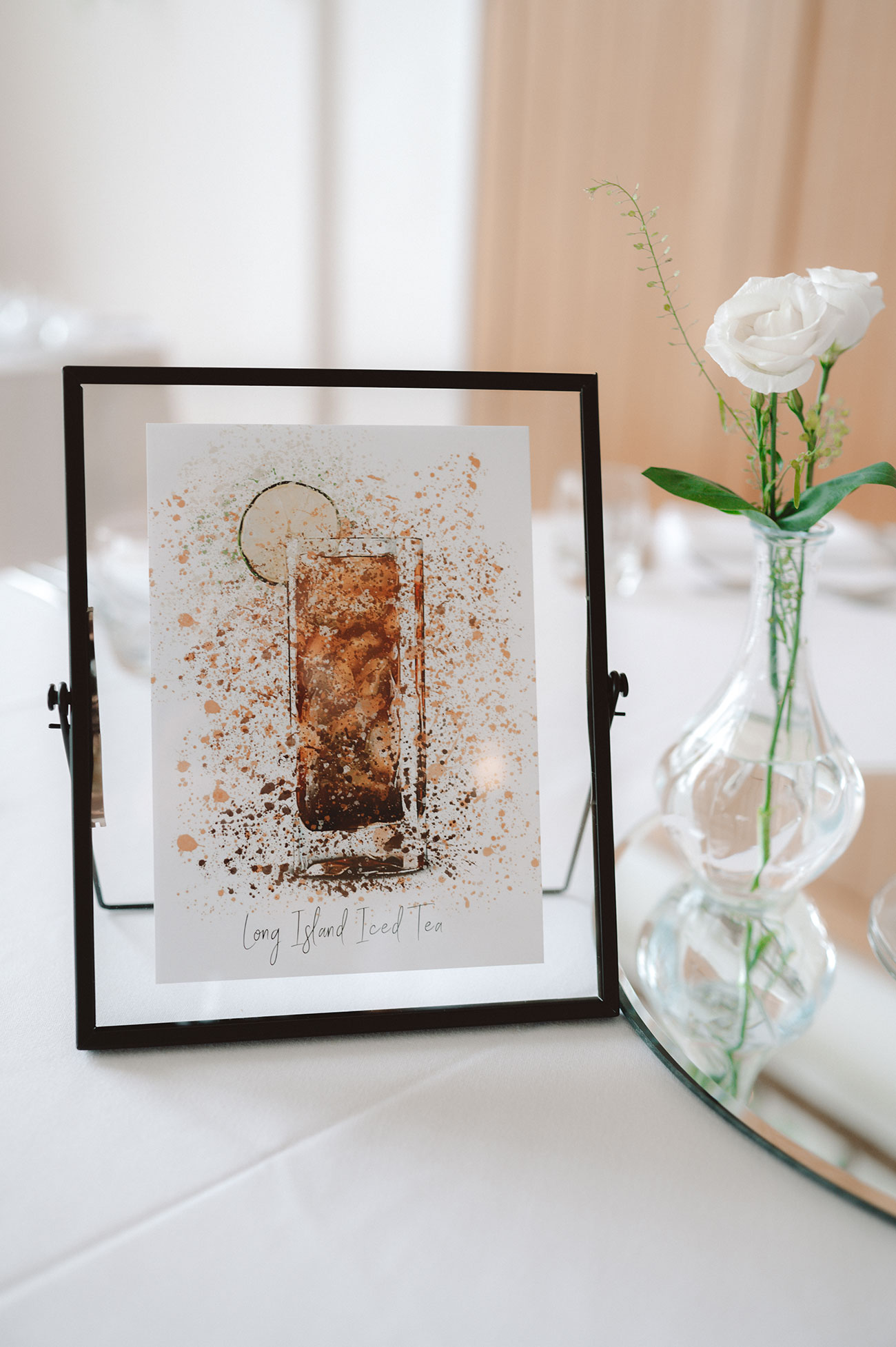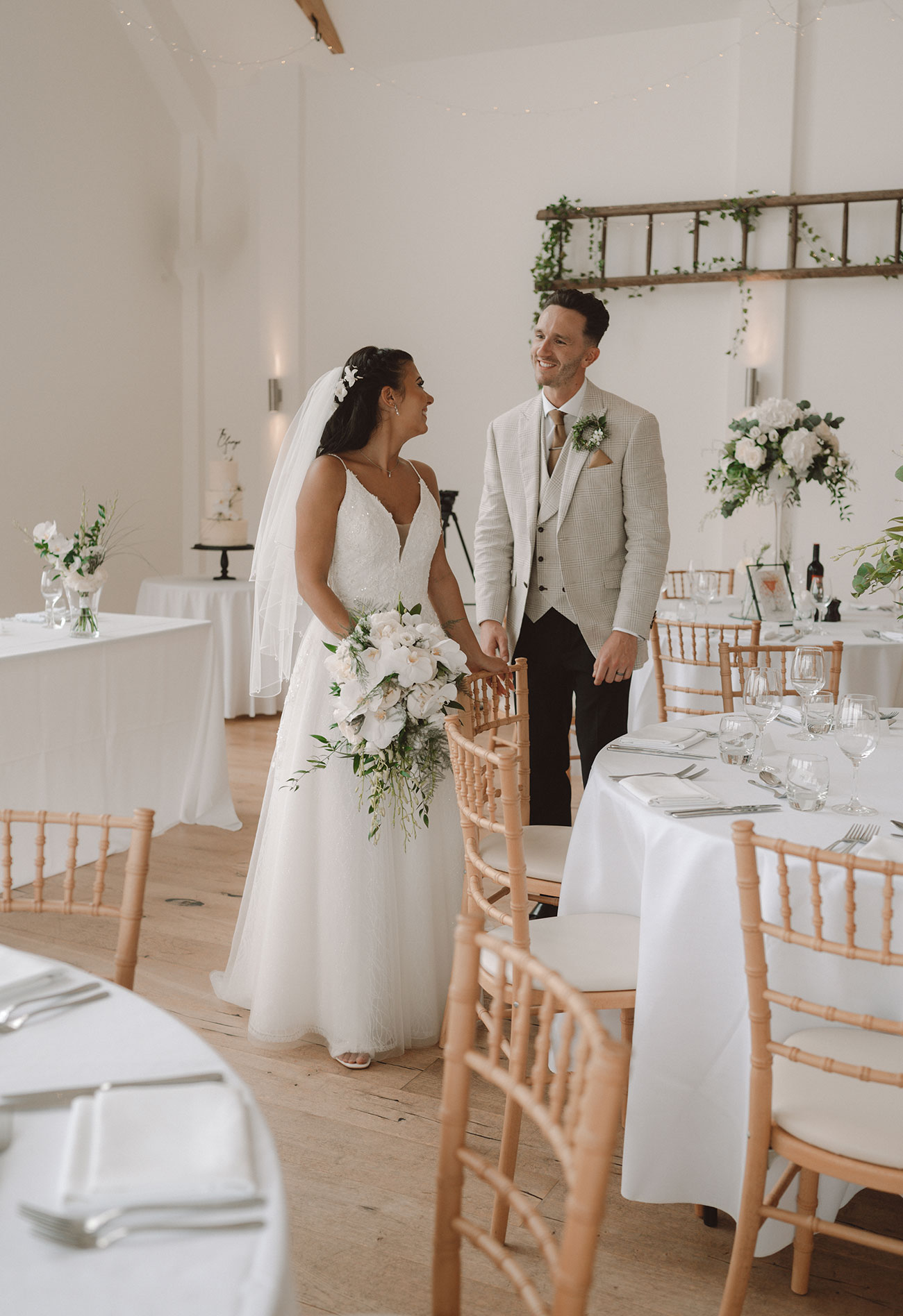 As soon as they set eyes on Harefield Barn, they knew it would be a dream setting for their wedding. “The views and scenery were simply breathtaking and proved to be even more beautiful on the big day,” says Ioan. Choosing a minimalist theme of white and neutral colours, black accents made a style-pleasing statement, together with a series of personal touches as water art cocktail images for the table names - "Ioan is known for making a mean cocktail!" says Kiera.