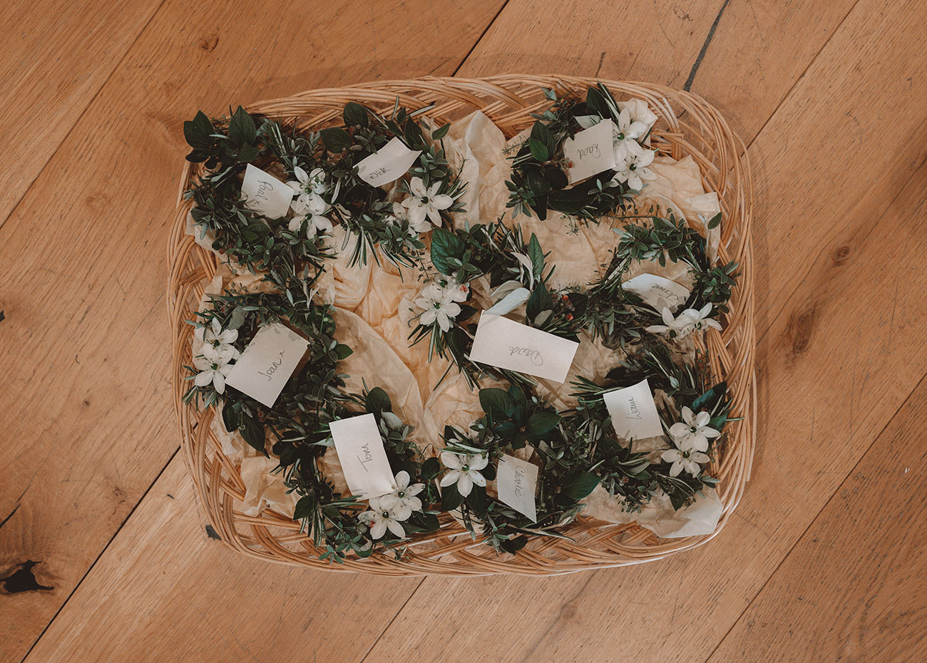 Flowers by Ioan’s mum made for “incredible centrepieces”, with a trailing bouquet of orchids, peonies, roses, lisianthus and berries, while hydrangeas and larkspur also featured in the floral arrangements, as well as lush foliage including soft ruscus, eucalyptus, thlaspi and fragrant rosemary.