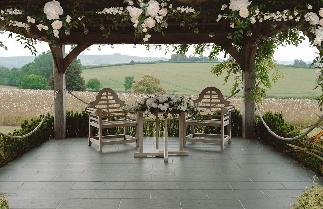 The views also took centre stage during the wedding breakfast, when guests tucked into dishes such as chicken liver parfait, slow-roast Venn Farm pork belly and chocolate torte amongst gorgeous florals framing the countryside beyond.