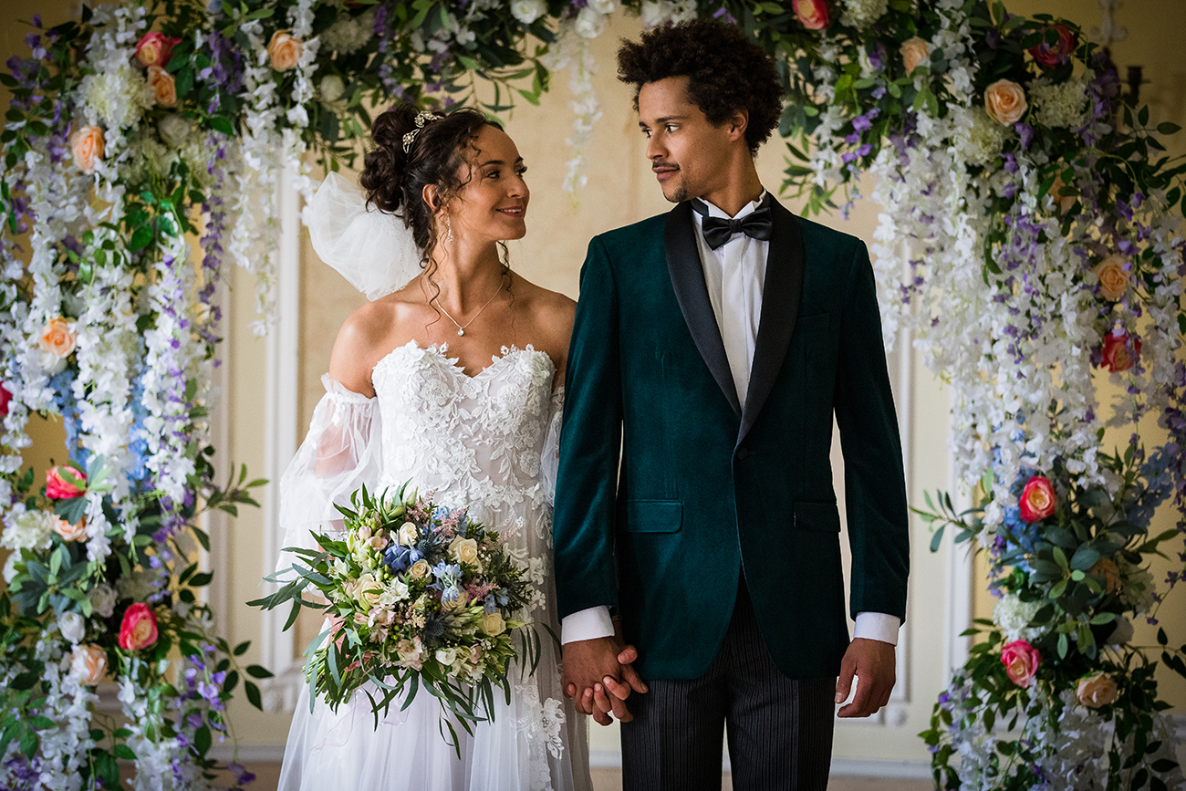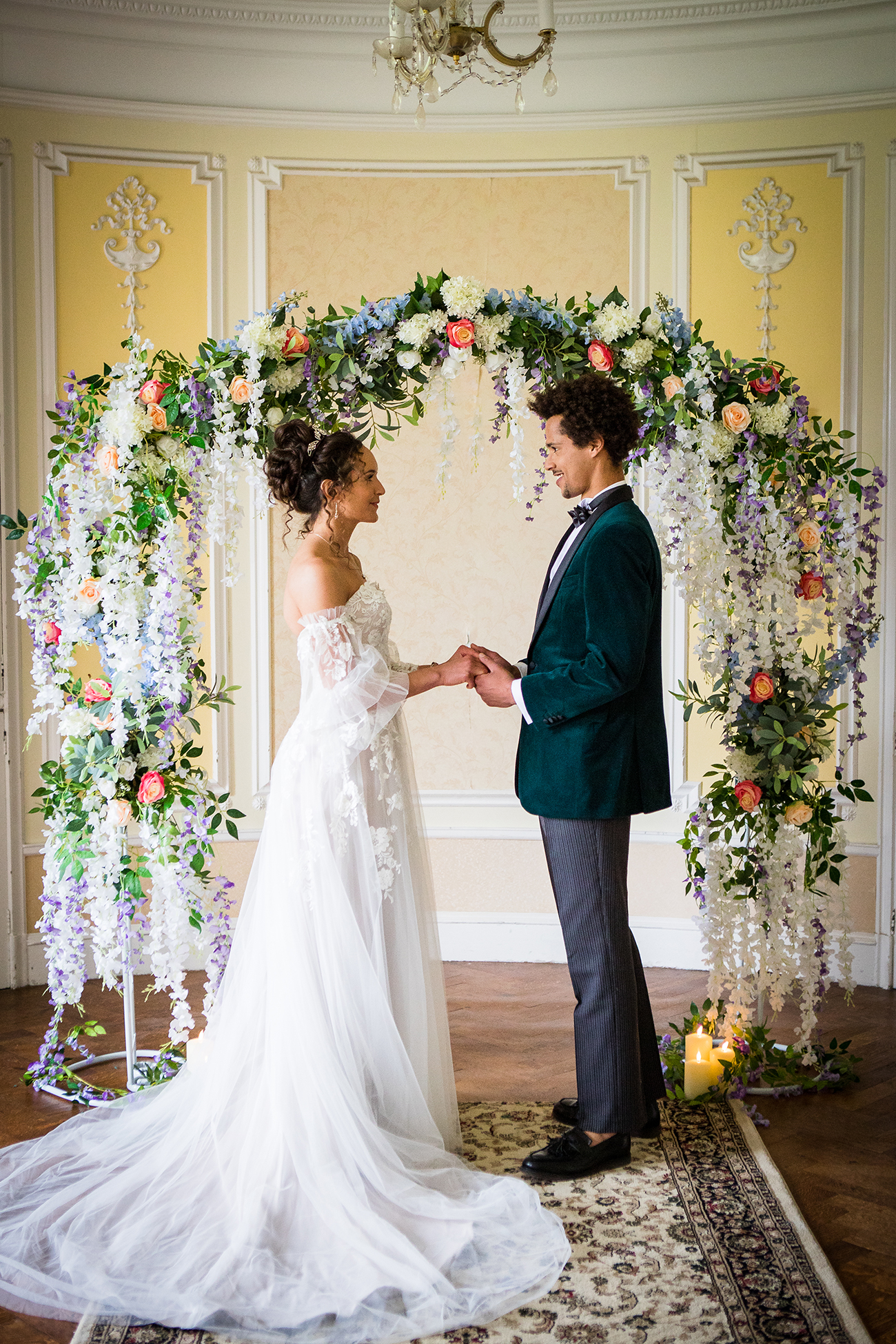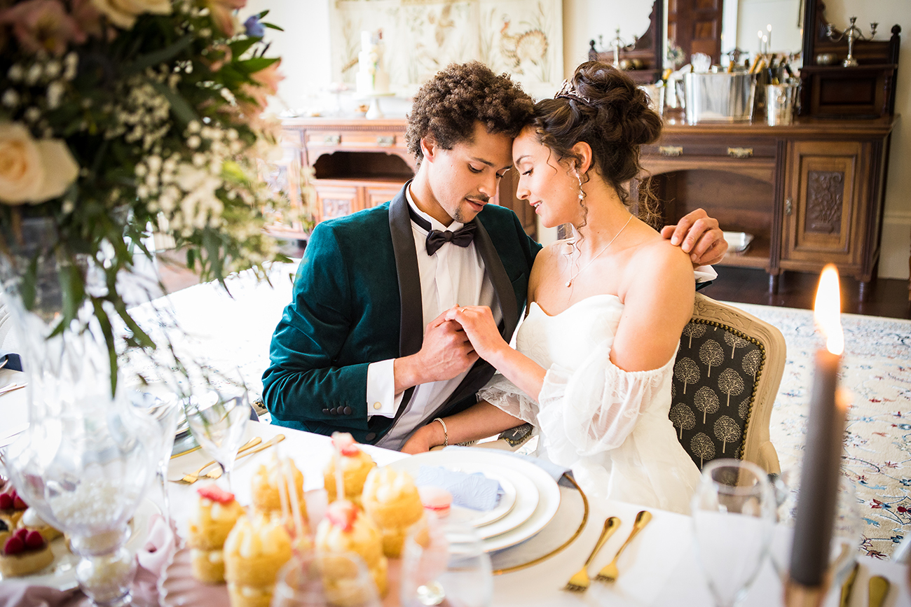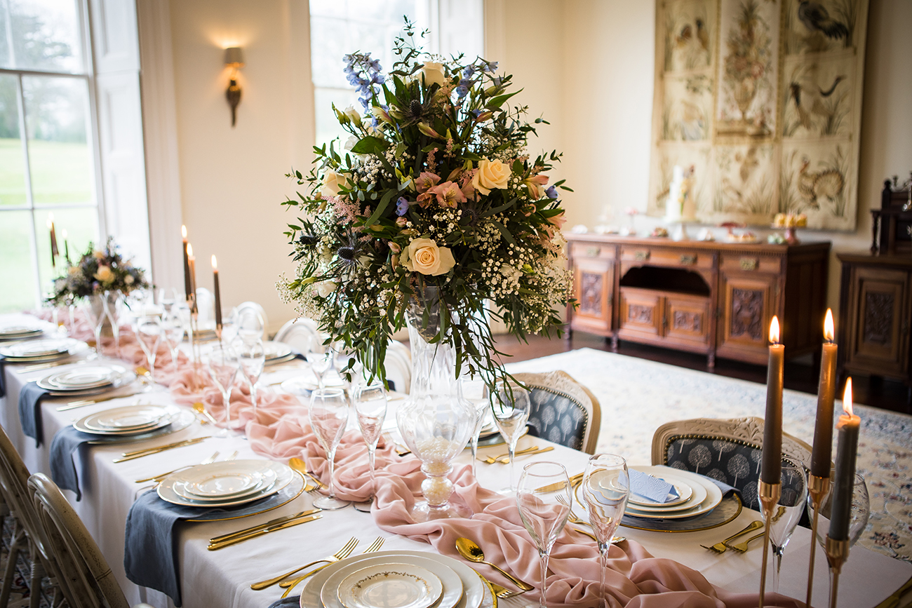 Echoing the period drama, the mood is one of over-the-top glamour, while the palette is soft and muted with mixes of pinks, blues, peach and white accented with gold. The ceremony takes place beneath an arch of trailing wisteria and blooms in the dreamlike Ballroom, styled with blossom trees and candles. In the Grand Dining Room, a table dressed with fine tableware, shades of Wedgewood blue and dusky pink, and decadent arrangements of flowers makes a lavish setting for a tea party of sweet delights – think blancmange, jelly, macarons and dainty tarts – all bathed in candlelight for maximum romance.