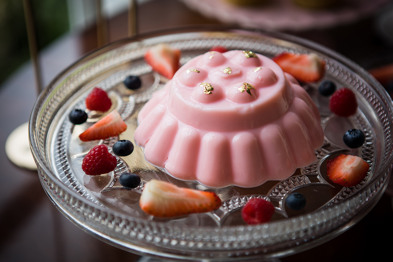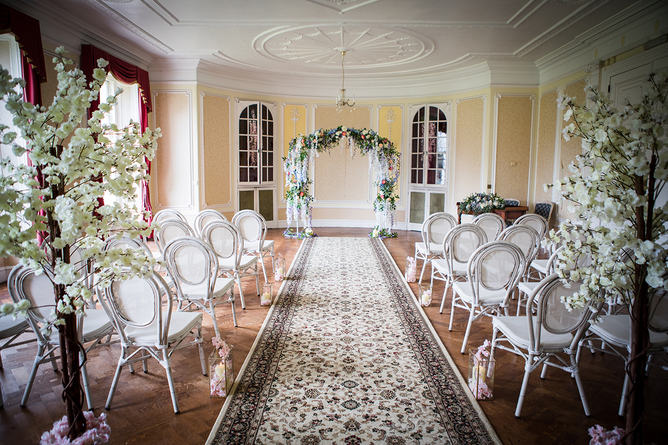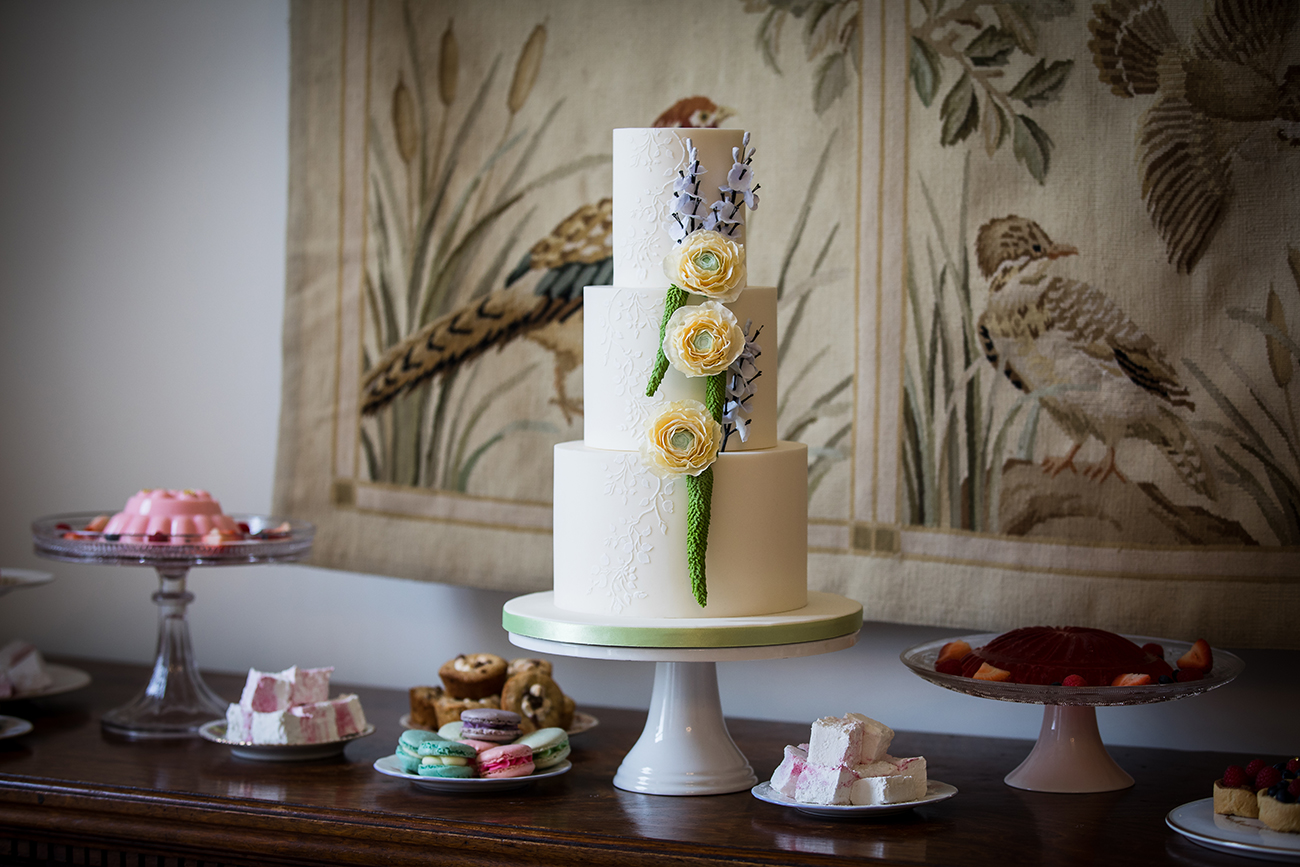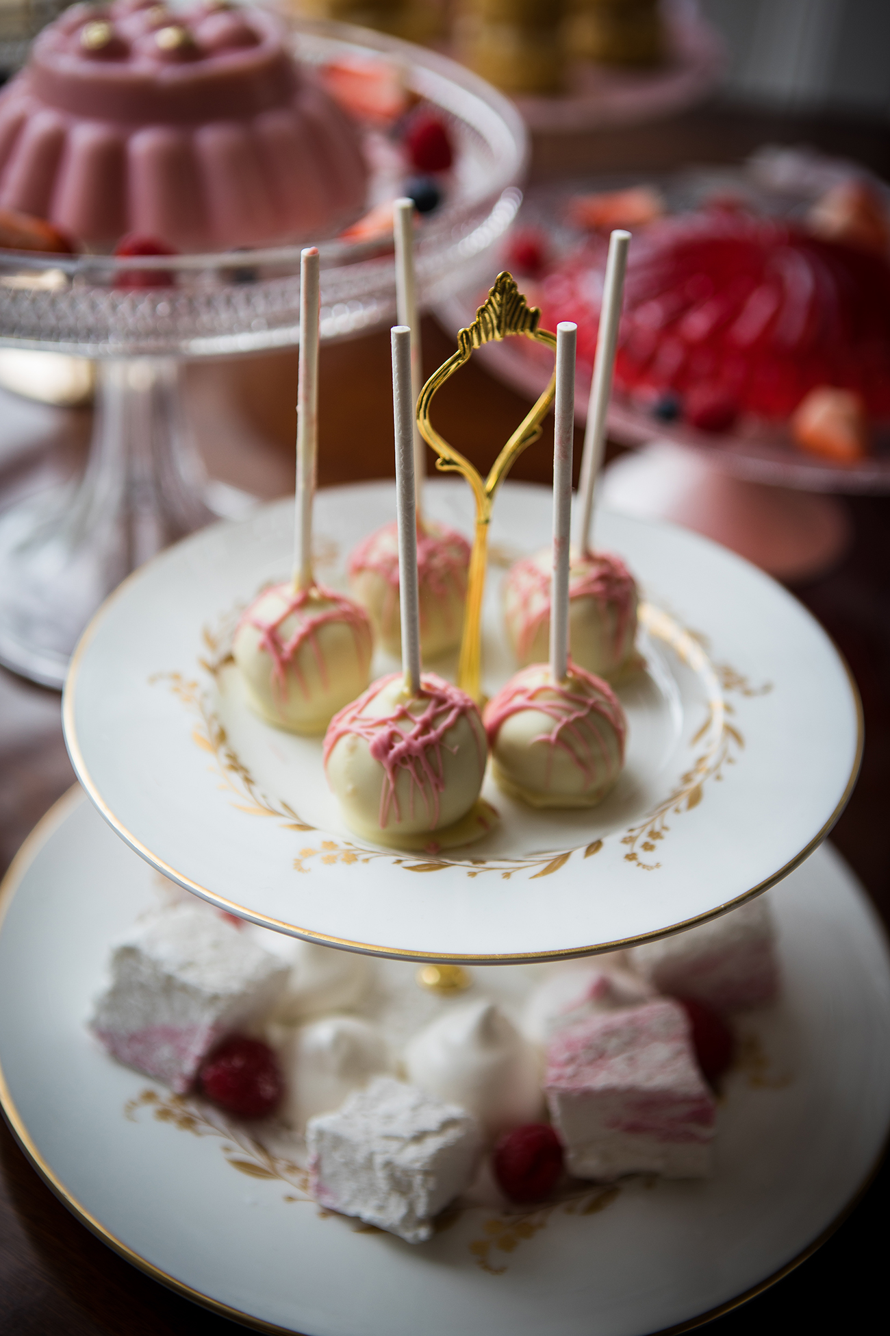 Echoing the period drama, the mood is one of over-the-top glamour, while the palette is soft and muted with mixes of pinks, blues, peach and white accented with gold. The ceremony takes place beneath an arch of trailing wisteria and blooms in the dreamlike Ballroom, styled with blossom trees and candles. In the Grand Dining Room, a table dressed with fine tableware, shades of Wedgewood blue and dusky pink, and decadent arrangements of flowers makes a lavish setting for a tea party of sweet delights – think blancmange, jelly, macarons and dainty tarts – all bathed in candlelight for maximum romance.