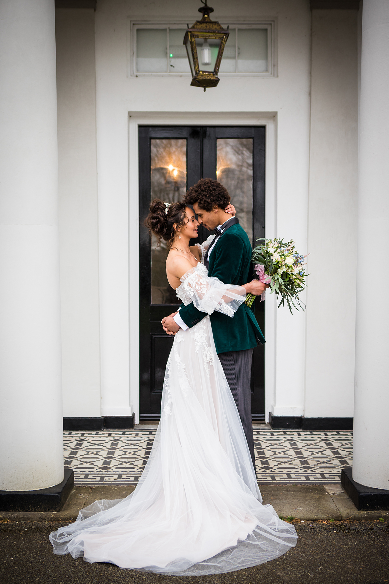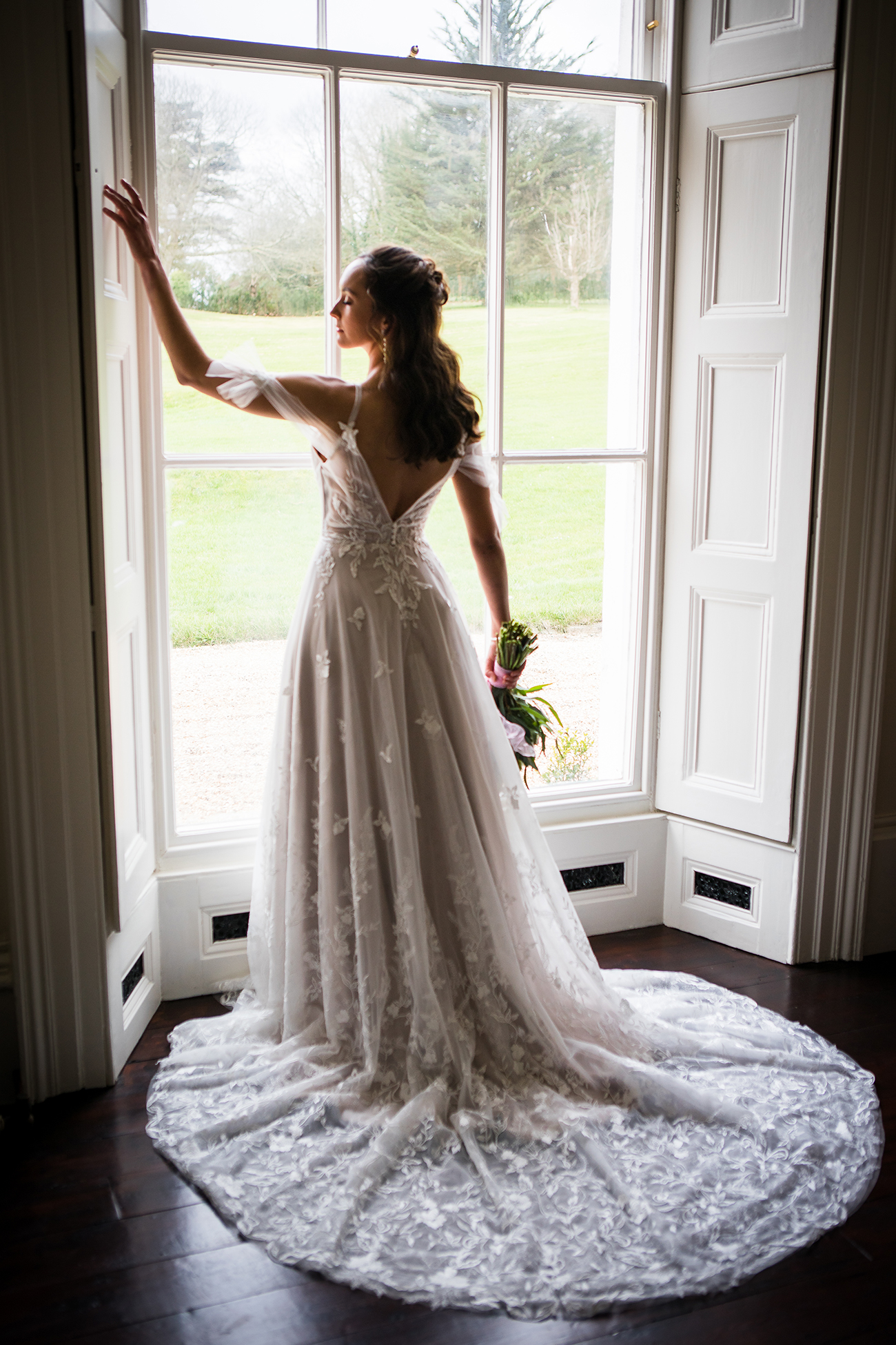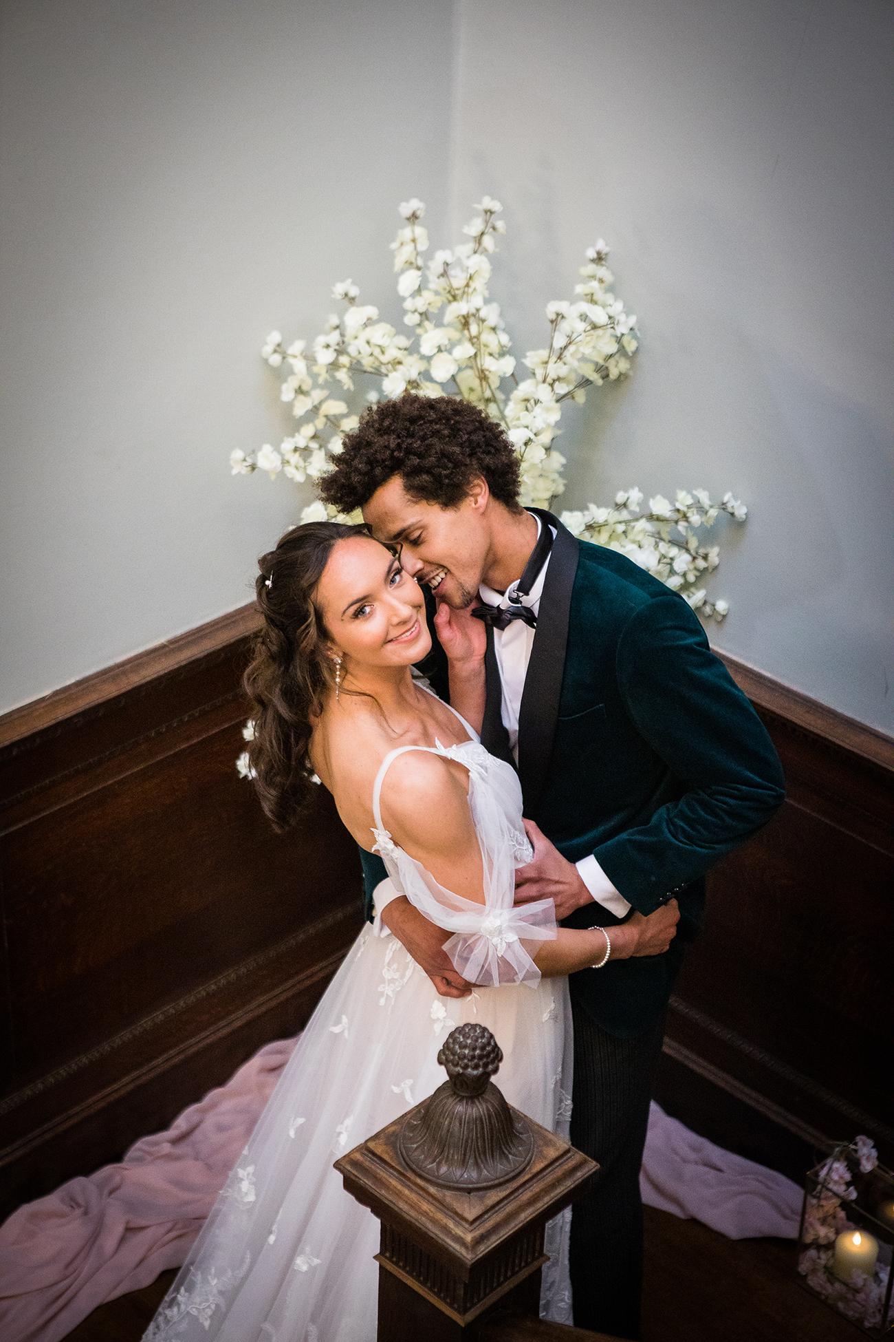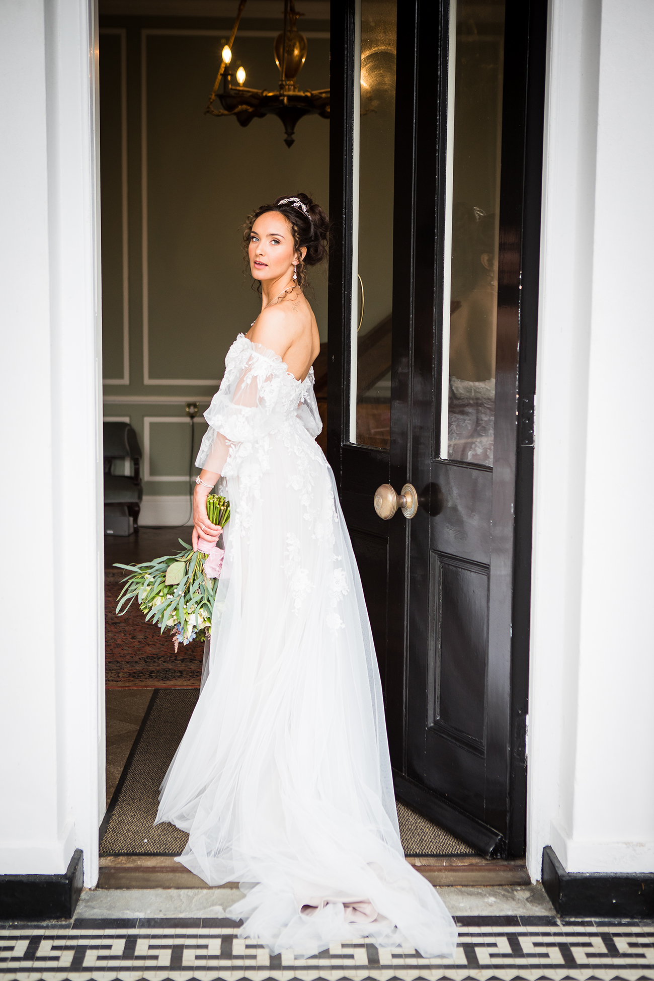 New wedding venue Moreton House in North Devon makes a dream setting for this Regency inspired styled shoot. From bridal gowns to colour palettes, the impact of Bridgerton has been far-reaching in the wedding world, and the elegant, light-filled rooms, sweeping staircase and halls of the Georgian stately home make the perfect canvas for a wedding scene rich in nostalgic romance with a luxe modern twist.