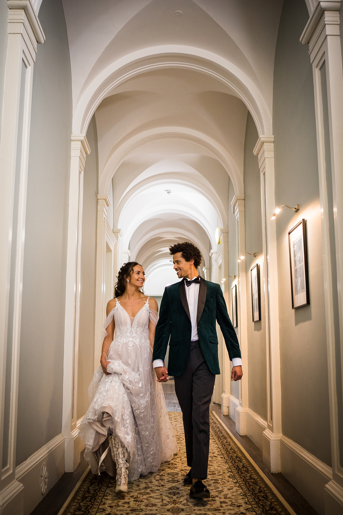 Every inch the contemporary duke, the groom dons a green velvet tuxedo and pinstripe trousers. The bride, meanwhile, wears a series of modern gowns inspired by the Regency era with romantic silhouettes and fanciful detail; finished with cascading period curls, fresh, barely-there make-up, a tiara and lace boots, the love story Modern love story played out in gorgeous Georgian surrounds.