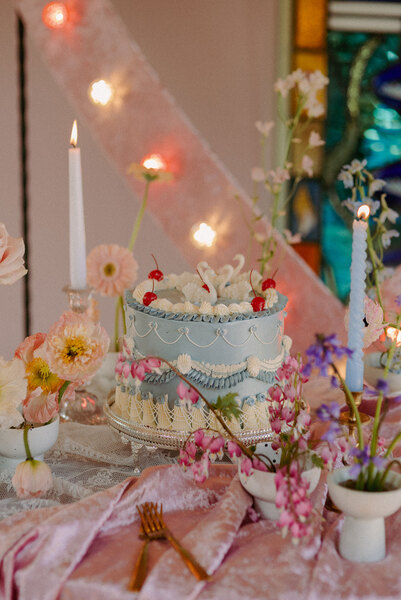 Every detail was chosen to bring playful, stylish energy to the scene – and the cakes showcase this beautifully. “I incorporated lots of frills and ruffle vintage piping, over-the-top accessories and bright red cherries to give the cakes a real Vegas flair,” says Lily of The Imaginary Bakery.