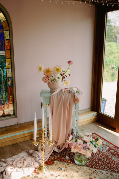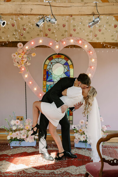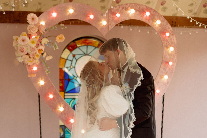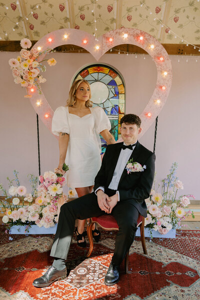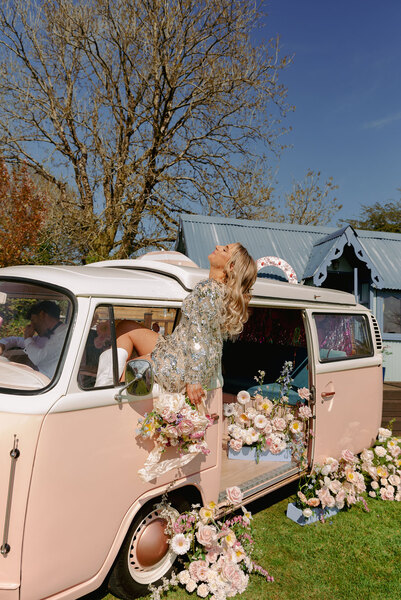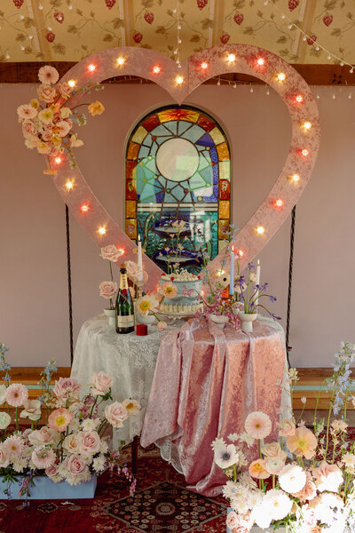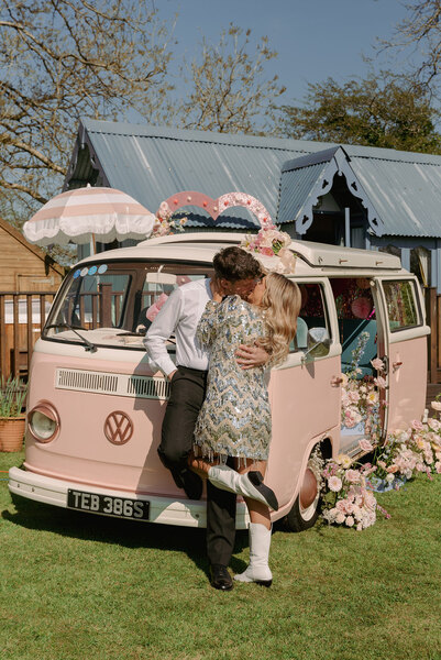 Created to showcase Birdie, the fabulous campervan photo booth, the team of creatives embraced all things Vegas: crushed velvet love hearts, a retro record player and perfectly contrasting pastel blooms. “I've always been into kitsch retro and Vegas vibes,” explains Kitty Orme of Birdie Photobooth & Prop Hire. “I saw our Birdie pink campervan as the perfect replacement to the classic Vegas pink Cadillac from the White Chapel.”