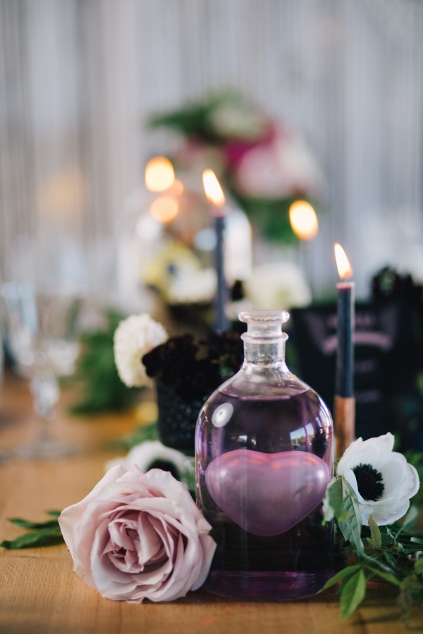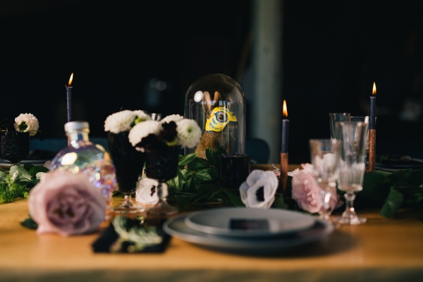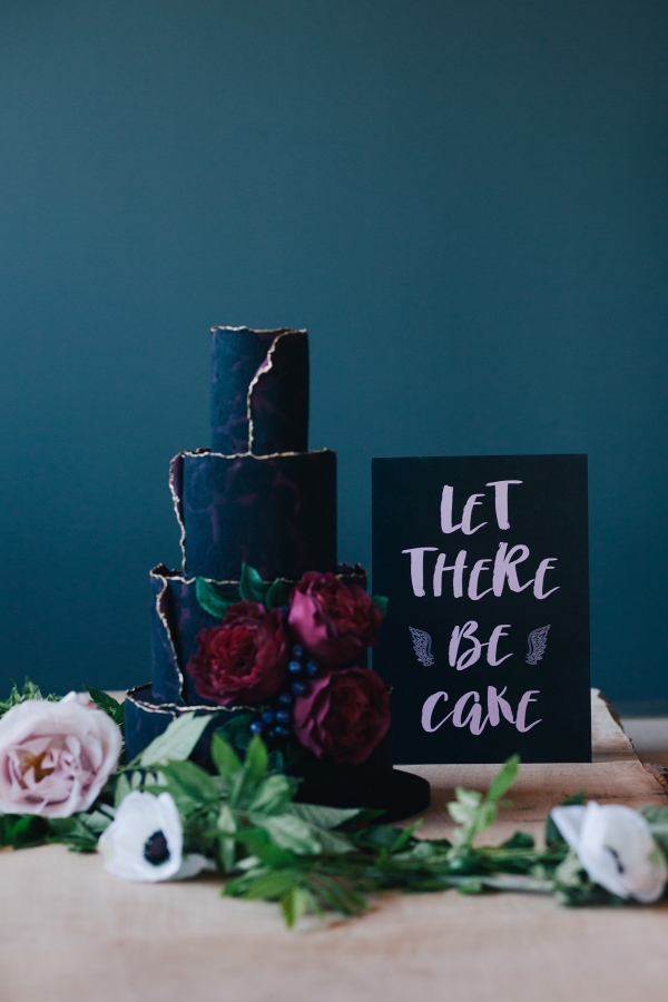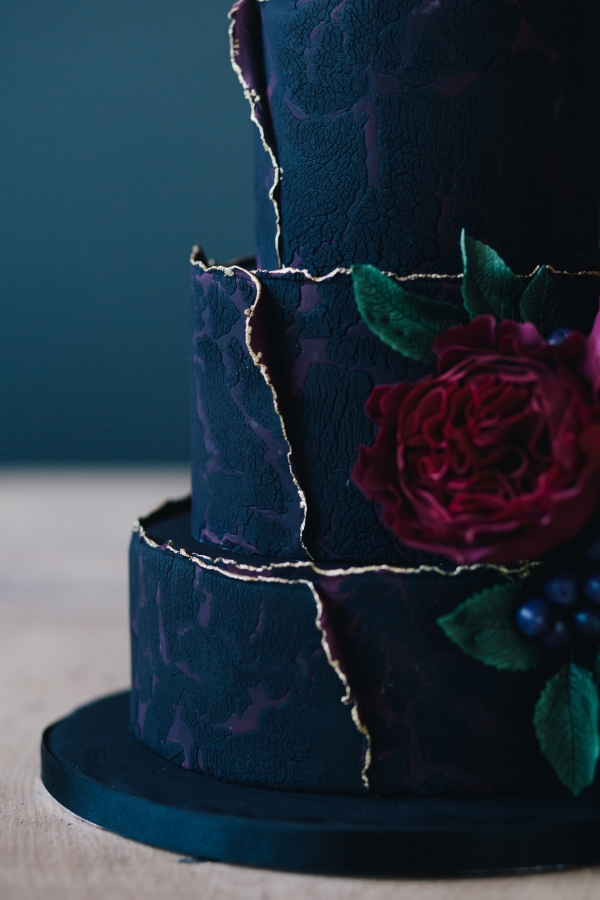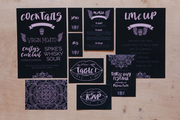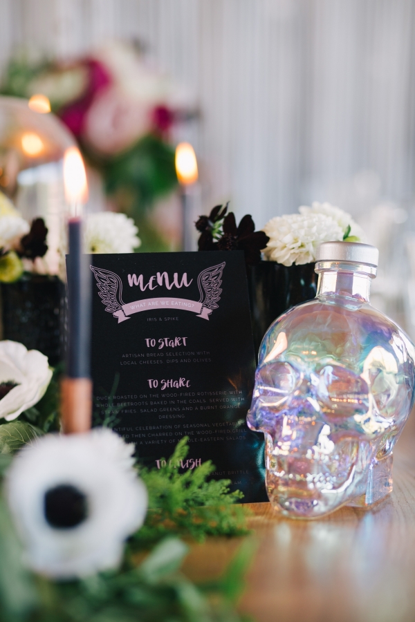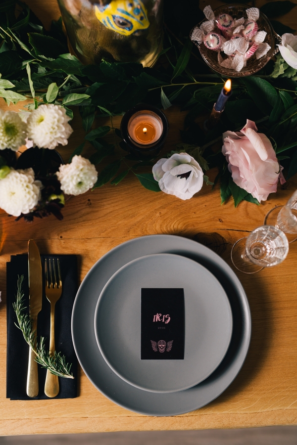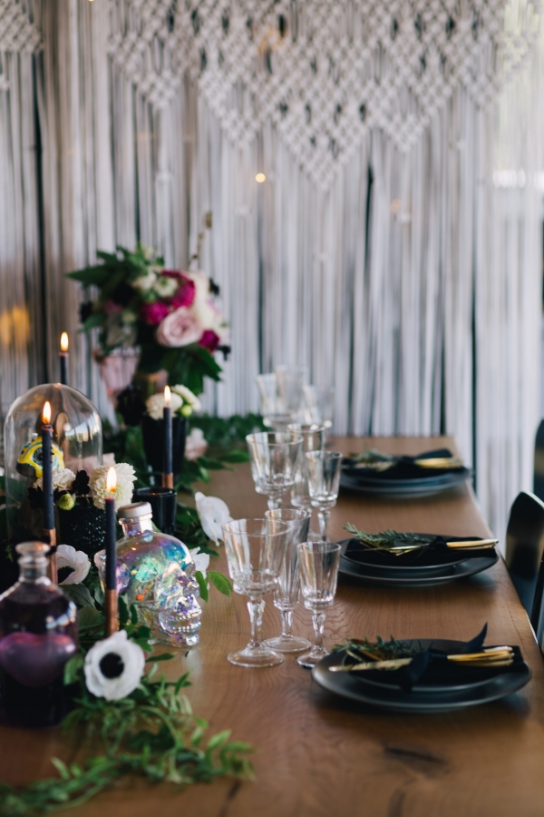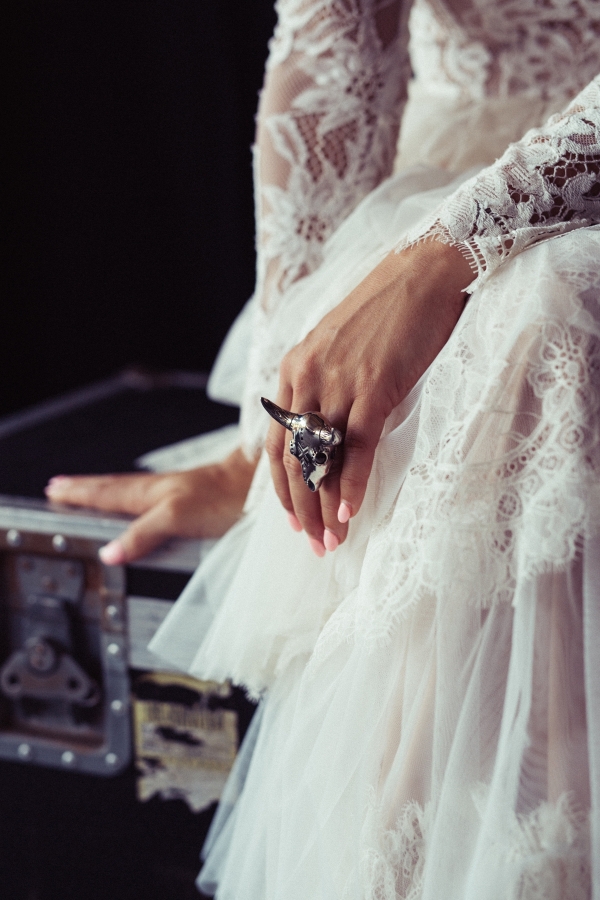The bridal look is one of vintage rock 'n' roll, with a wild edge of wow, pairing showstopping gowns of tulle, lace and sequins with leather, cowboy hats and chunky skull jewellery. The aesthetic embraces all things eclectic and edgy, dark and decadent, playing homage to the rock 'n' roll heritage of the venue. The dark cracked centrepiece cake with its gilt edging brings a depth and darkness, its blood-red blooms contrasting with the array of pretty cream and blush blossoms. From the '70s-inspired macrame hangings to crystal skulls and vintage curios decorating the tablescapes, it's a veritable treasure trove of velvety florals and fervent textures.