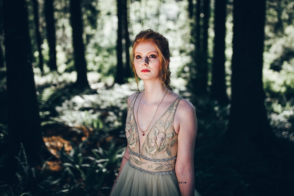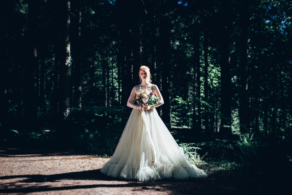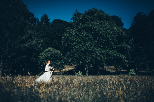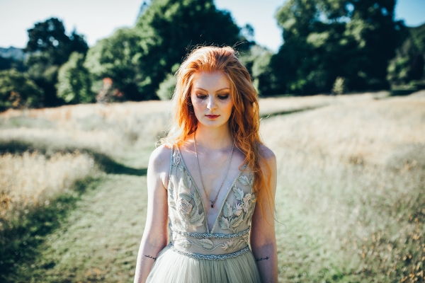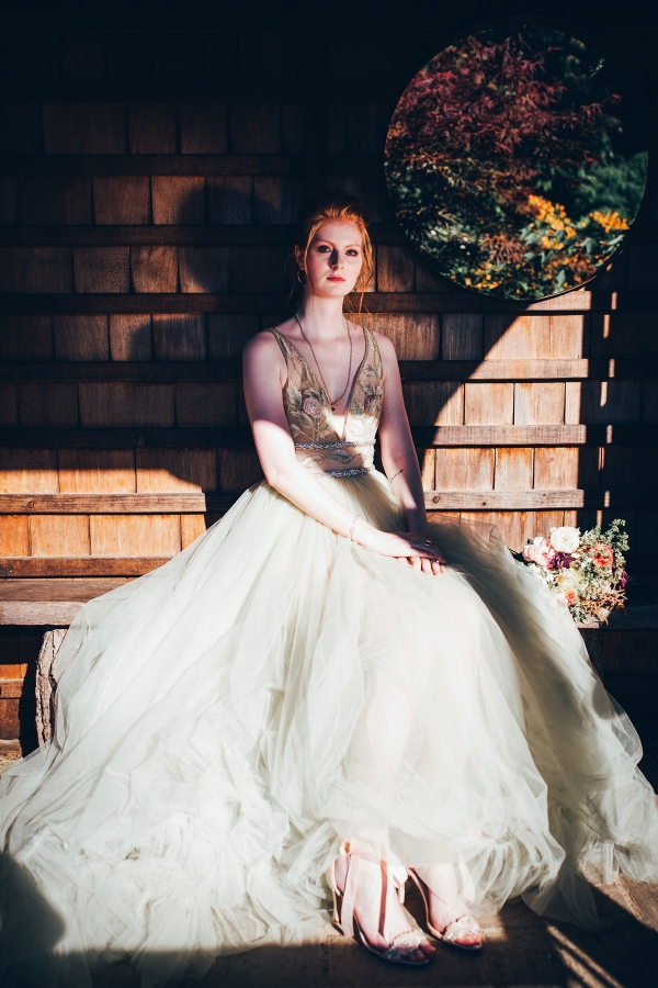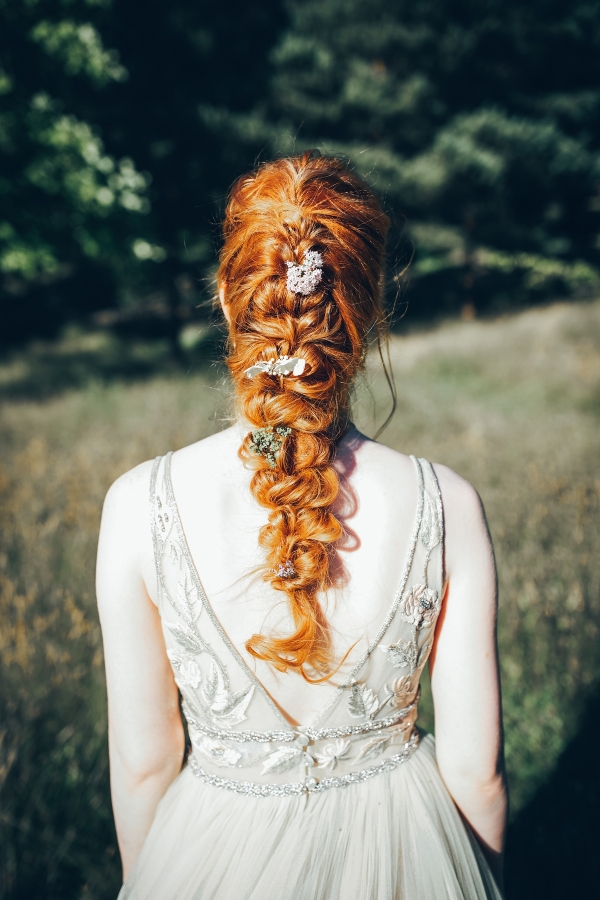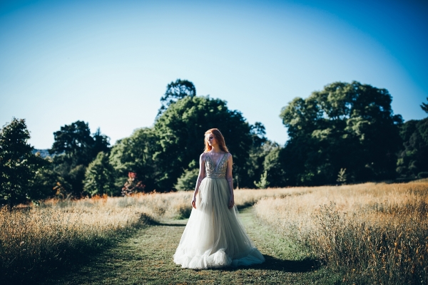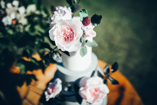 The silken petals and hues of the flowers carry through to the name of the bridal gown - 'Rose of the Forest' - while the clean whites and soft pinks of the cake echo its delicate beauty. Where the sun lands on the details - glinting on the intricately embellished bodice, shining through the opaque tulle of the skirt, drawing colour to the bohemian braid woven with dainty flowers - it highlights the tender beauty of the fairytale.