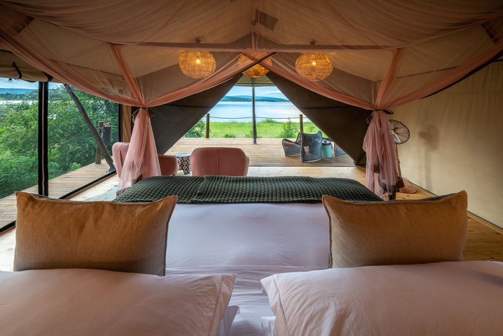 Magashi Camp - Scenic Savannah and Wetland Wilderness Wonders in Rwanda-Magashi Camp is a safari-lover's dream. Six intimate tents lie dotted in lush vegetation and boast uninterrupted views of Akagera National Park's scenic Lake Rwanyakazinga. As the sun rises across this East African savannah you will view rare species such as sitatunga. The park is home to a healthy population of lion, which after a 20-year absence were reintroduced in 2015. Otherwise elusive leopard may be seen on afternoon game drives, before soaking in the African sunset with a G&T. Magashi is located in an exclusive-use area within the park.