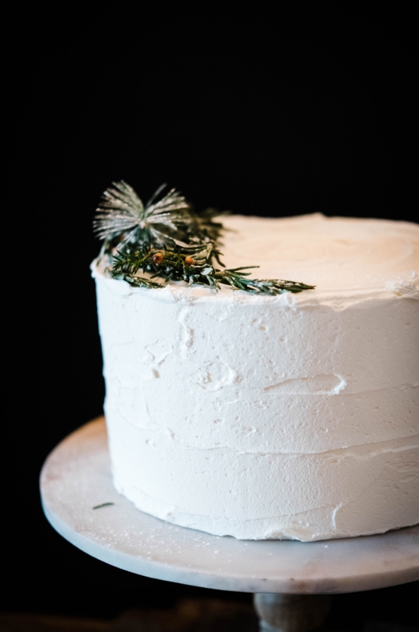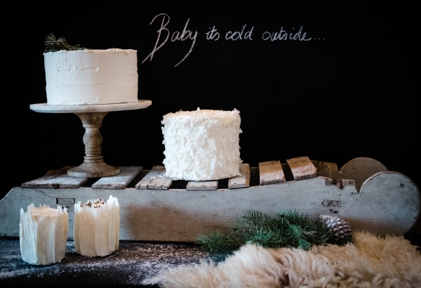 Echoing the wintery mood, the ice-white cakes sit on a traditional sledge, the black painted boards making for a simple yet striking backdrop to show off the textures and details of the snow-inspired confections.