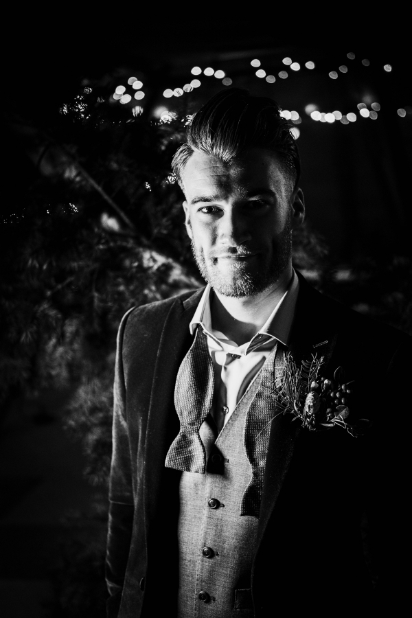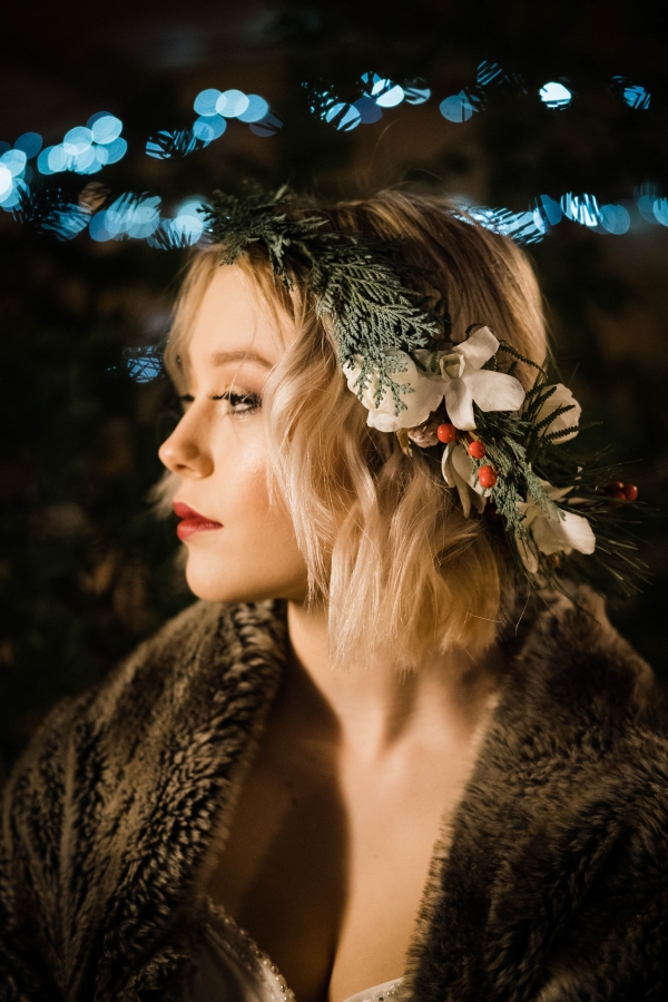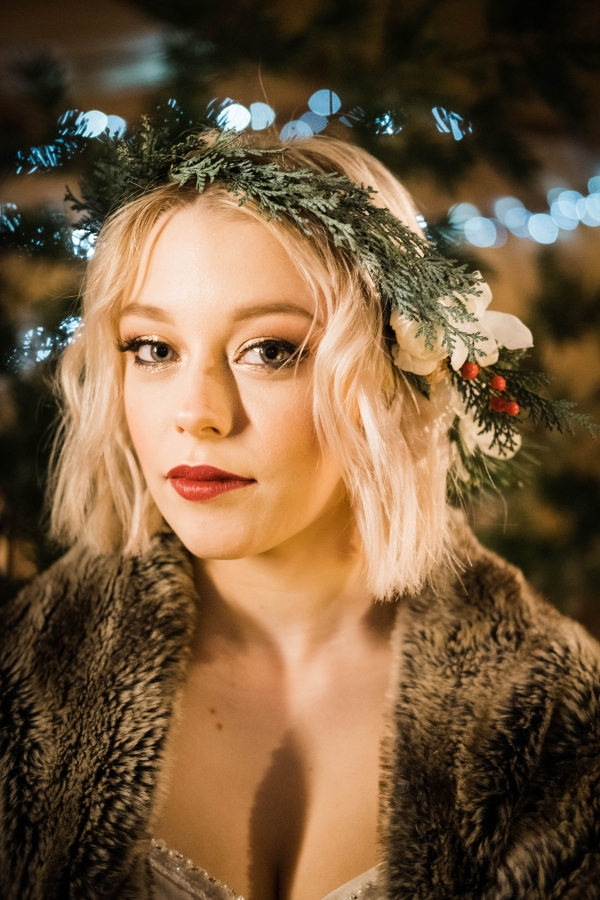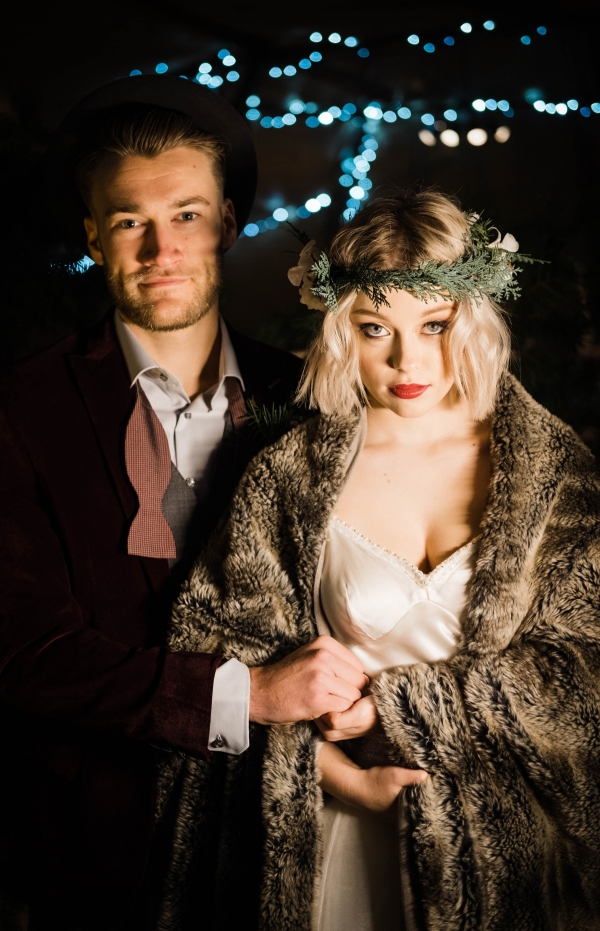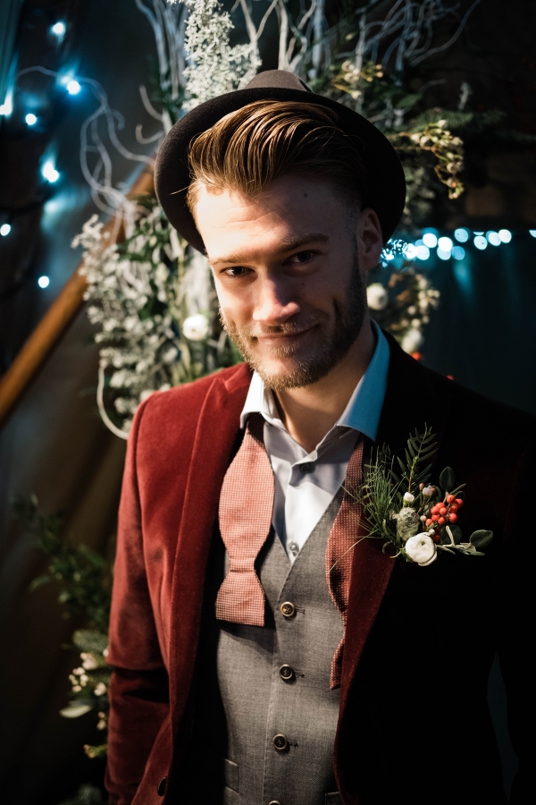 For the bridal look, the delicate detailing and full skirt of the gown are married with a tousled bob and frosted yet dewy make-up, a full red lip adding to the wintery glamour, complementing the floral accents and the groom's velvet jacket.