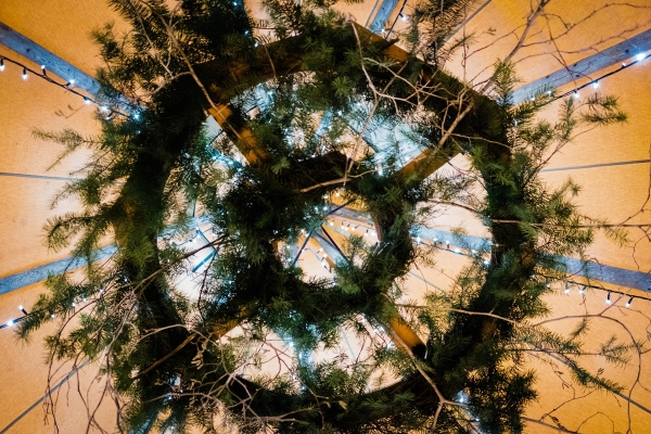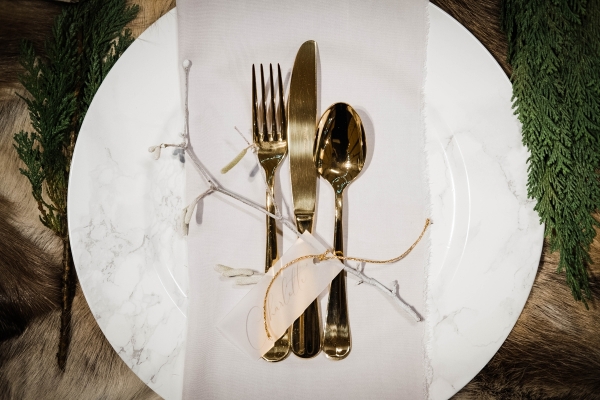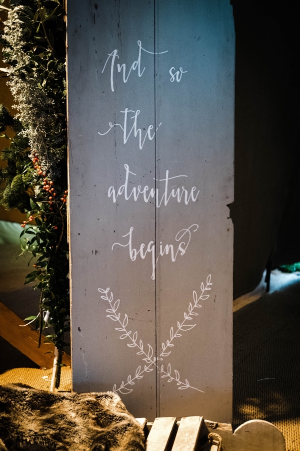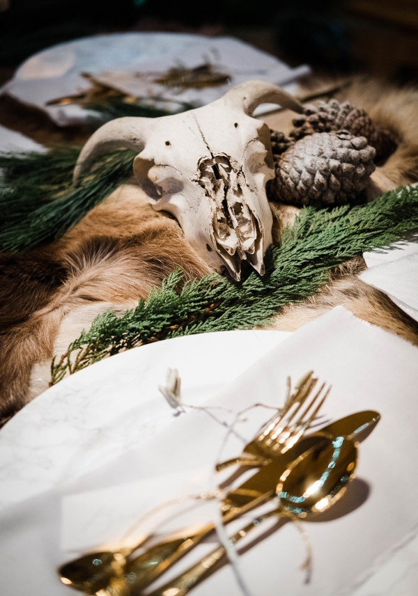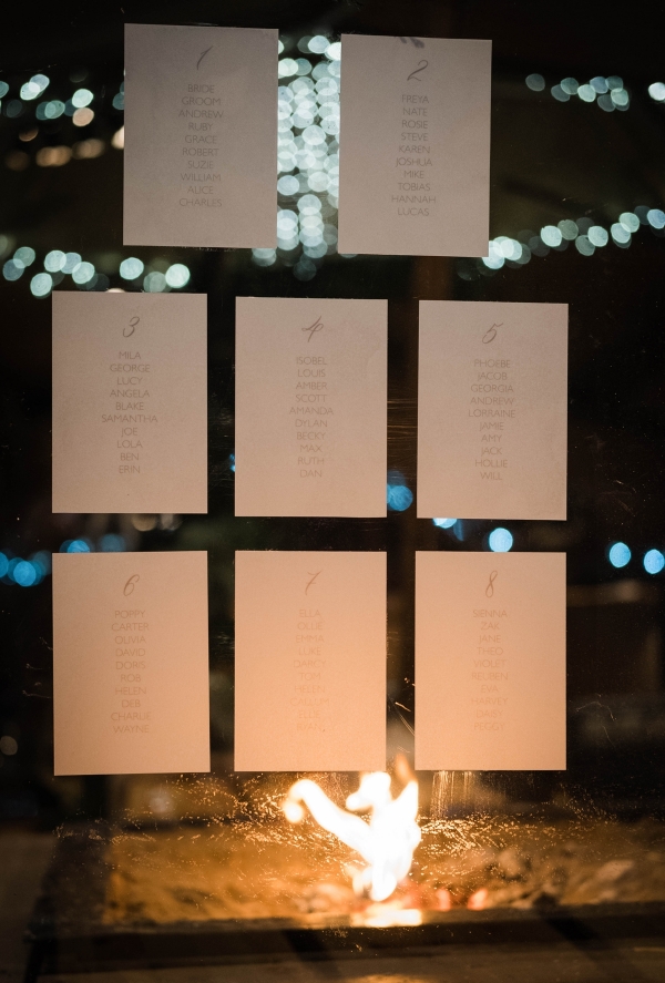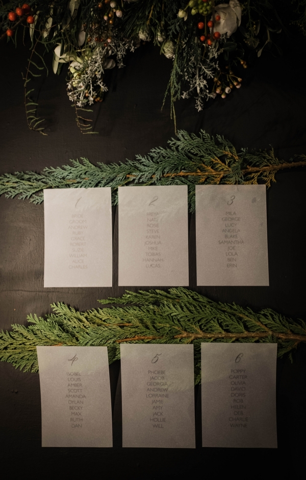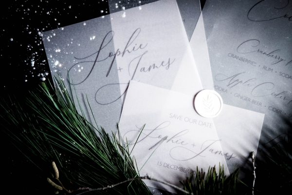 Embracing the minimal elements of the shoot, the opaque backgrounds of the stationery bring a barely-there feel along with a soft grey text juxtaposed against dark green foliage. "The midwinter vibe is carried through the shoot with added styling elements including reindeer pelts, blackened wooden boards for signage, and flickering candlelit lanterns," says Bridget.