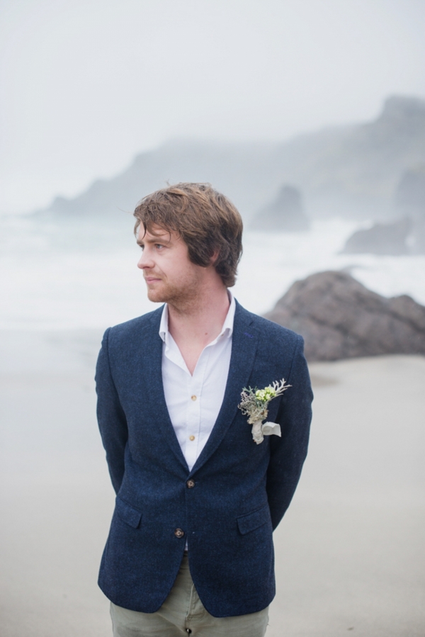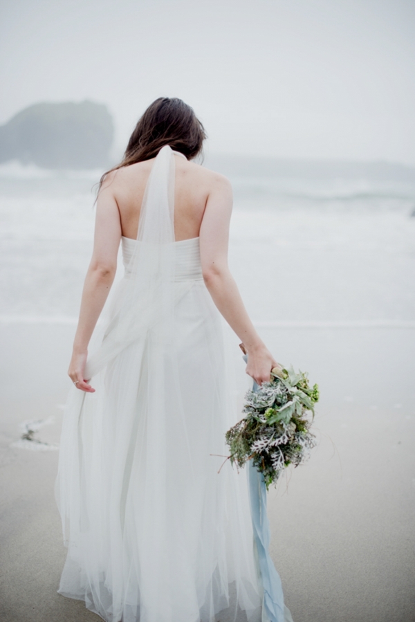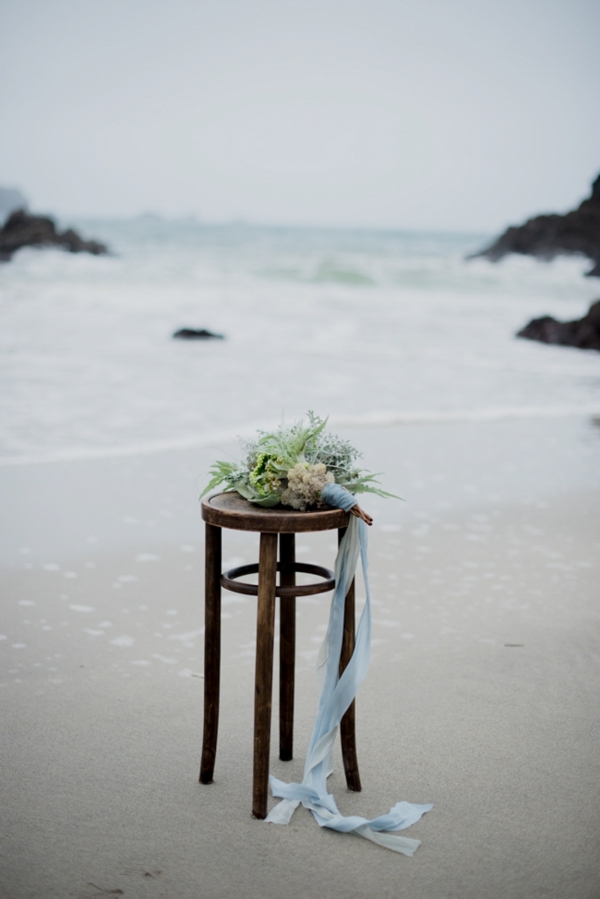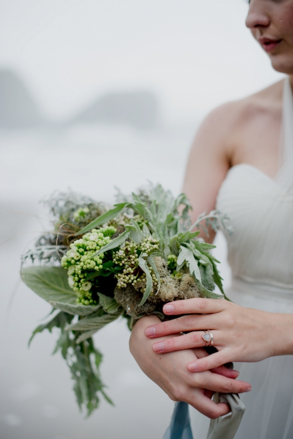 "Inspired by seaweed and other beach botanicals, the bouquet and boutonniere were composed of silvery greys and greens. Featuring lambs ear and lacy dusty miller."