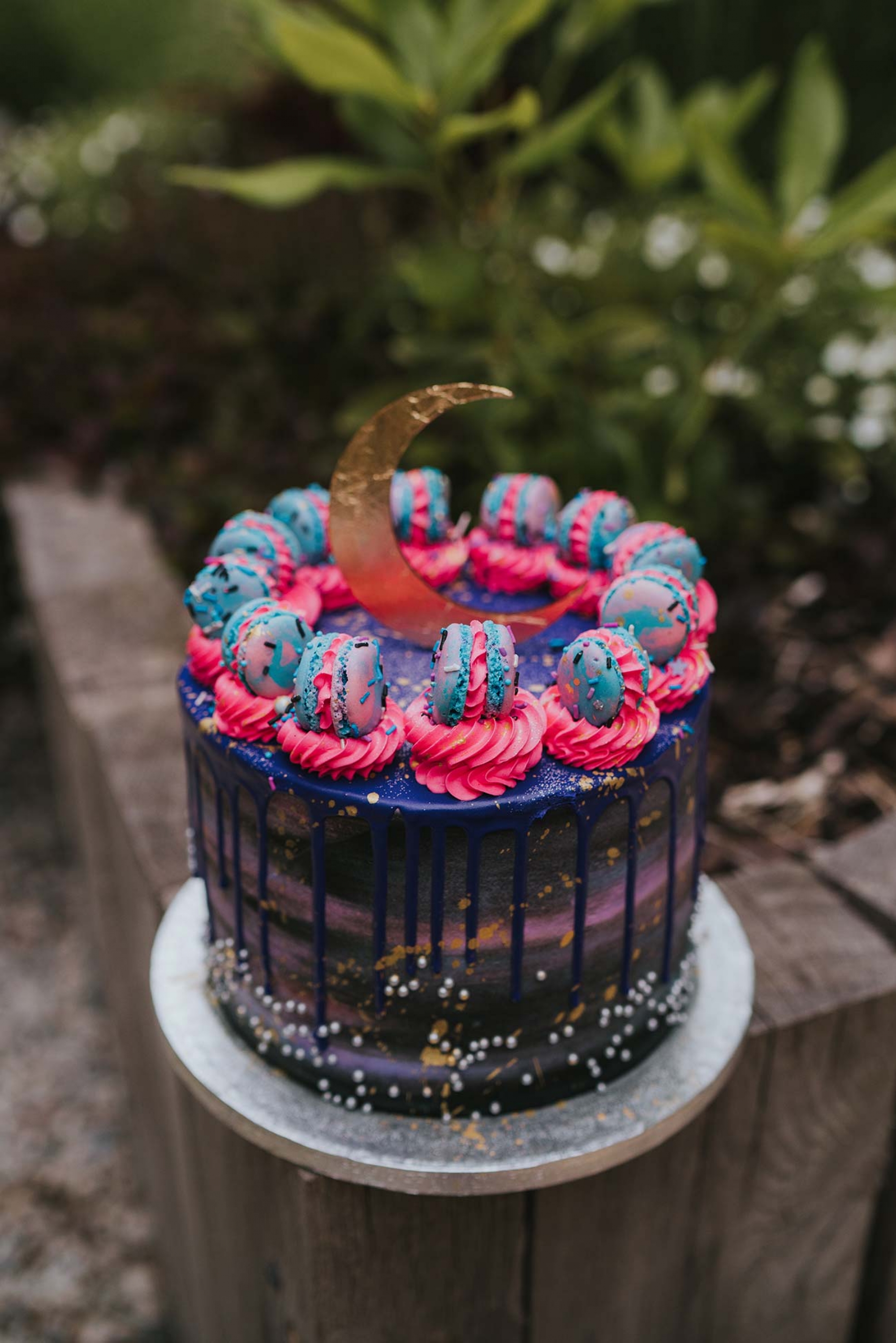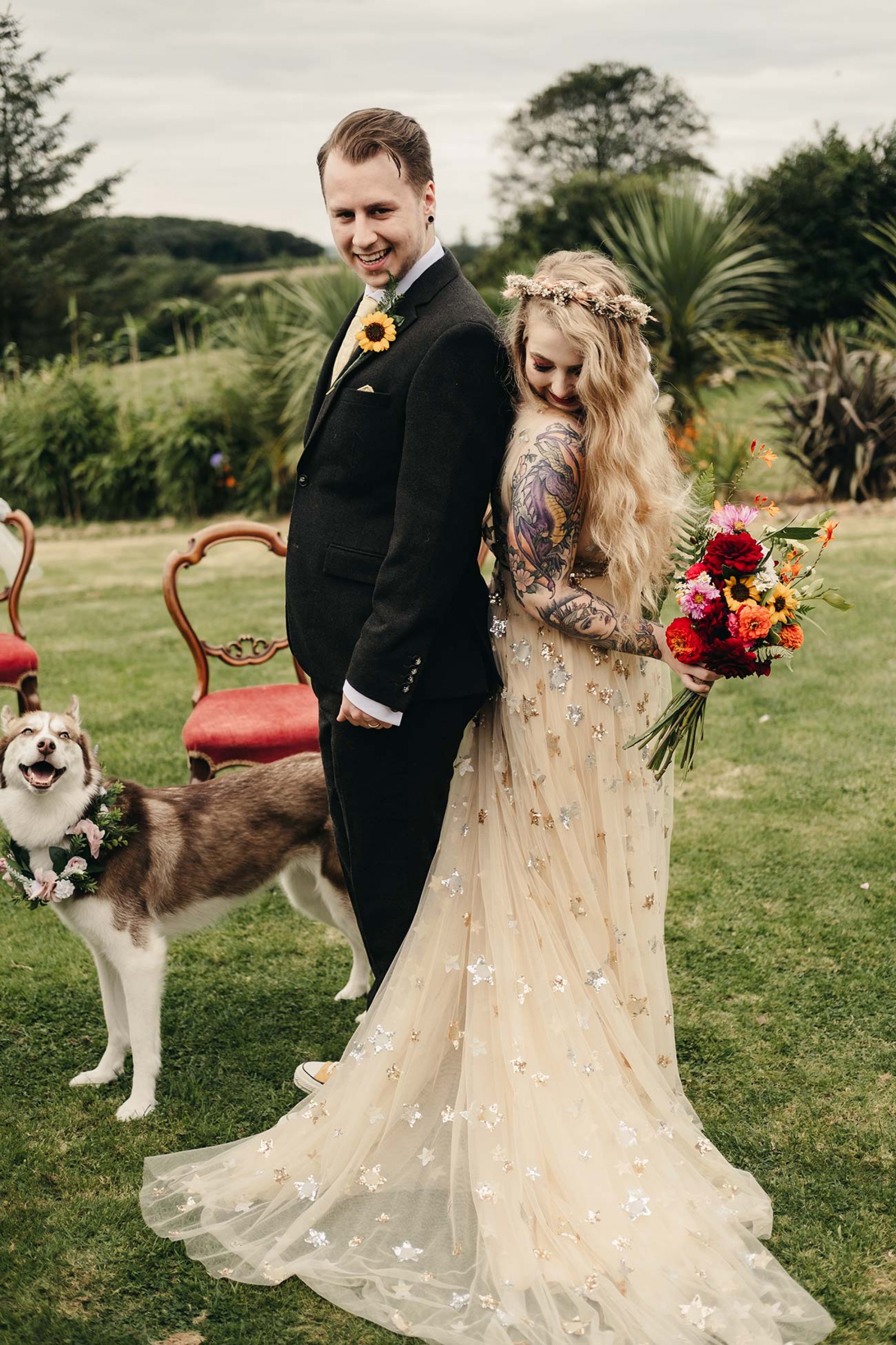 “I wore a dress by Needle and Thread, a crown by Amore Headwear, earrings by Vivienne Westwood and a bespoke leather jacket. Jon wore a tailored Moss Bros. suit with Gucci shoes and a Gucci belt. I carried an oversized bouquet from Flowers by Lucy – we just aligned in terms of vision. She also provided the roses for the offering, bows for my brother’s dogs and the dried flower buttonholes. The vegan cake from Flavourtown Bakery was spectacular – perfectly in line with our celestial theme.”