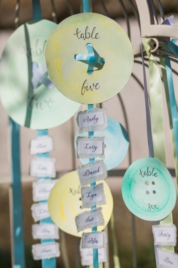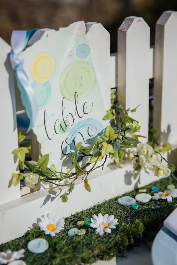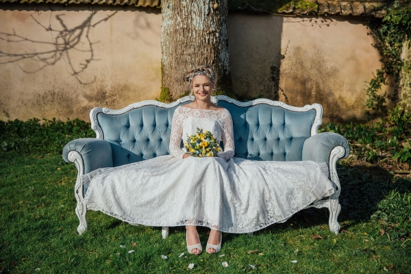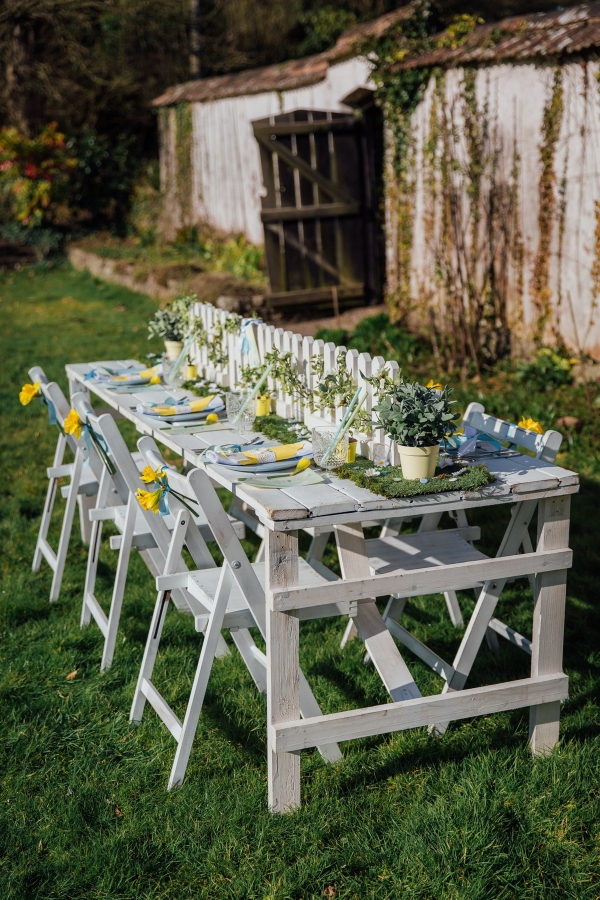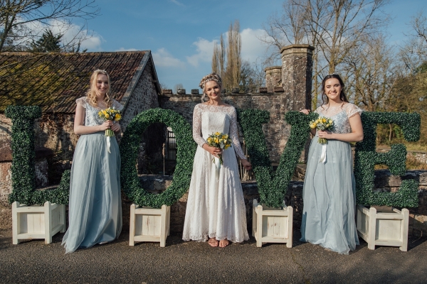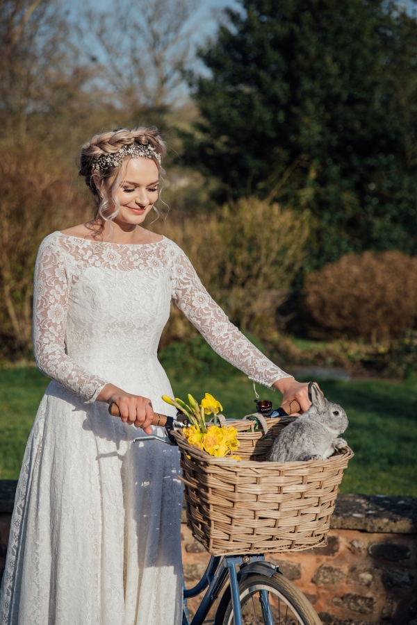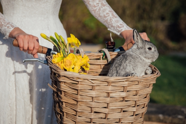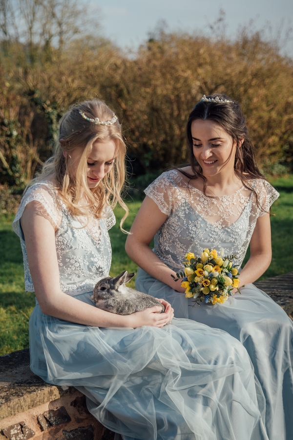 Beyond the pretty palette, the beauty of a spring wedding lies in details such as buttons, daisies and daffodils in full bloom, and even sweet grey bunnies. Alongside the bridal make-up, focusing on soft smoky eyes and muted lips, the loose braided updo and a delicate headpiece, the vintage lace of the bridal gown and gentle tulle of the bridesmaids' dresses allow the natural prettiness and fresh background colours to shine through, setting the scene for the most gorgeous garden party wedding.