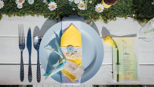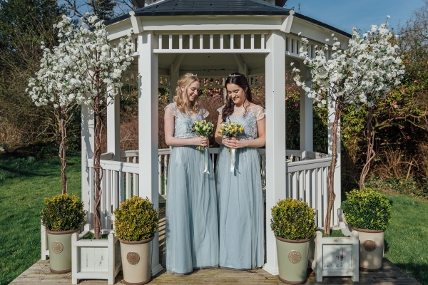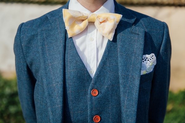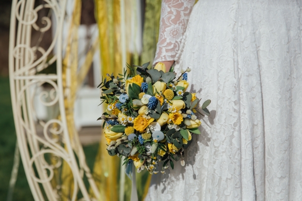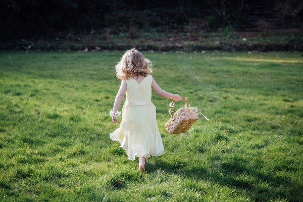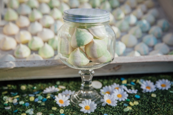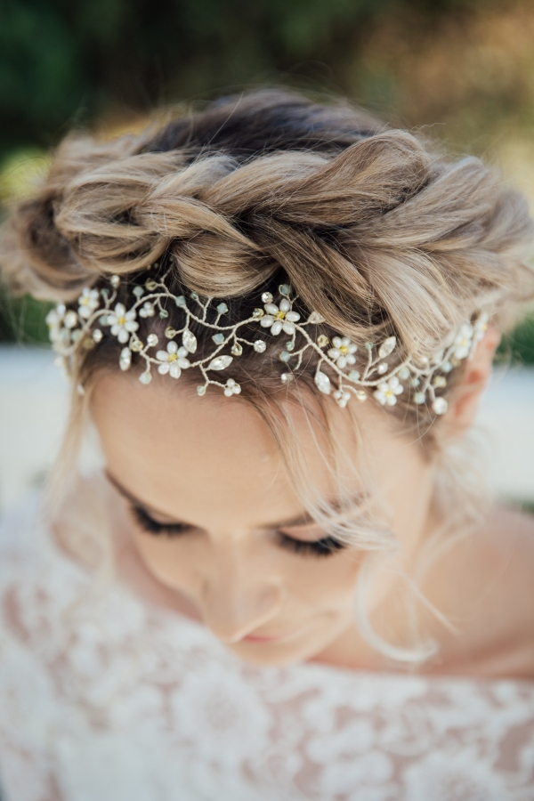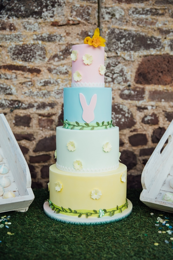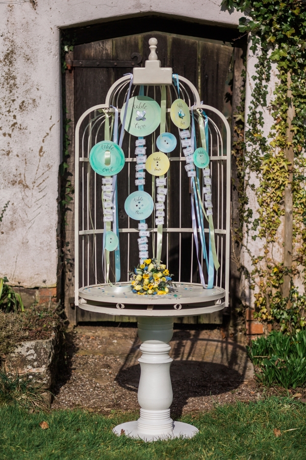 Beyond the pretty palette, the beauty of a spring wedding lies in details such as buttons, daisies and daffodils in full bloom, and even sweet grey bunnies. Alongside the bridal make-up, focusing on soft smoky eyes and muted lips, the loose braided updo and a delicate headpiece, the vintage lace of the bridal gown and gentle tulle of the bridesmaids' dresses allow the natural prettiness and fresh background colours to shine through, setting the scene for the most gorgeous garden party wedding.