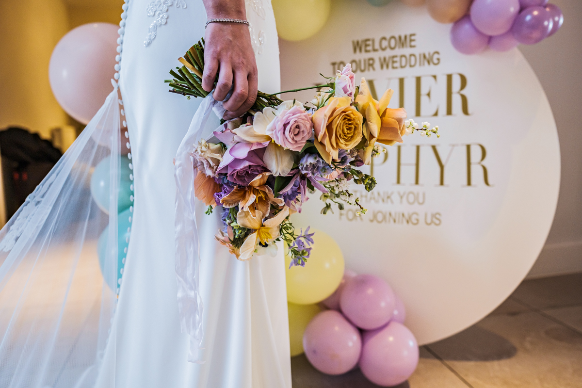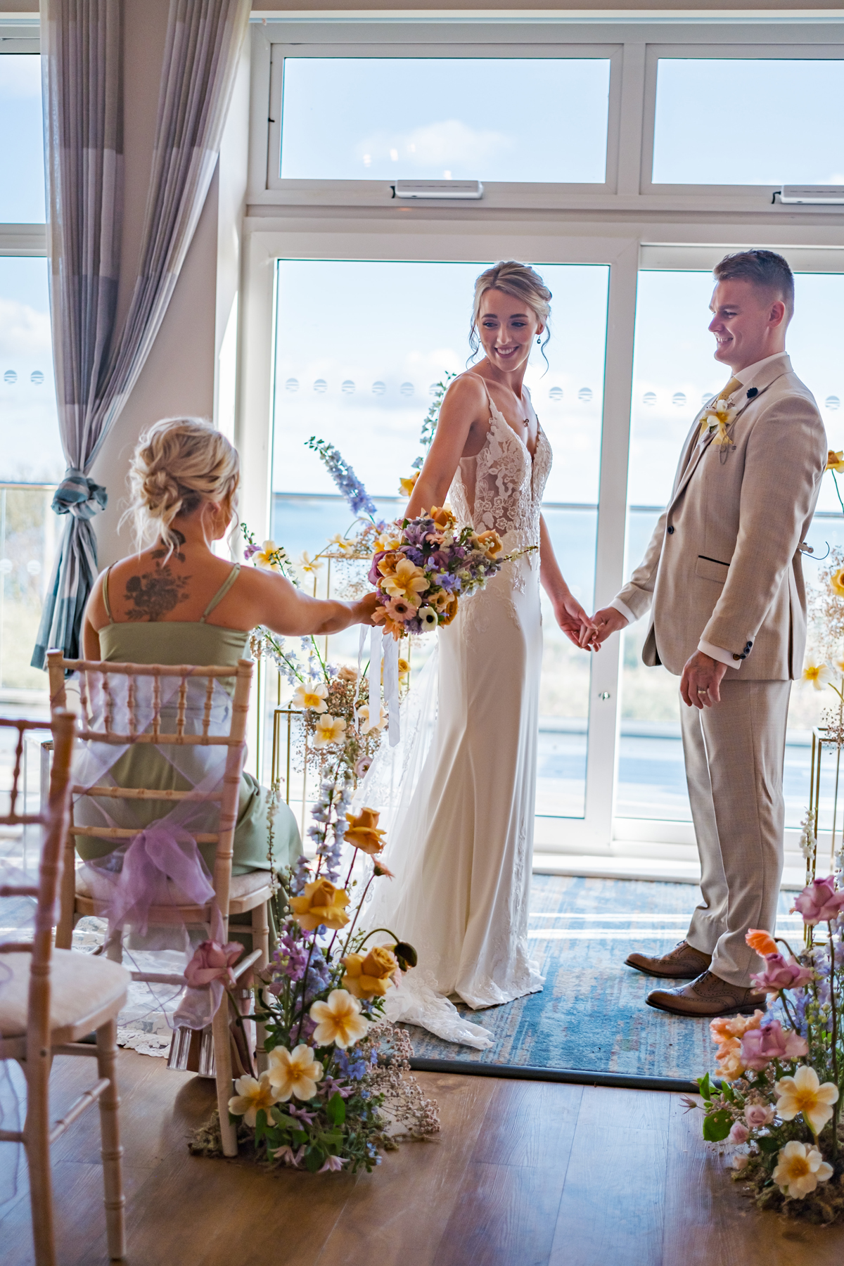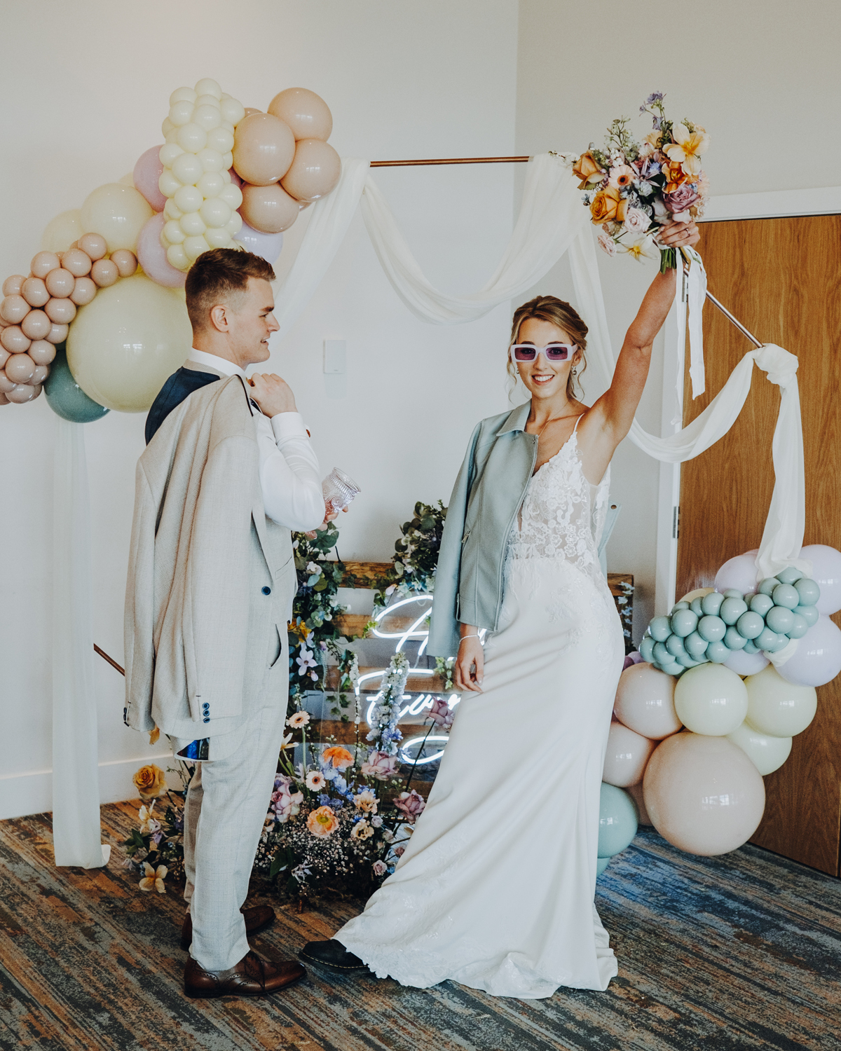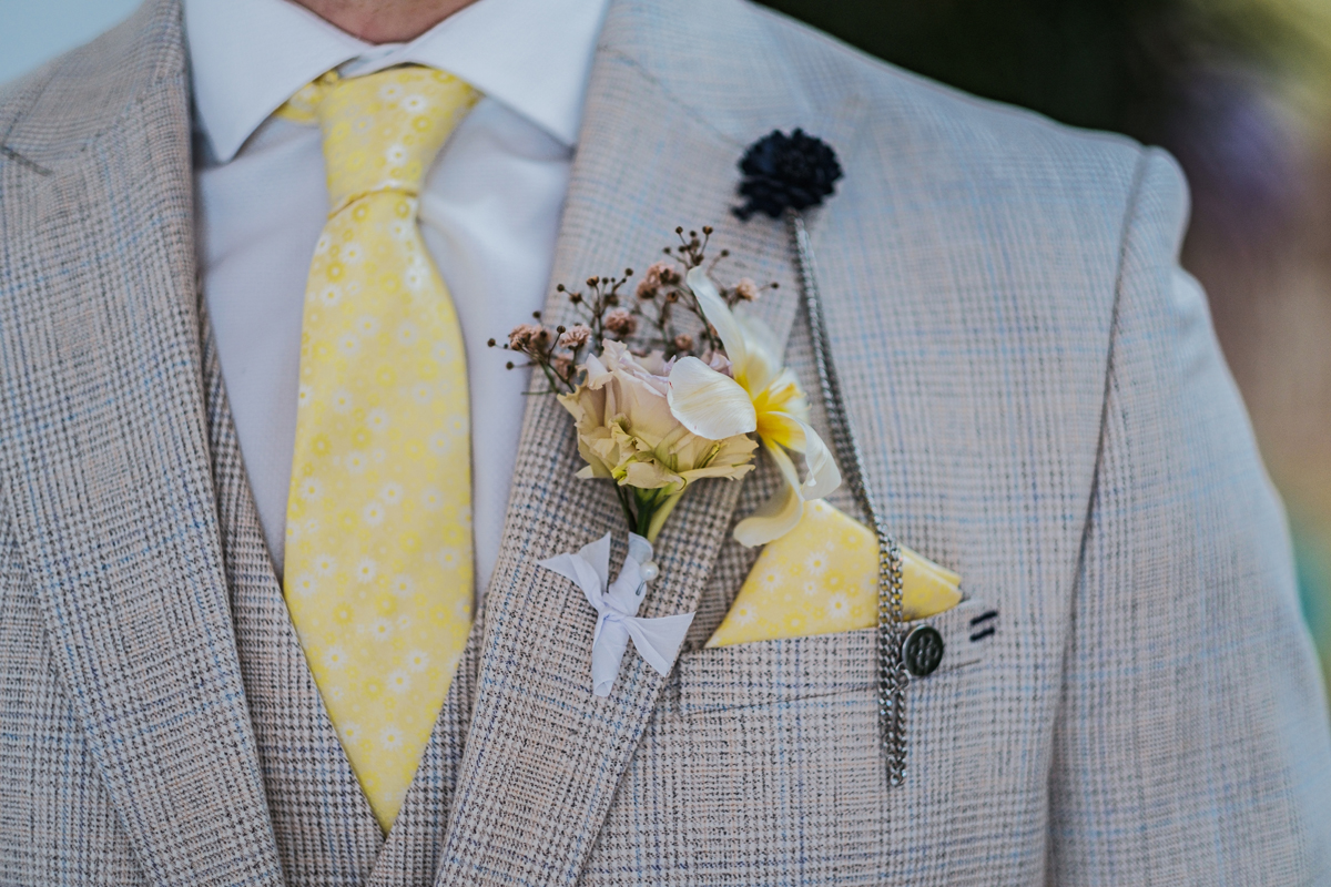 From the fun welcome sign adorned with pastel coloured balloons to the light-filled ceremony room bedecked in a rainbow of beautiful blooms and the centrepiece cake strewn with petals, every aspect combines to ensure a vibrant and sensorial look. The bride's exquisite low-backed gown features floral embellishment to epitomise the season, while the groom's sand coloured three-piece suit and sun-yellow accessories strike the perfect stylistic chord.