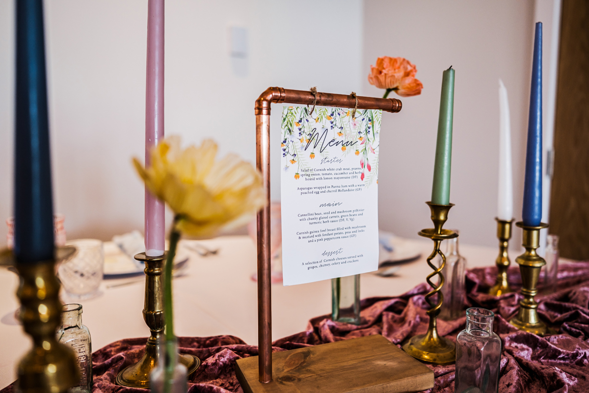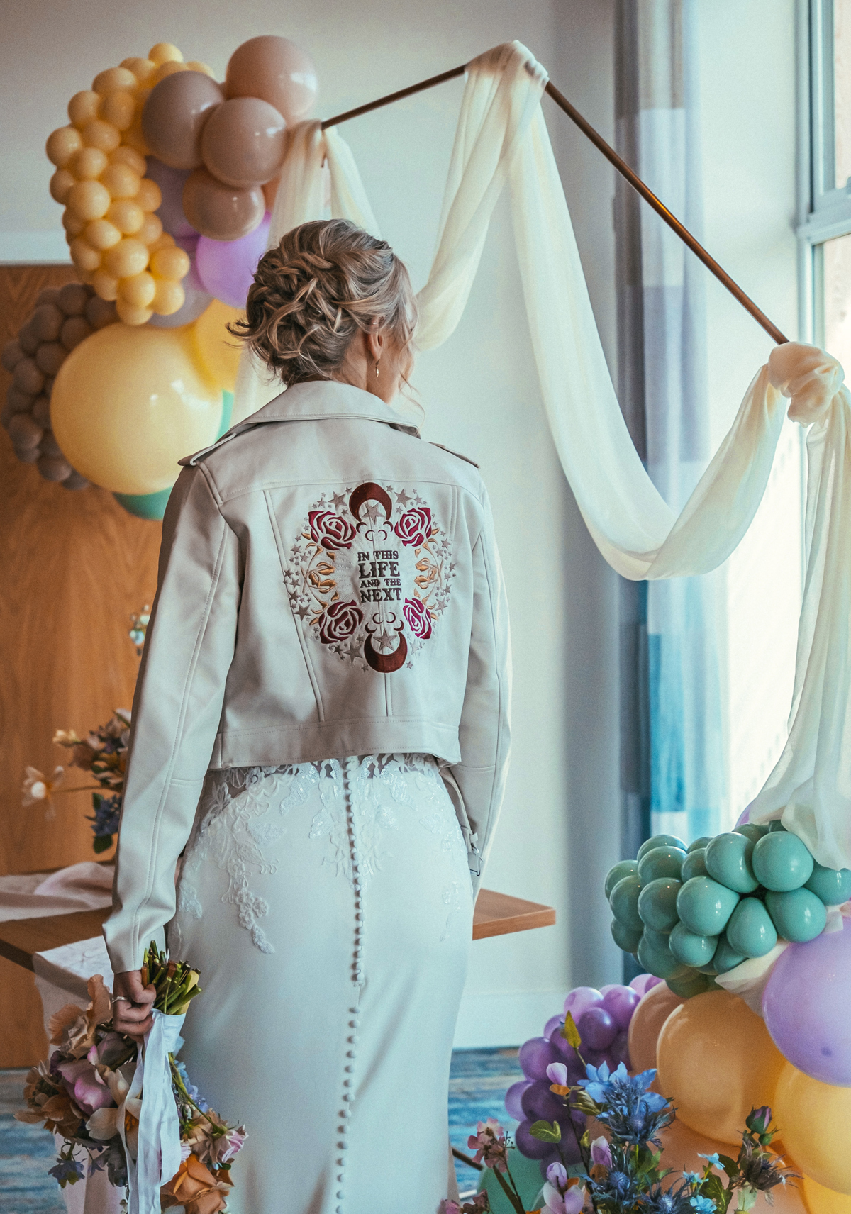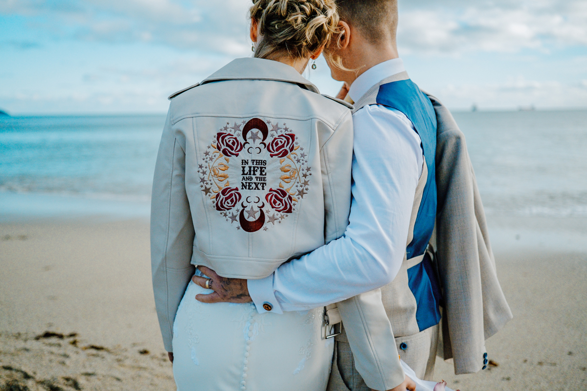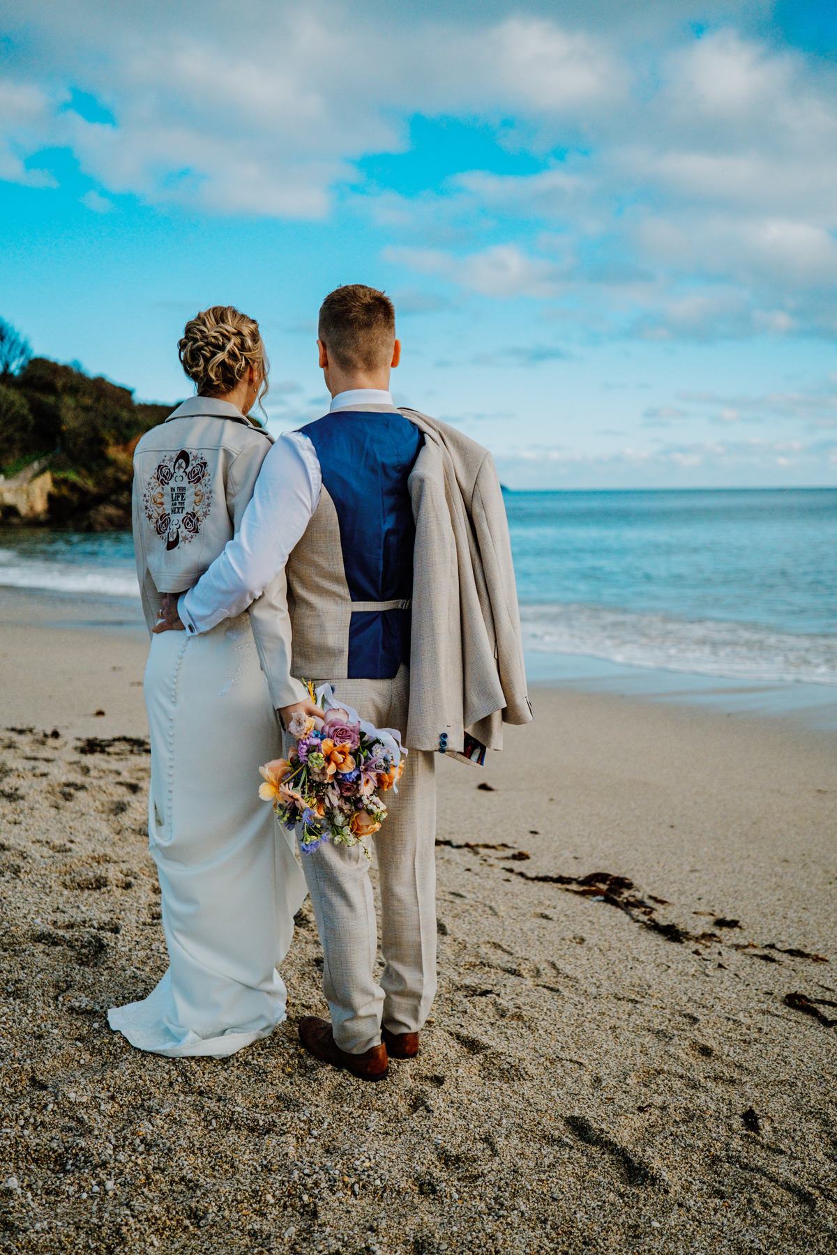Vows uttered, and the reception presents an enticing mix of decadence and spring-like dazzle via colourful glassware and candles alongside velvet runners, marbled charger plates and stunning single stem buds. Then comes the chance to escape for sand-between-the-toes photos as the sun begins to dip beneath the ocean, an embroidered leather bridal jacket providing the coolest cover up while the couple take a moment to their newly-wedded selves.