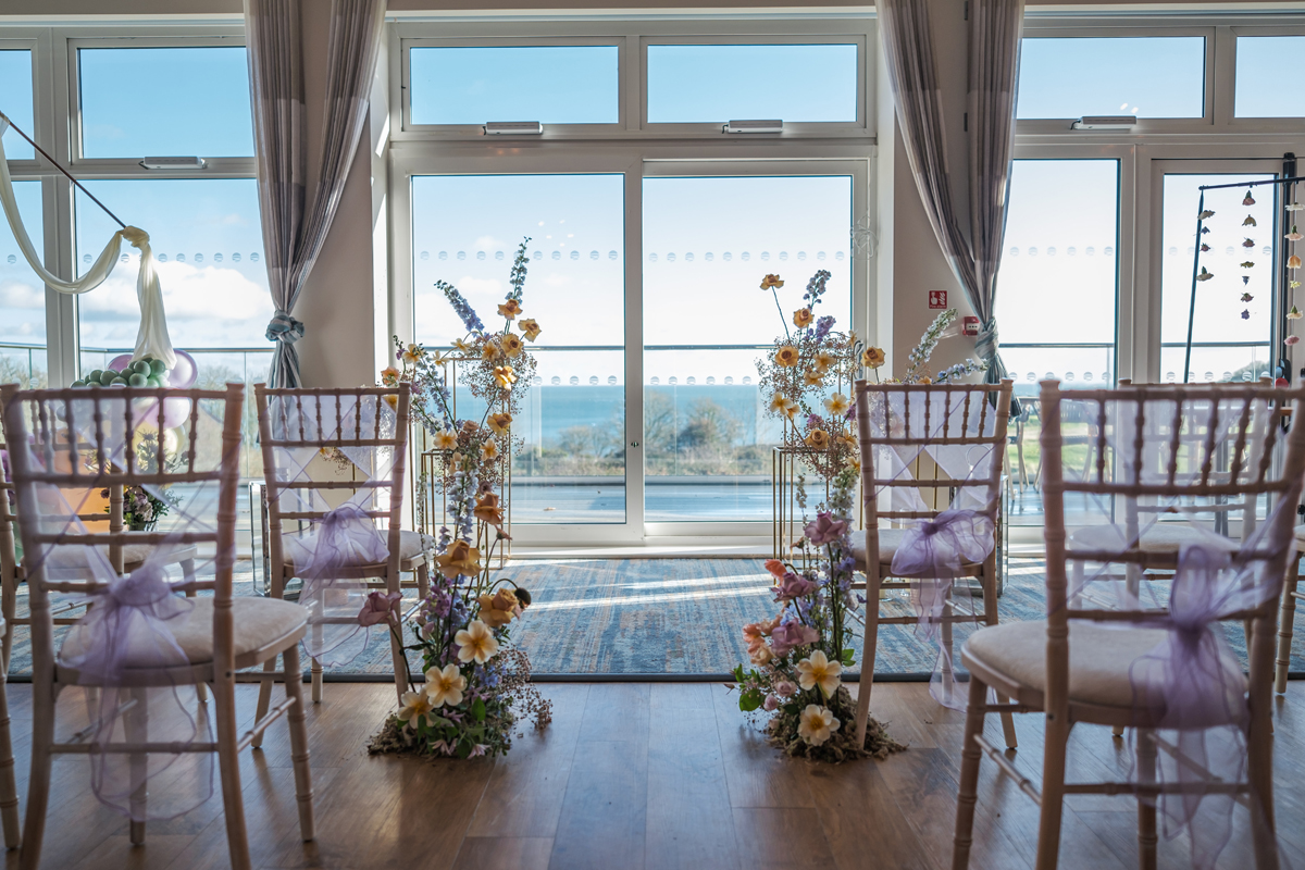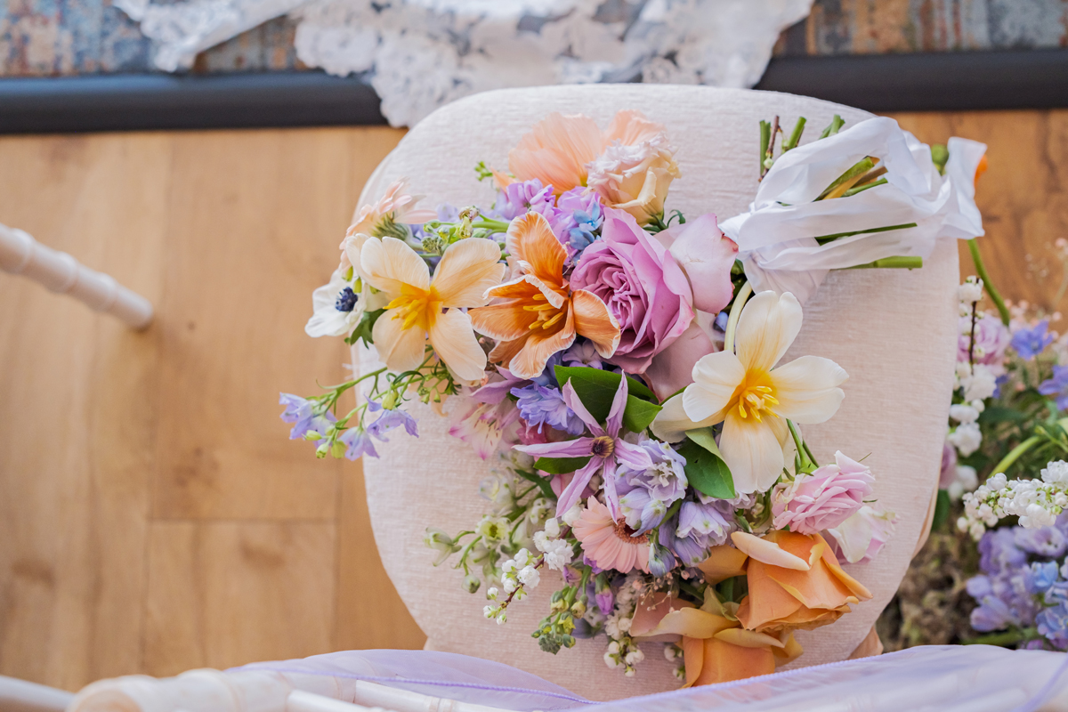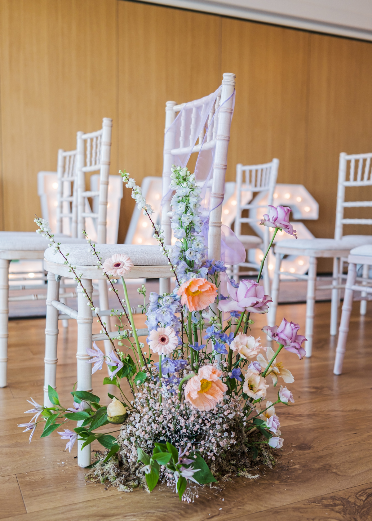 Using the floristry as a key expression of the colour scheme and overarching aesthetic, the tones were picked to not only spruce up the space and reflect the outdoors, but also to help establish the interior look and prevailing vibe. "The flowers were very seasonal and gave the room a new sense of life!" explains Megan. "The colour lilac symbolizes happiness and tranquillity, and yellow symbolizes optimism, energy, joy, happiness and friendship - and that's what we hope this shoot reflects!"
